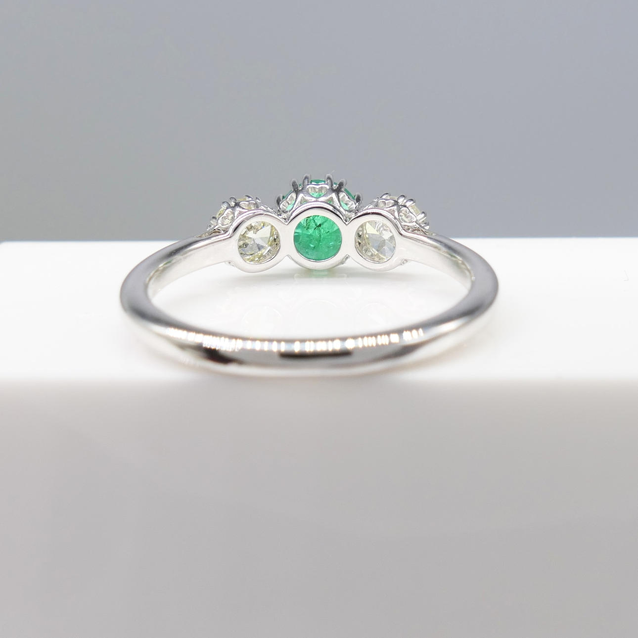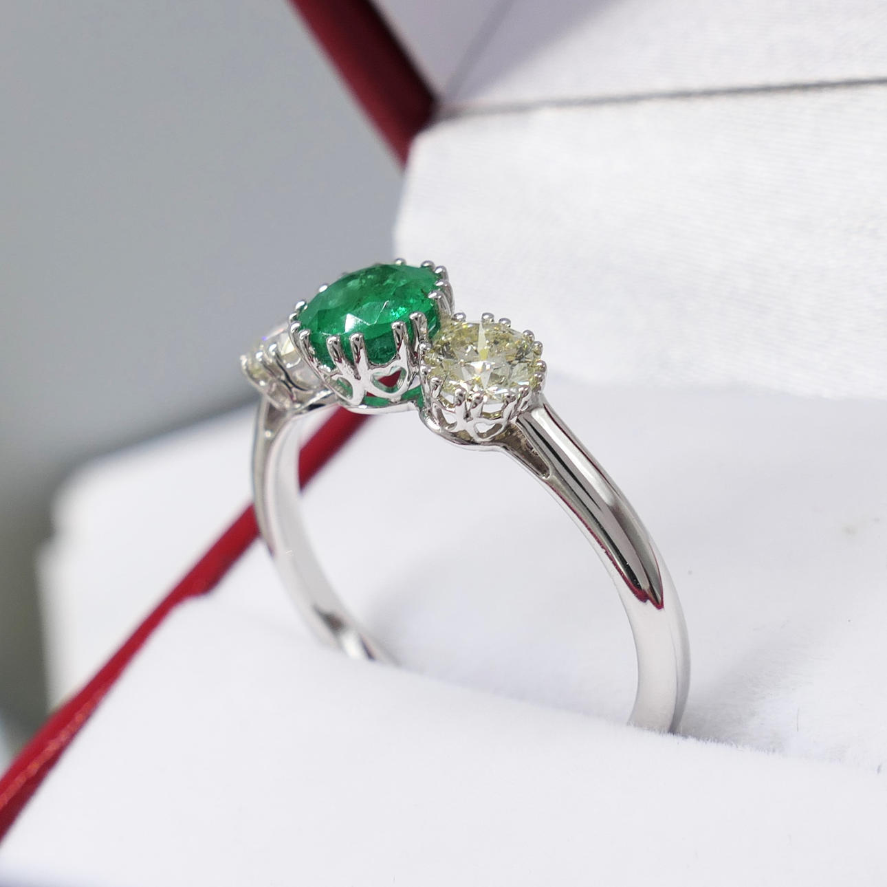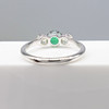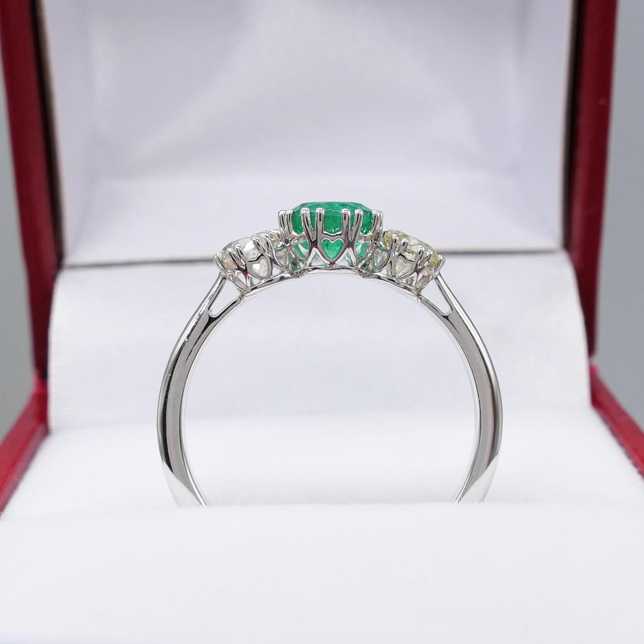 An 18k white gold 3-stone ring set with an emerald and two flanking diamonds, with gift box