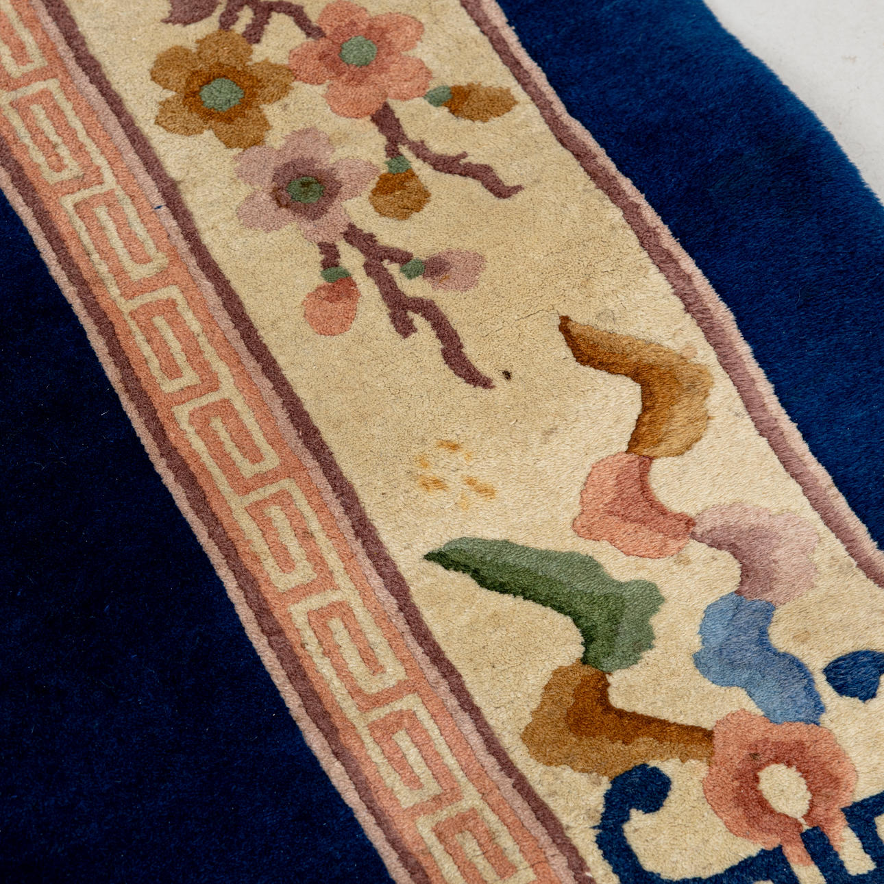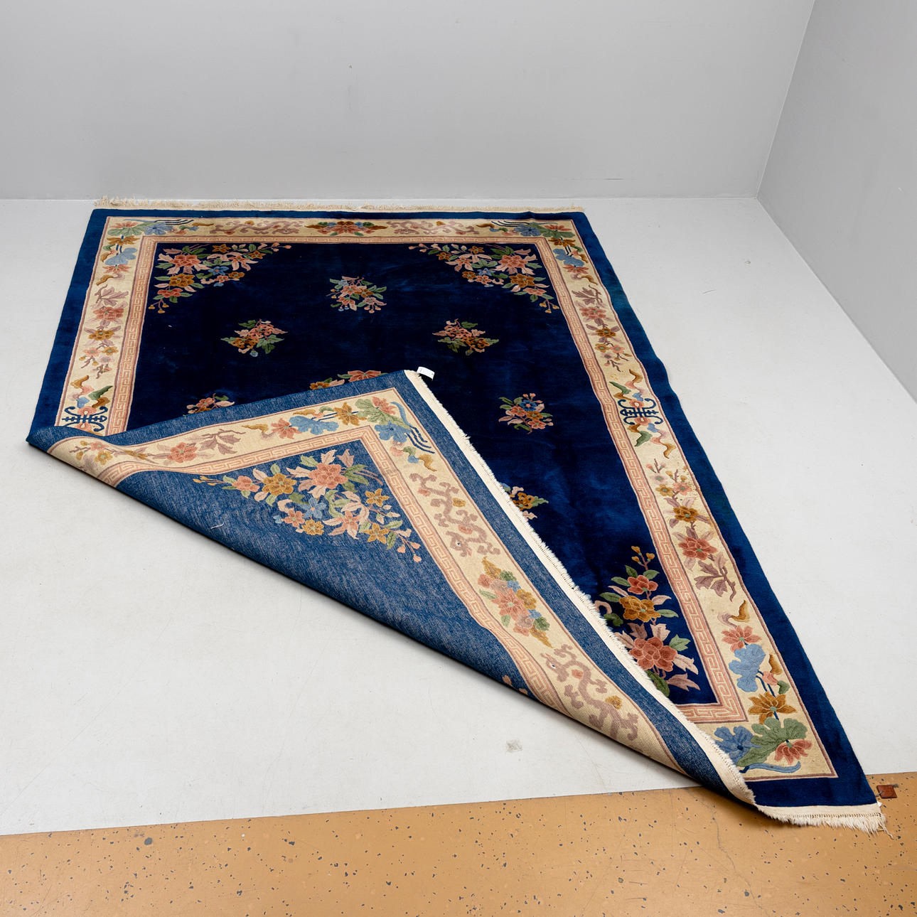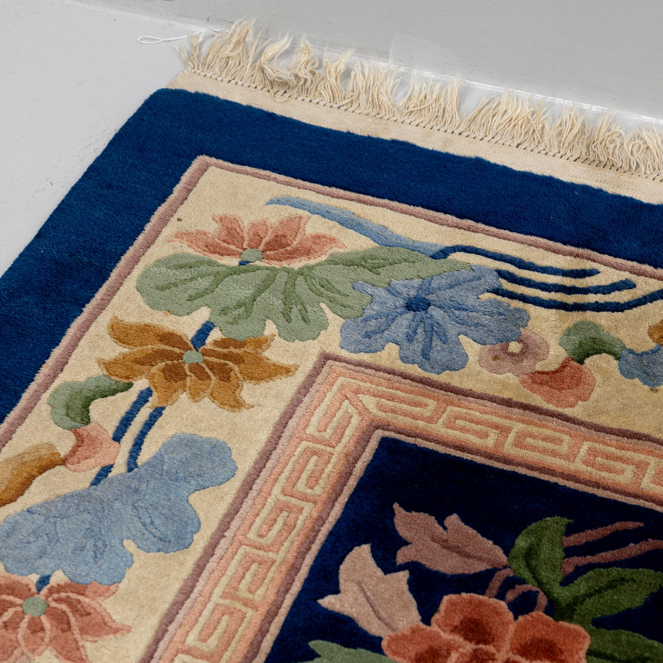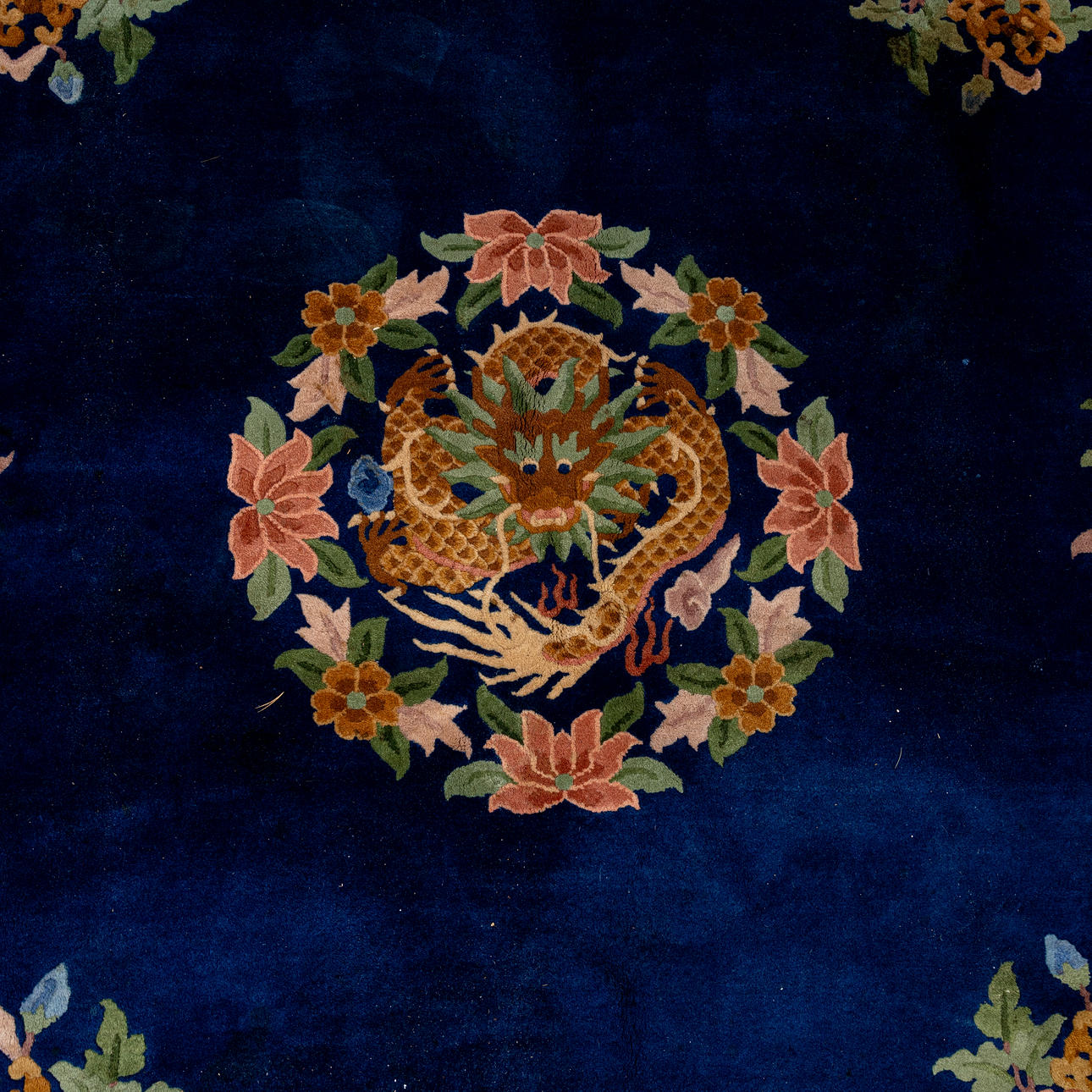 Dark blue base with polychrome floral pattern medallion with dragon, corner ornaments, beige border with polychrome floral pattern and dragons, approx. 370x272 cm.