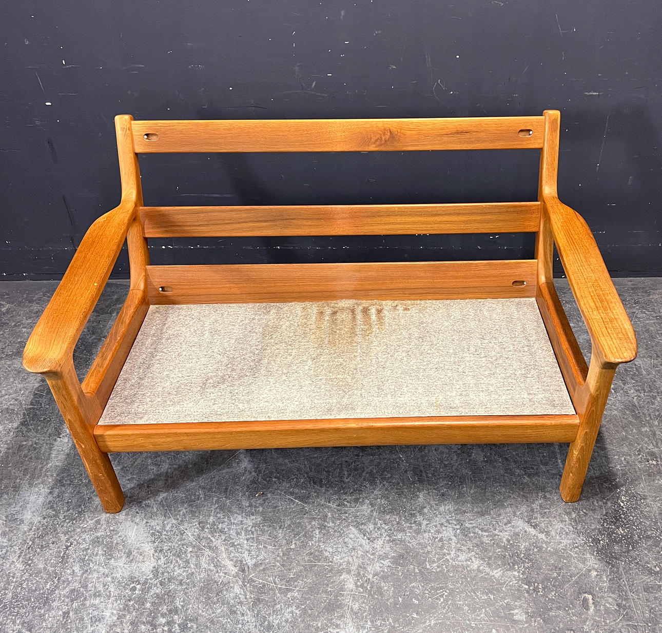 Solid teak frame, cushions with textile cover and spring padding. Removable covers