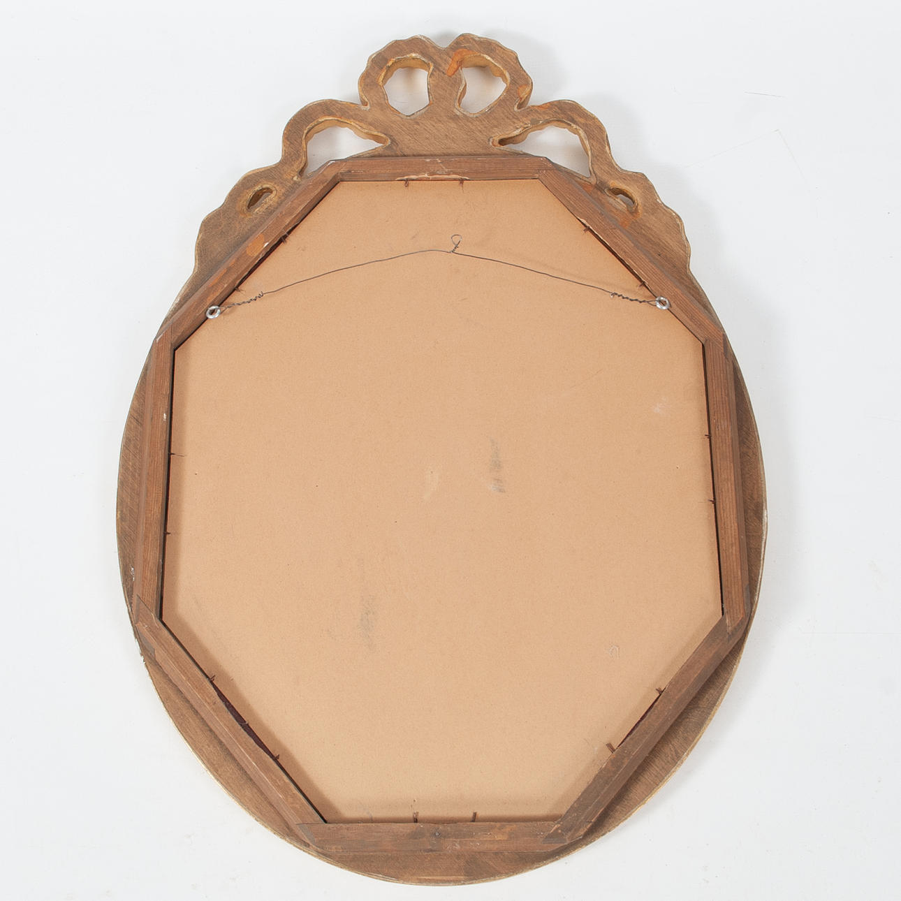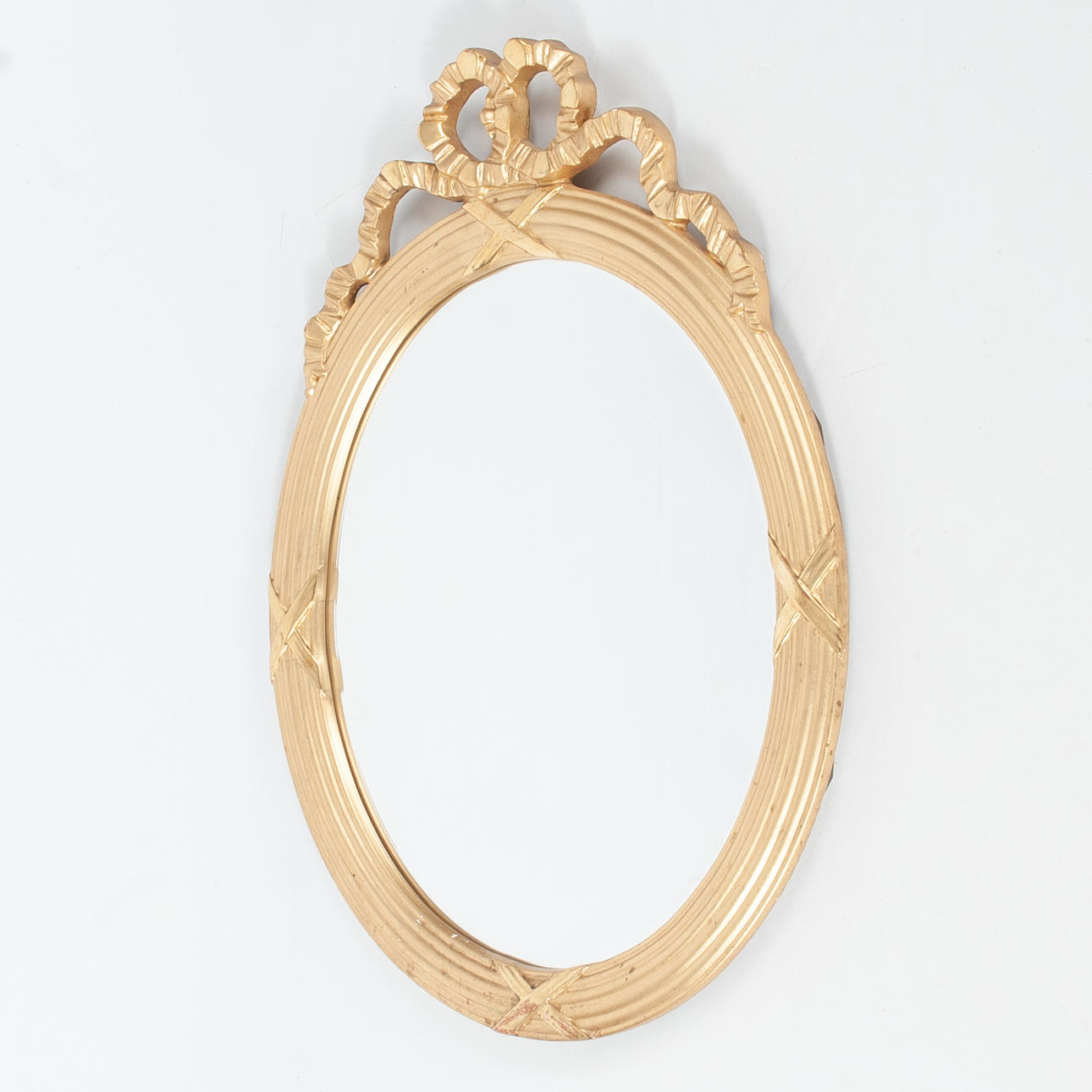 Oval mirror with gilded frame and decor in the form of band rosettes at the top. Grooved frame profile.