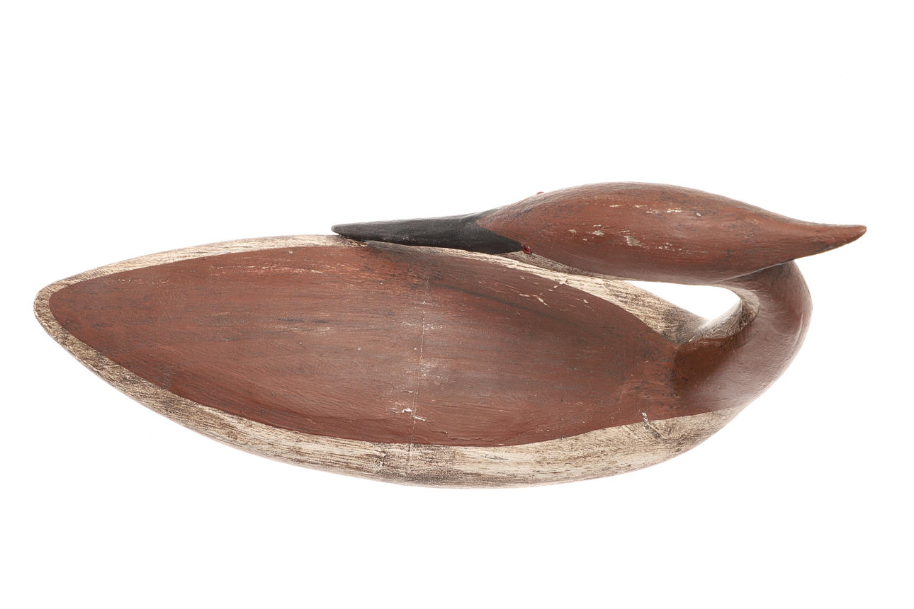 A carved and painted wooden figure of a Grebe, with it's neck turned towards it's body. Signed to the base, 'Guy Taplin, Grebe' 31cms long, 15.5cms high