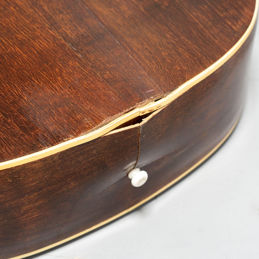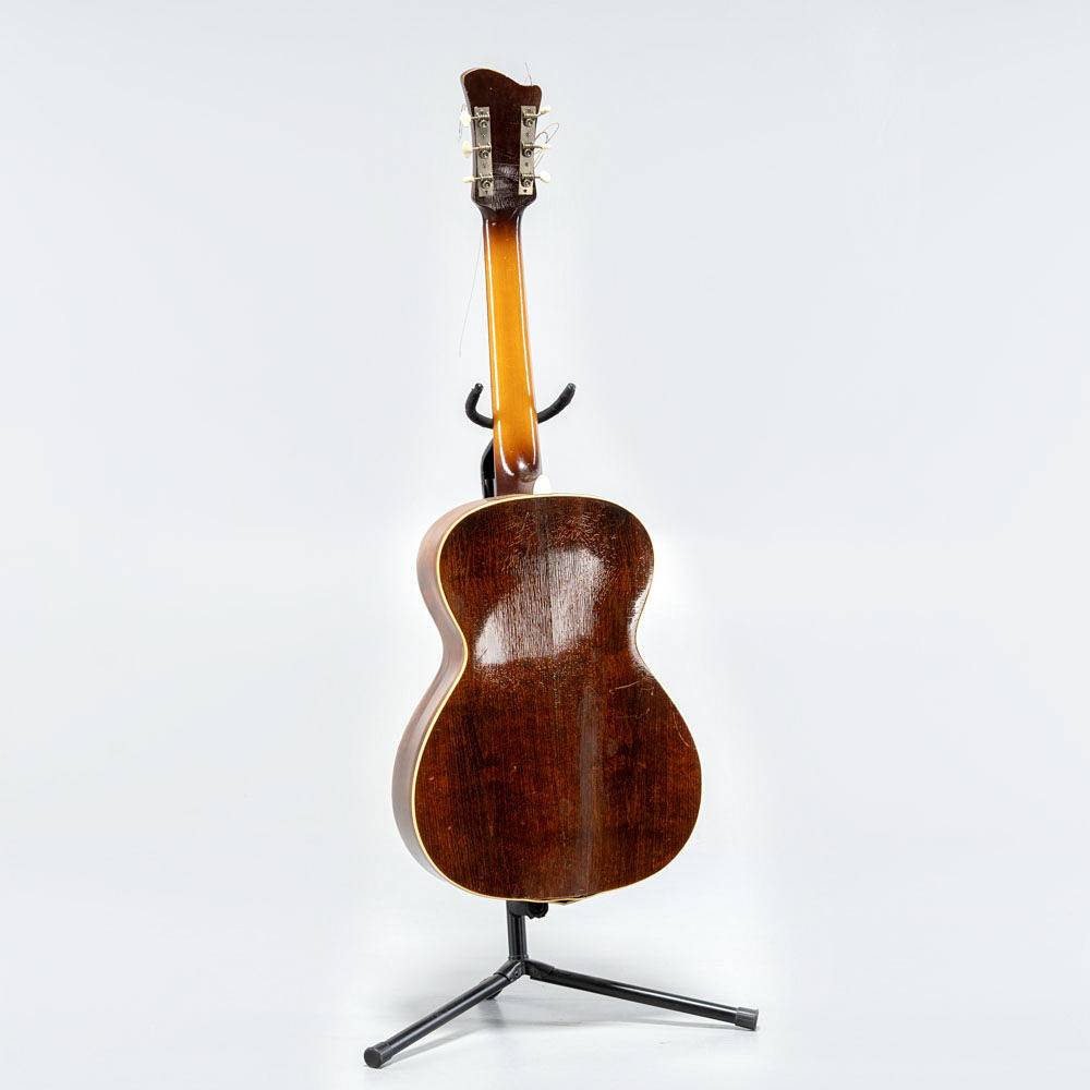 Worn, strings are missing, there is a hold in the rear part of the guitar. (see pictures).