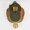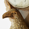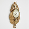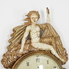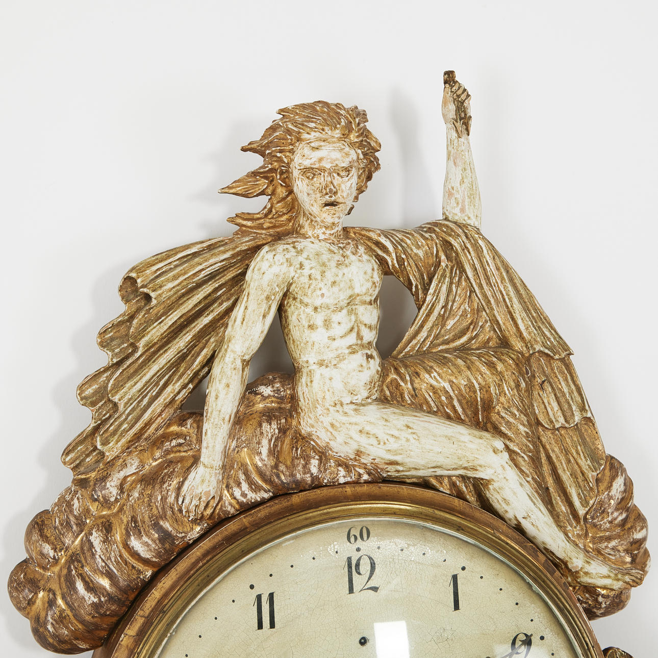 Carved wood decoration, exposed original gilding, enamelled dial with Arabic numerals, eagle with spread wings supporting the clock case, surmounted by a seated youth with arrows in hand, pendulum included, 86 x 46 cm.