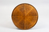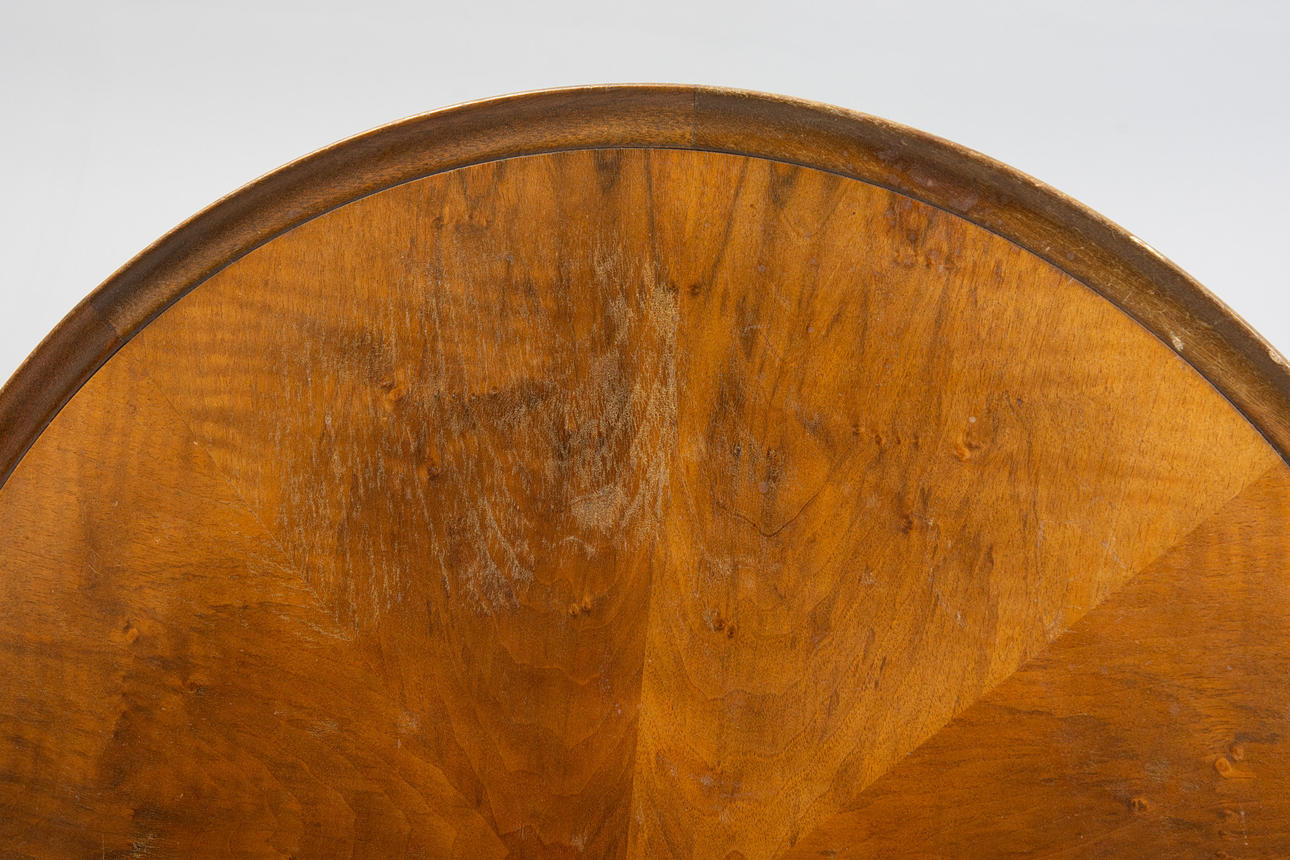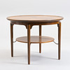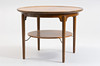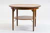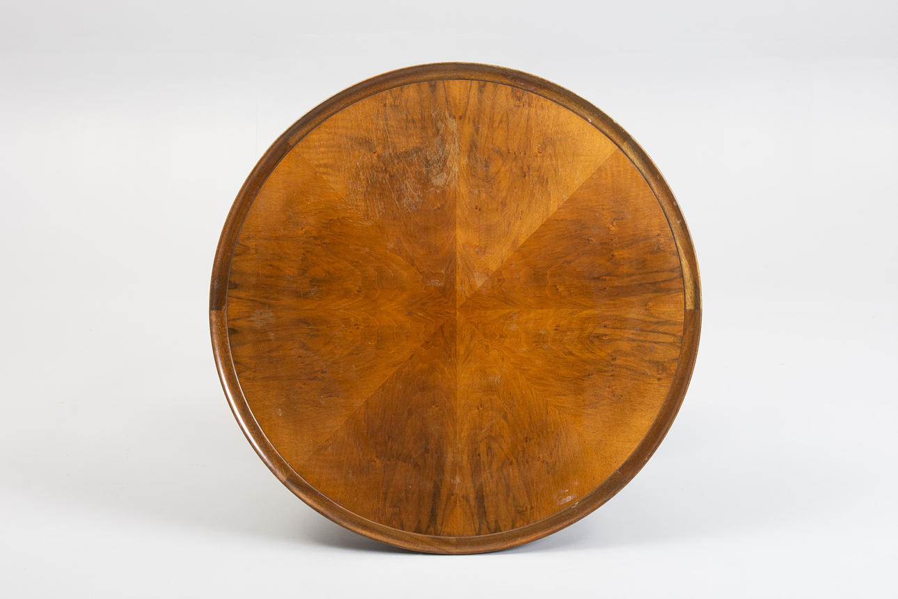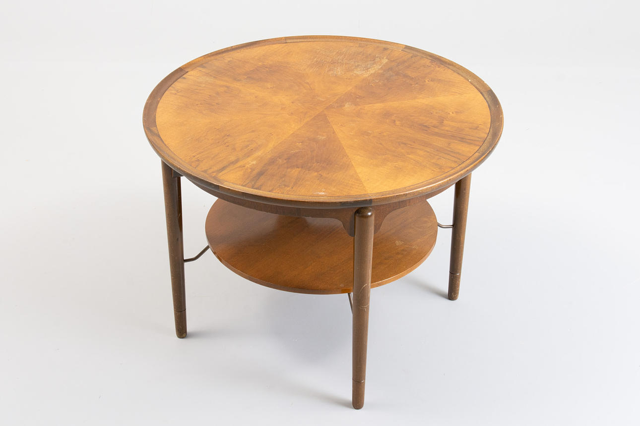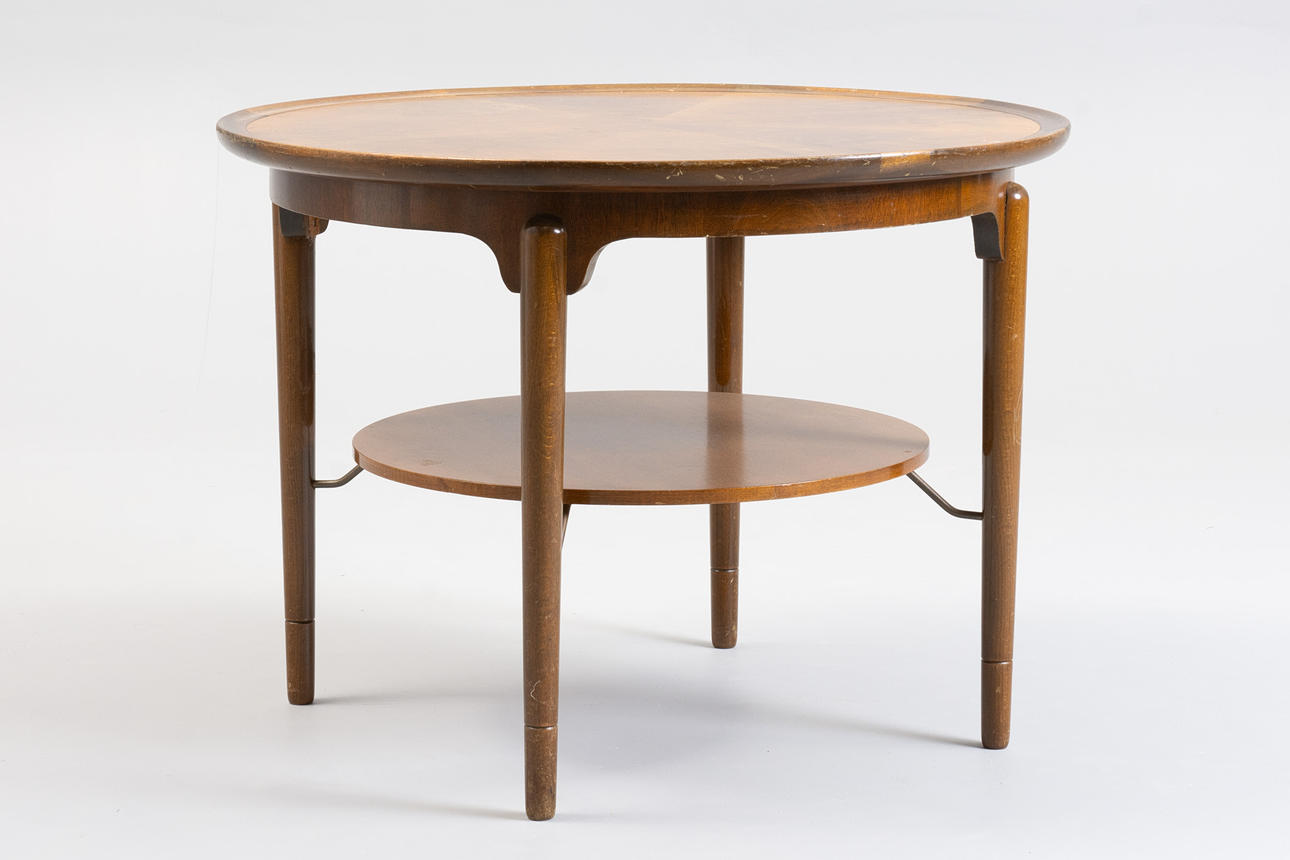 Danish master carpenter, round coffee table in mahogany and beech wood with shelf on brass struts, Denmark, mid 1900s.