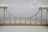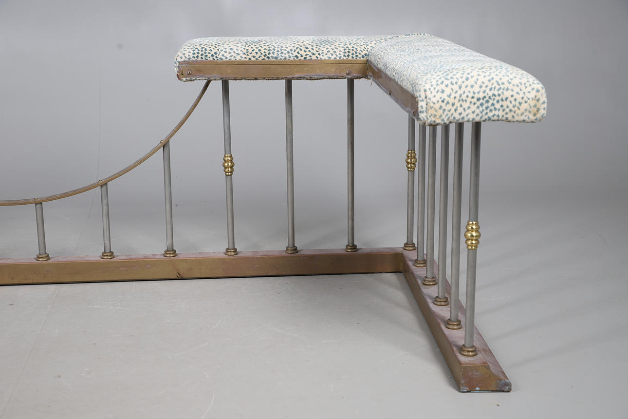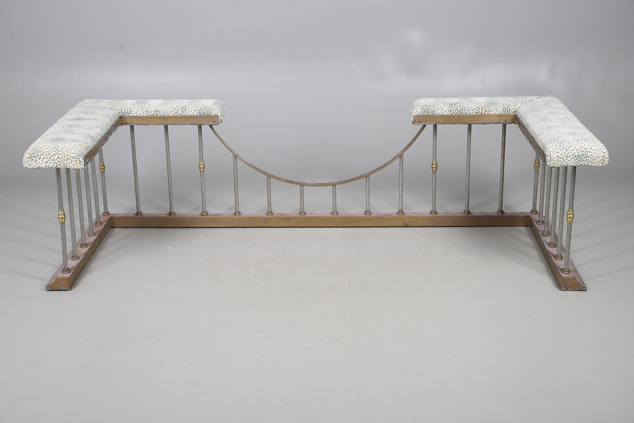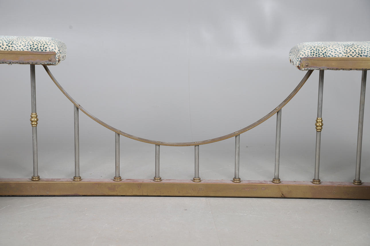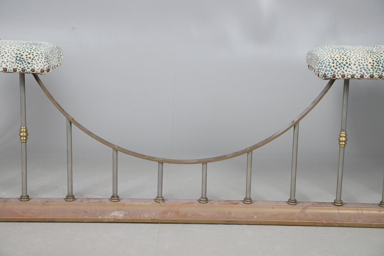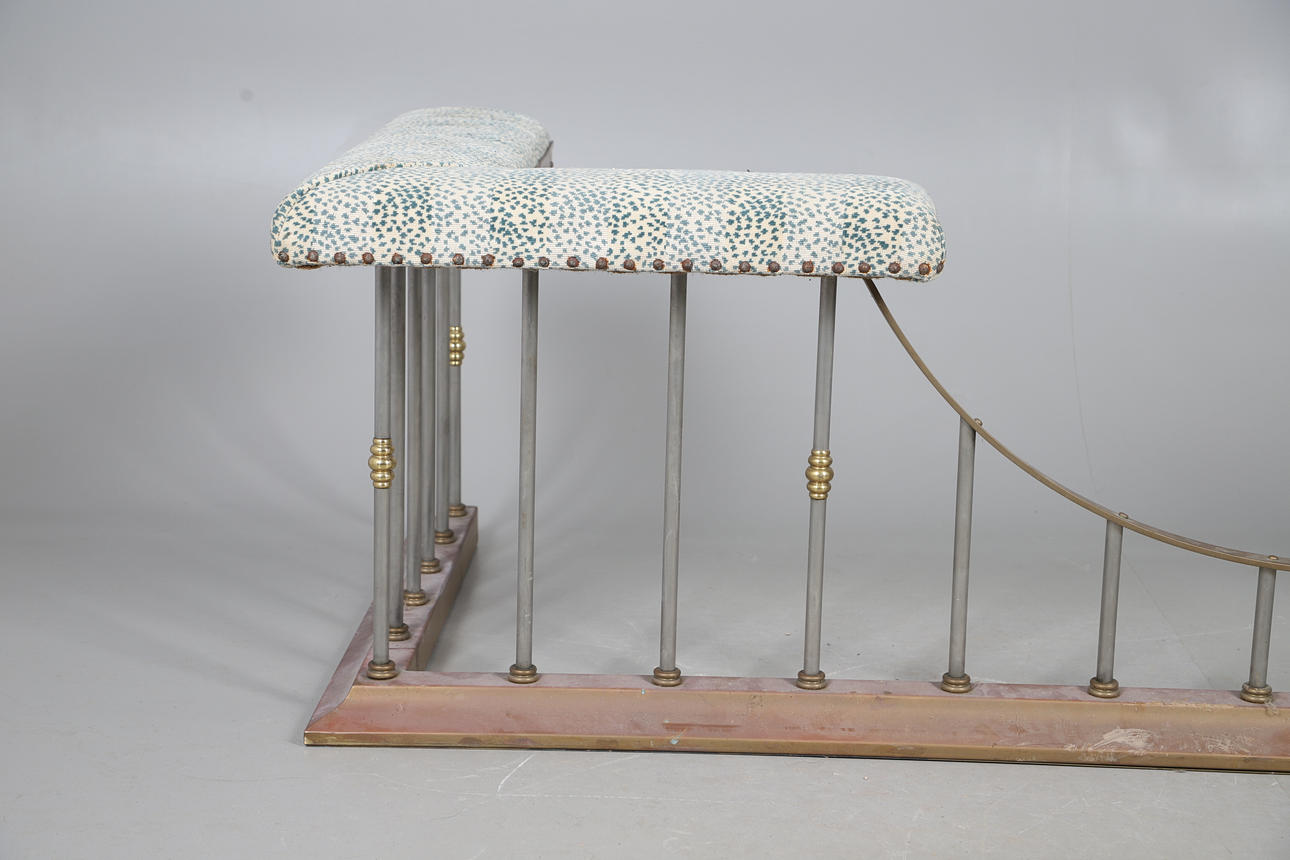 A large club fender, with a painted brass frame and upholstered seating with stud trimming. 56cm (h) x 206.5cm (w) x 86cm (d).