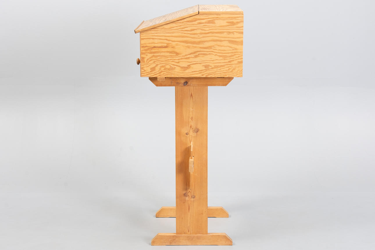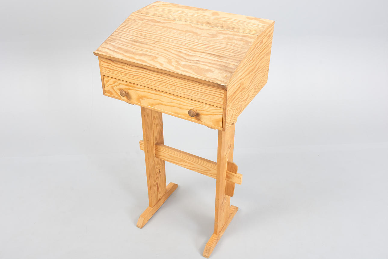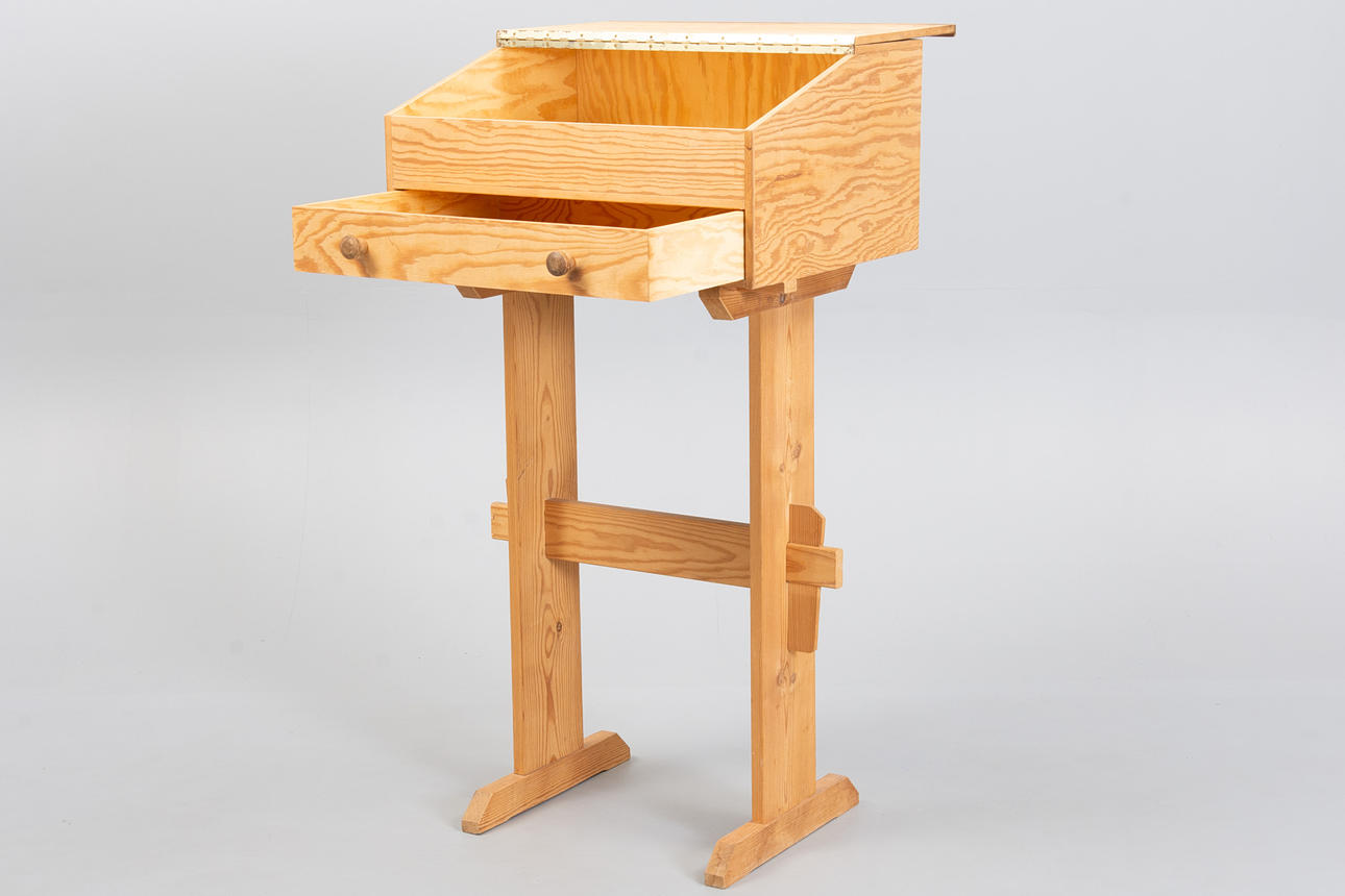 Writing desk in solid pine with a sloping top lid and drawer with round wooden handles.