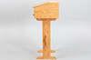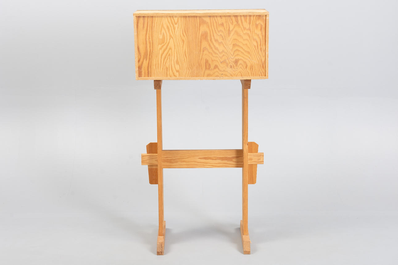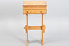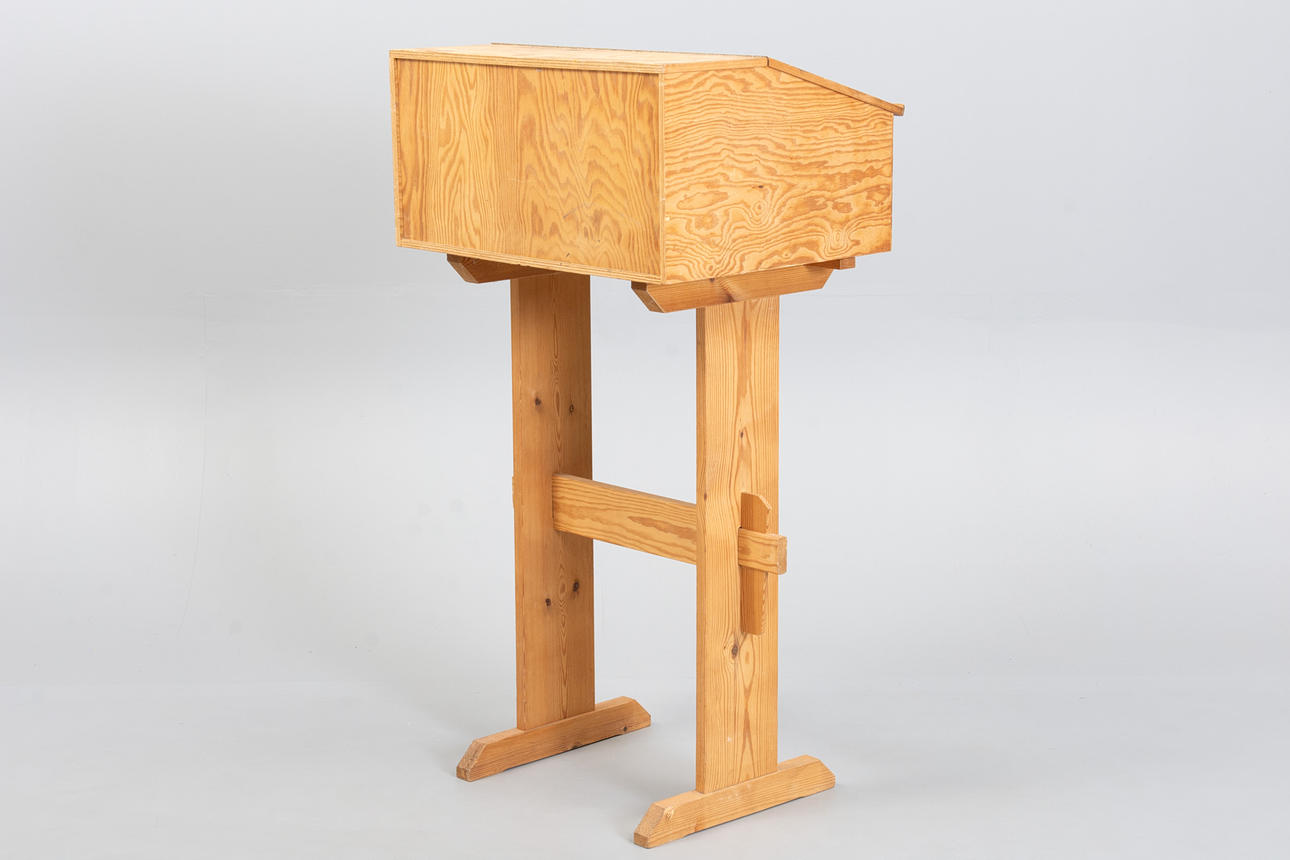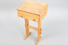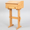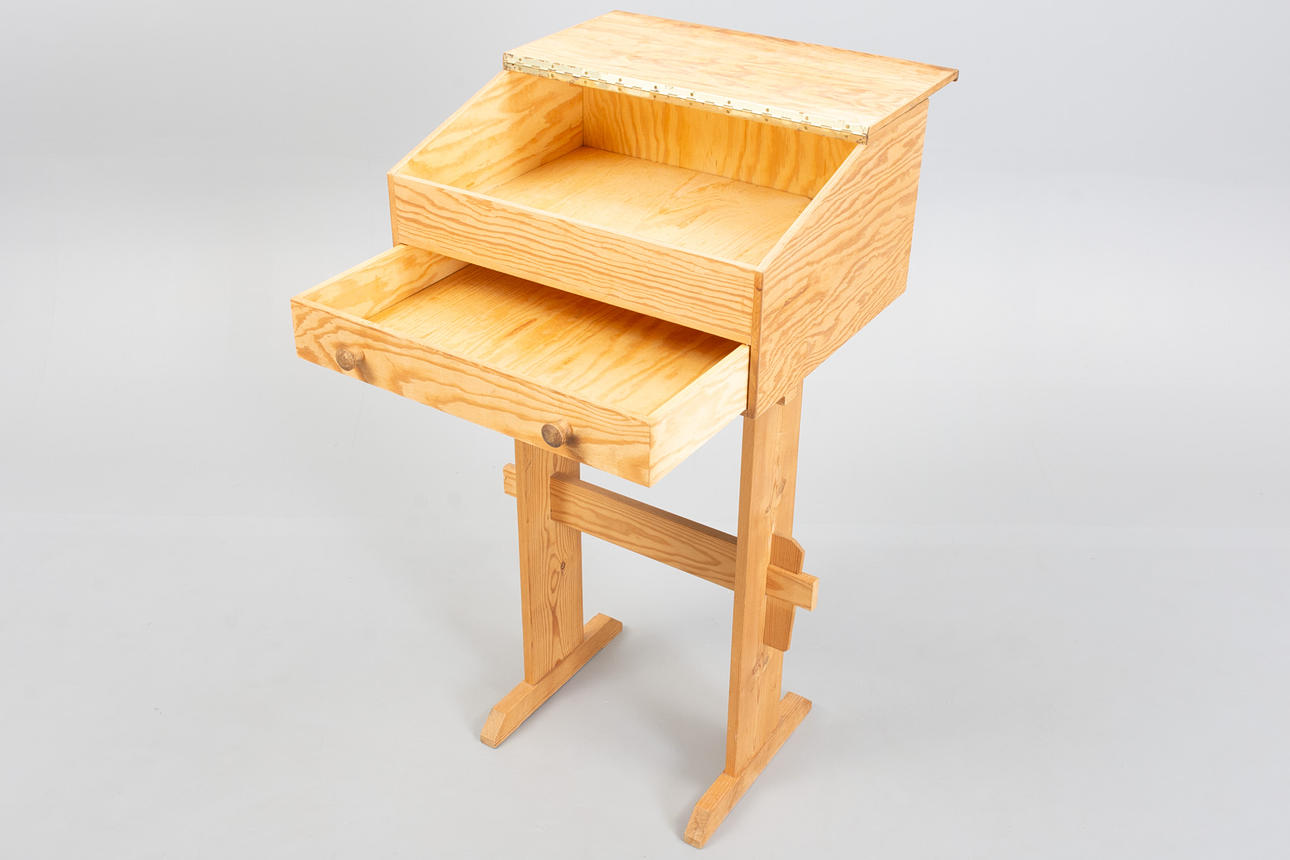 Writing desk in solid pine with a sloping top lid and drawer with round wooden handles.