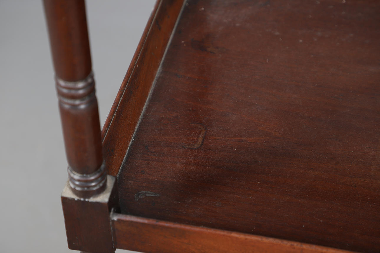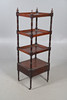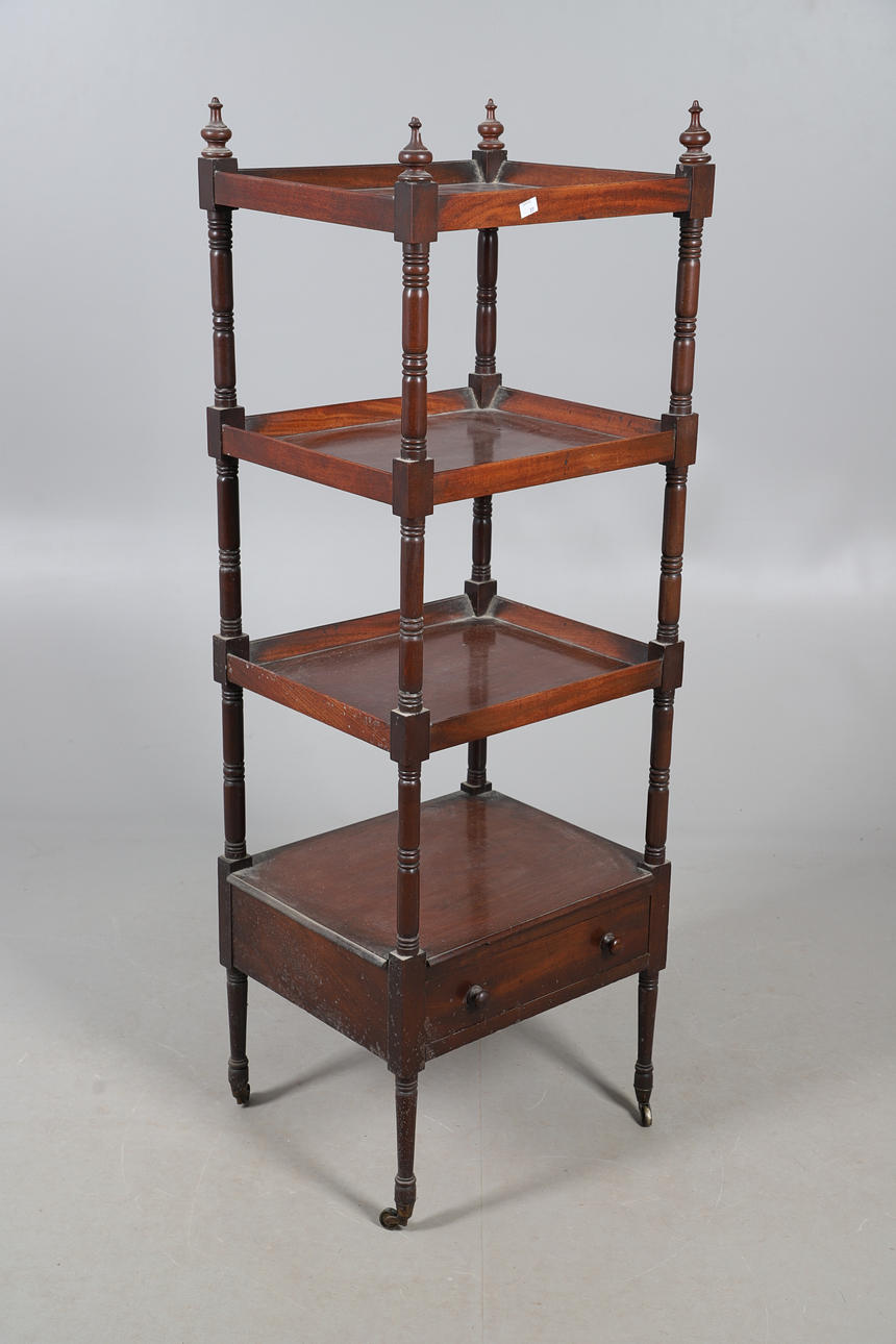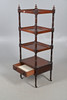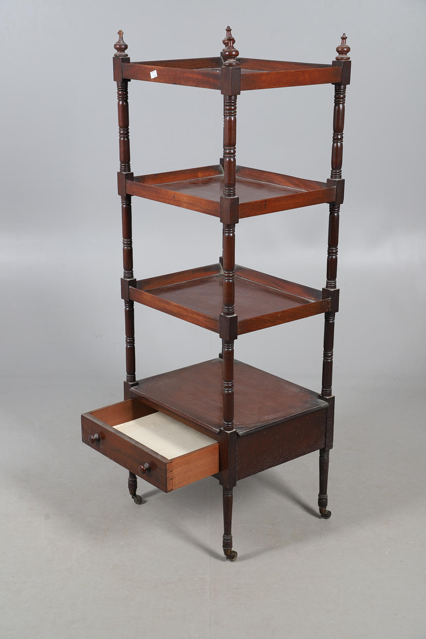 Three tray shelves above a single drawer, raised on turned supports with casters, W48 x H140 x D40cm.