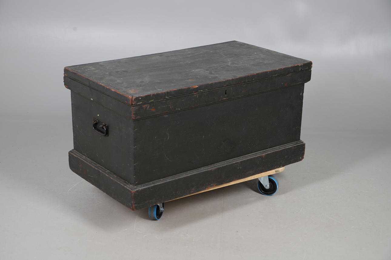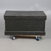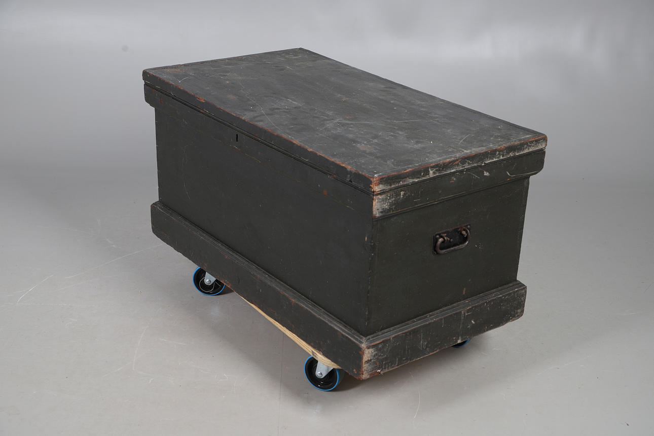 the hinged lid opening to reveal a candlebox, with two iron carry handles, 88cm x 50cm x 53cm high.