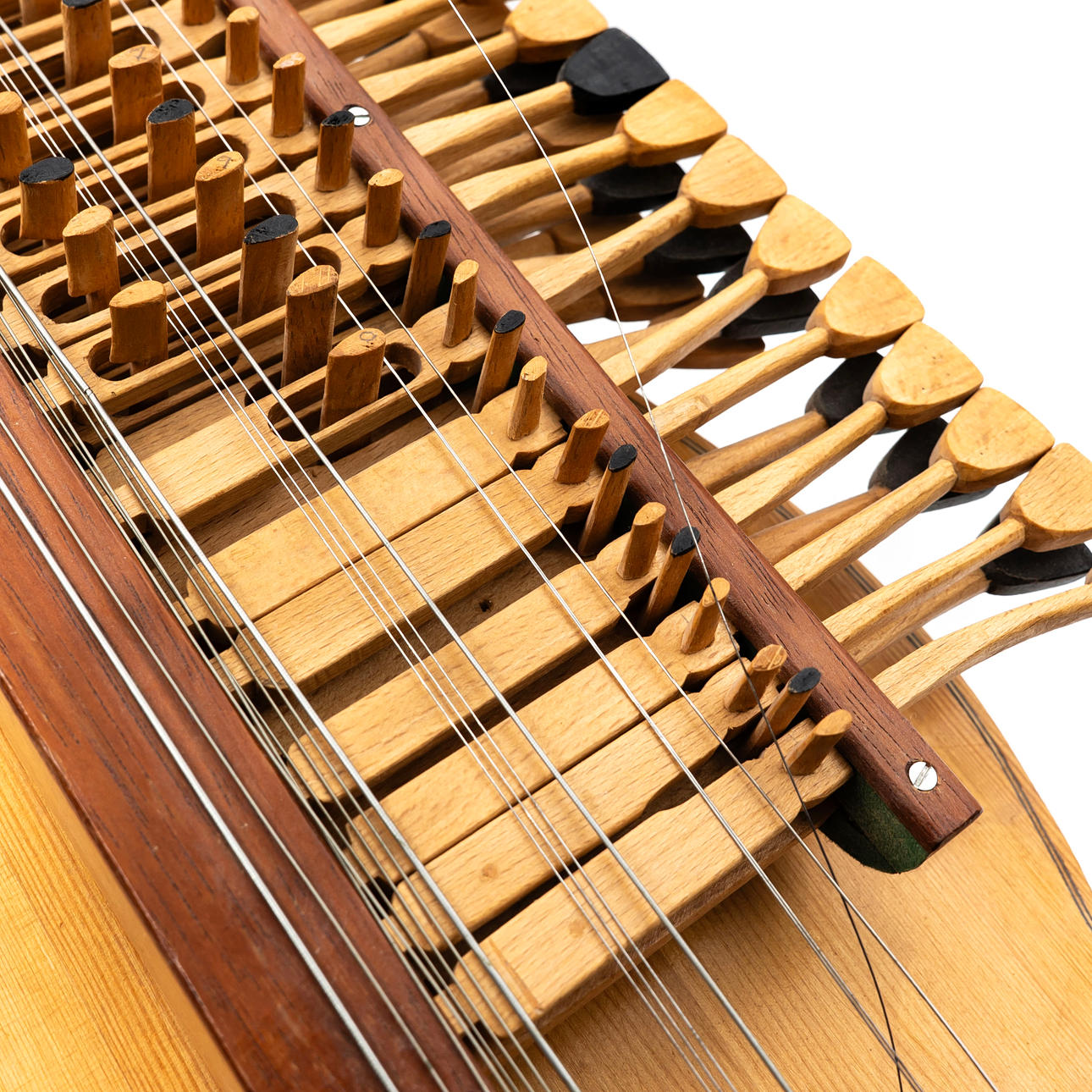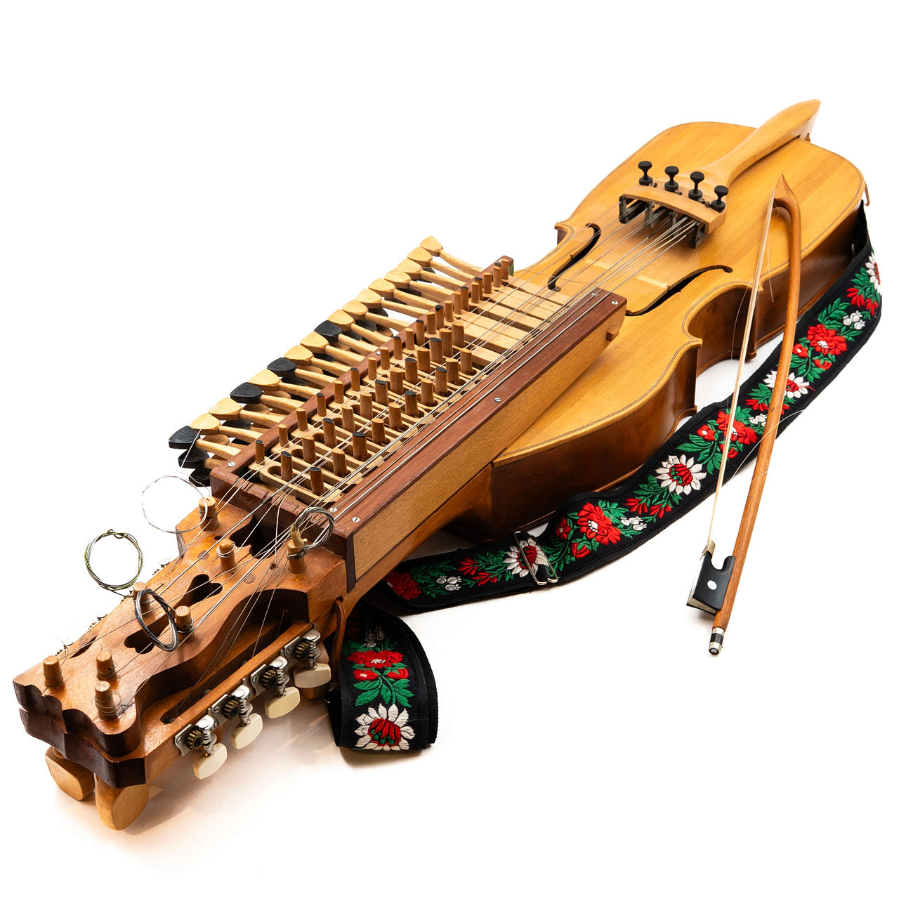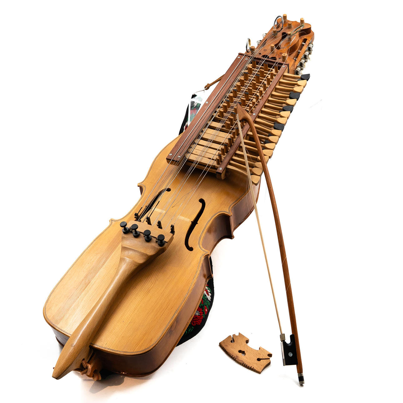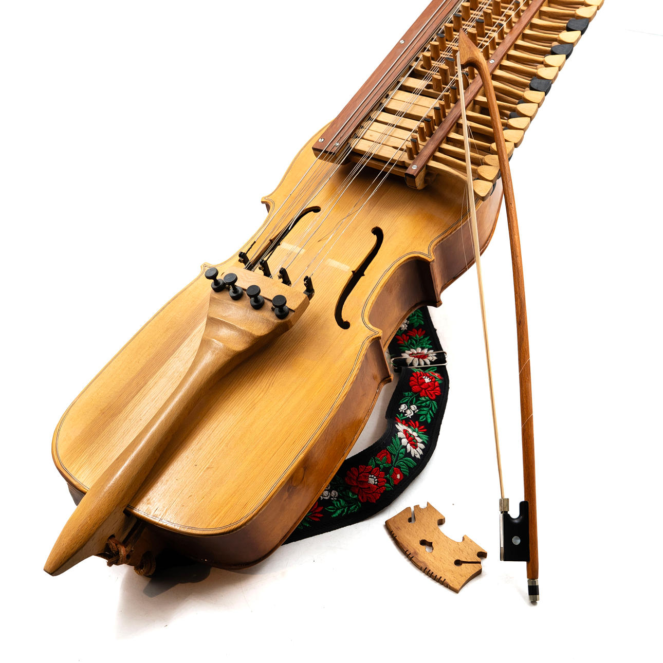 Three-row chromatic key harp with four playing strings and resonant strings. Marked on the inside by L. Andersson and dated 1982. With associated bow and shoulder strap.