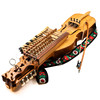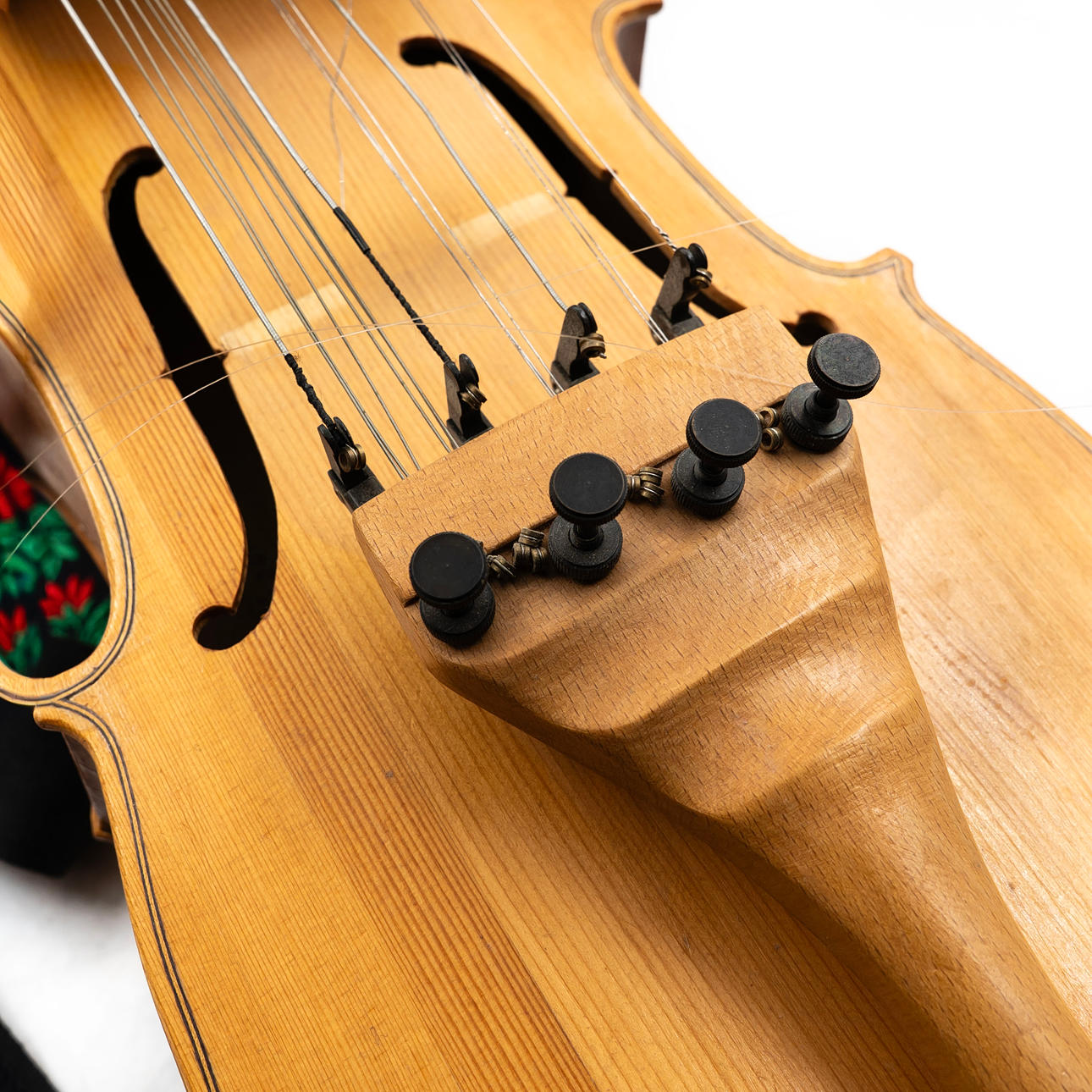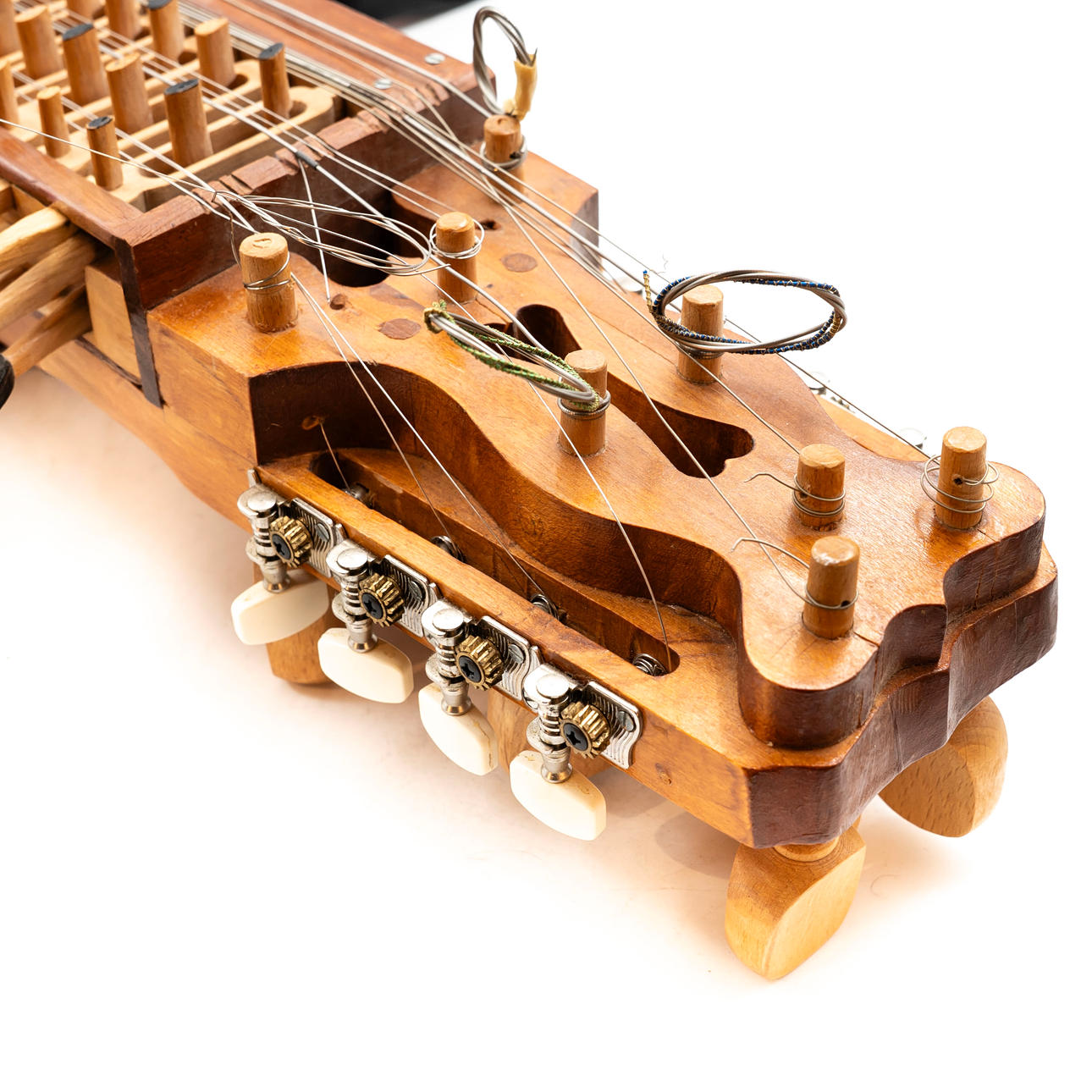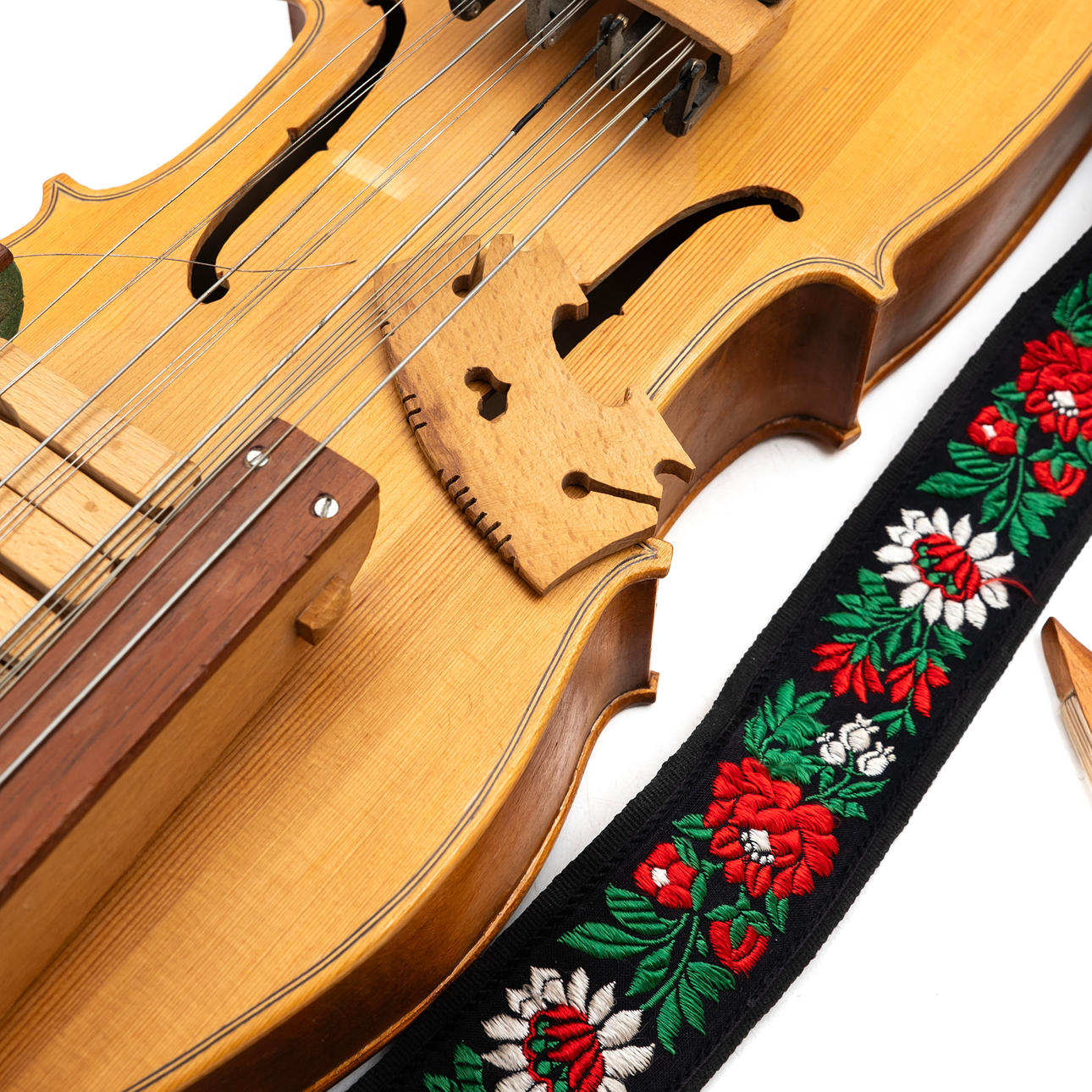 Three-row chromatic key harp with four playing strings and resonant strings. Marked on the inside by L. Andersson and dated 1982. With associated bow and shoulder strap.