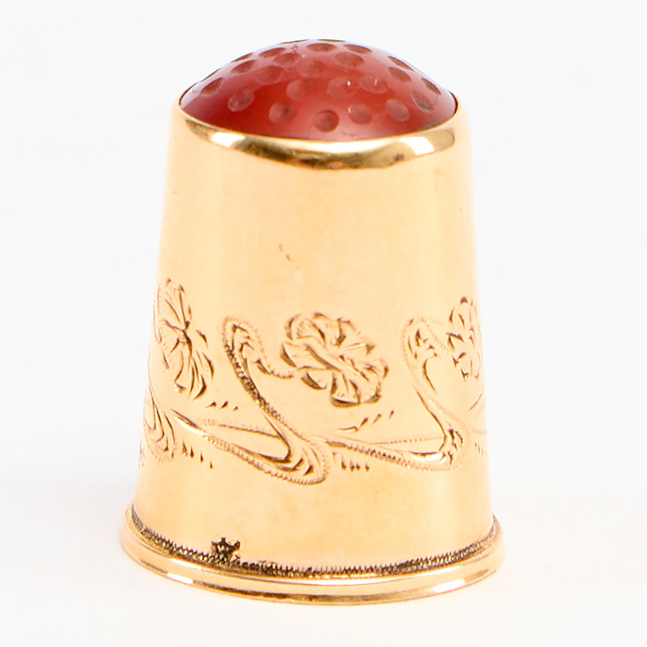 Thimble in 18K gold with carnelian, with engraved floral vine decoration.
