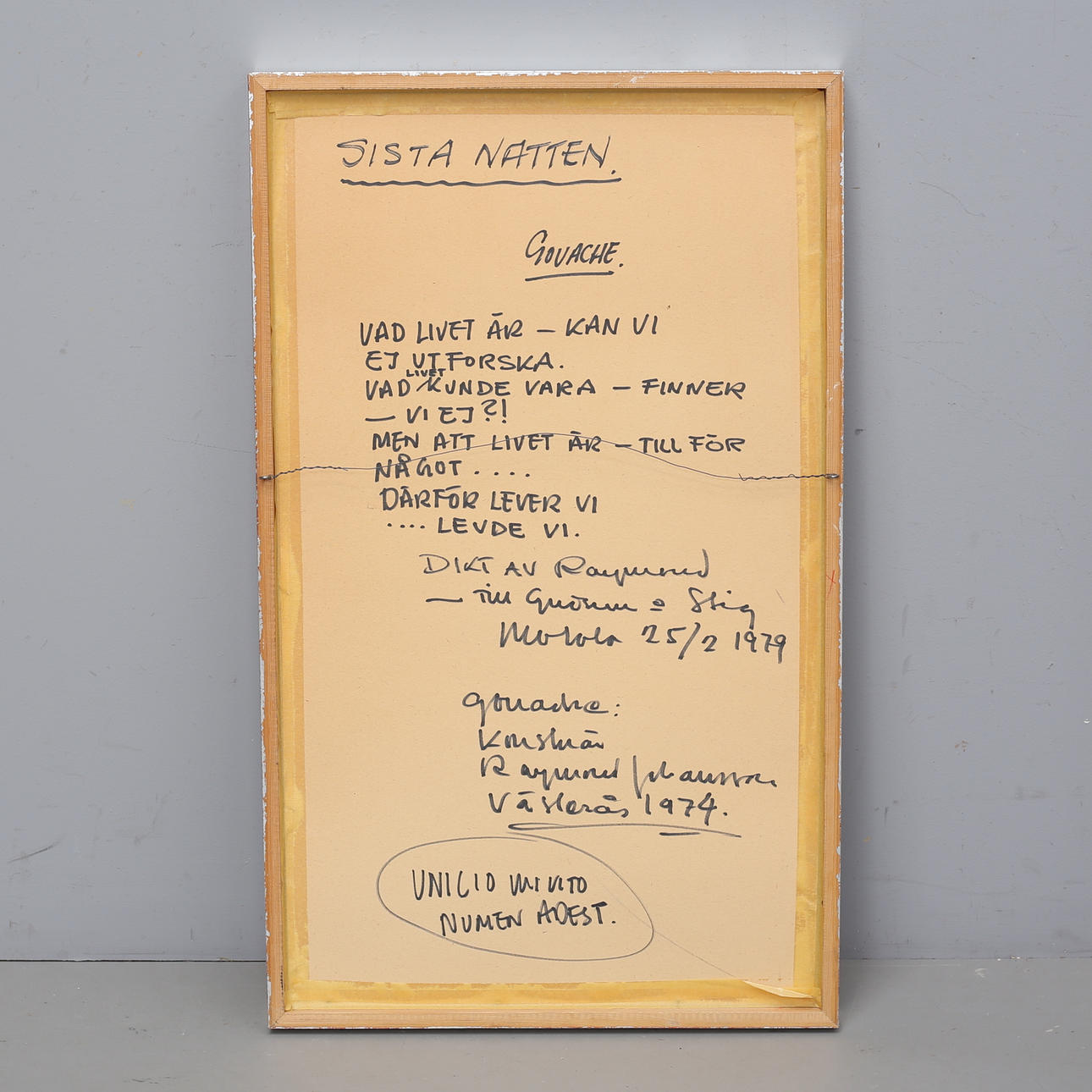 RAYMOND JOHANSSON. “Last Night”. Gouache, signed and dated -74.