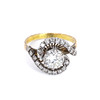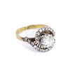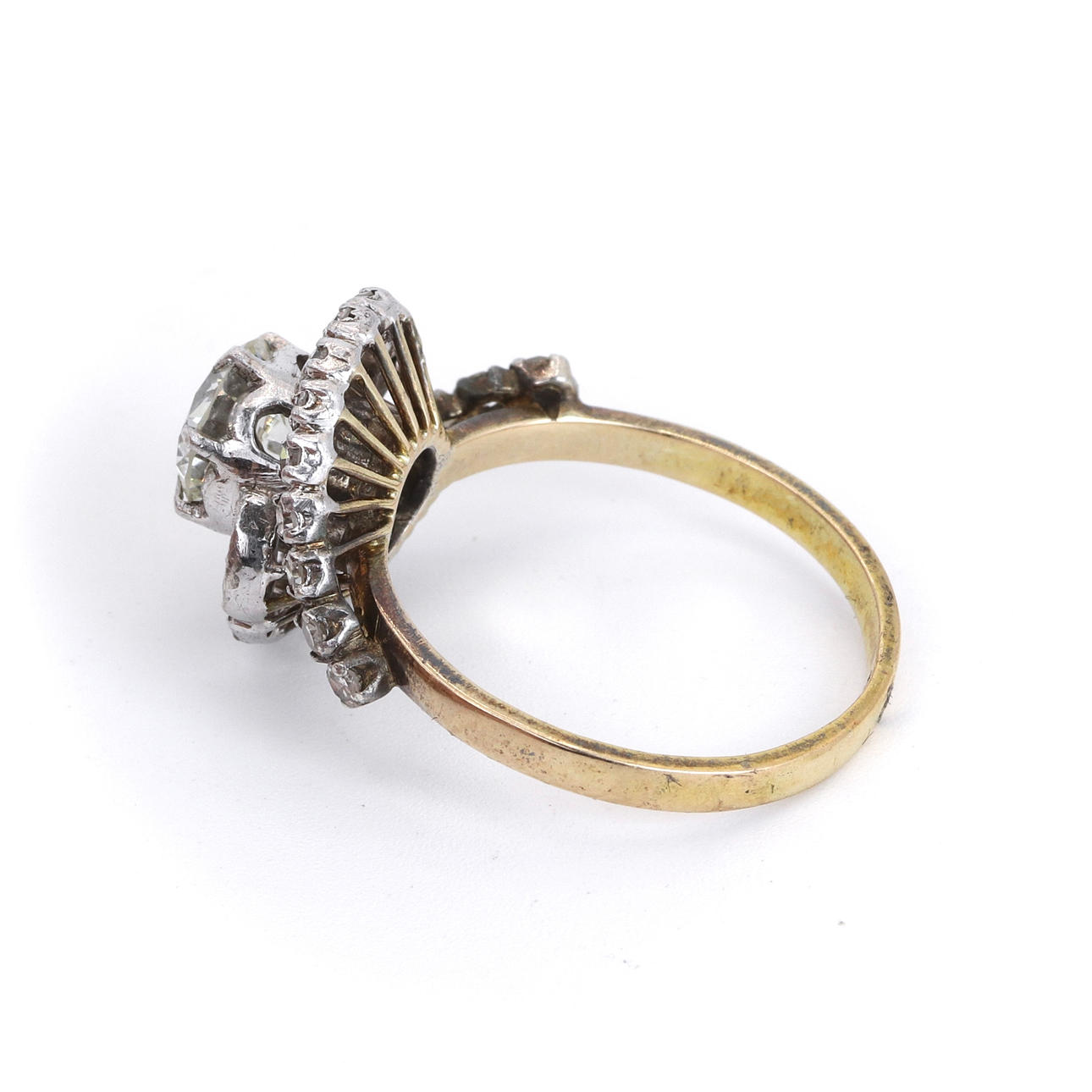 An 18ct yellow gold ring set with large round brilliant cut diamond (0,75ct approx.) surrounded by diamonds.