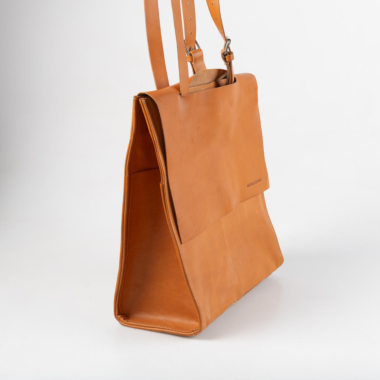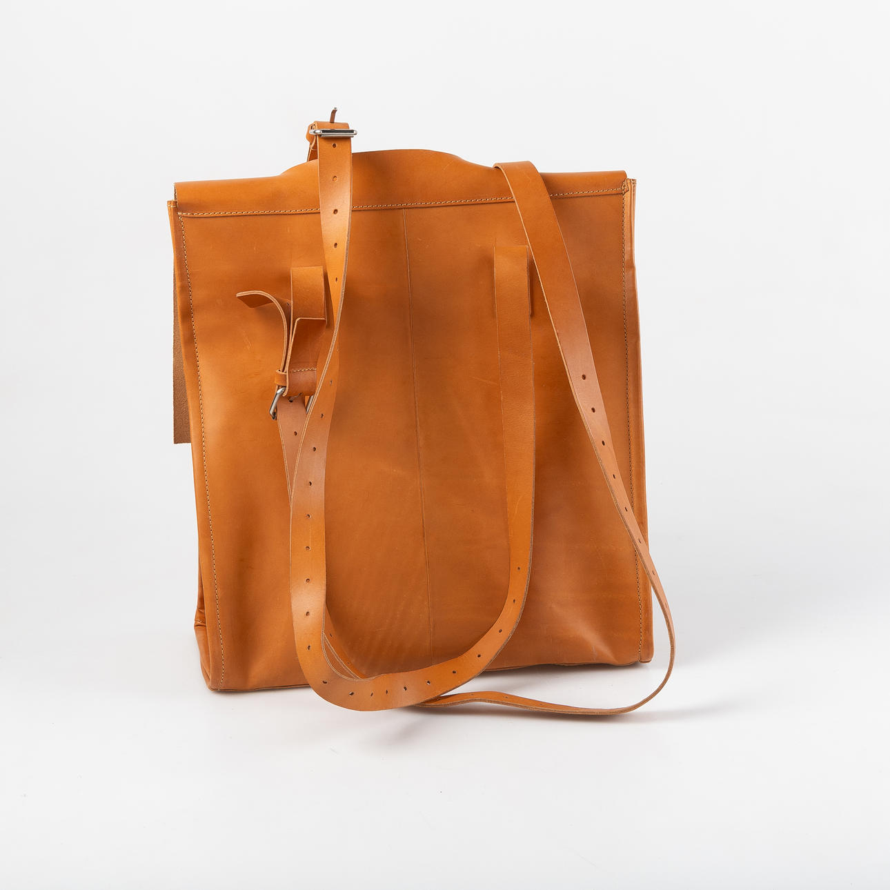 Leather. Lining in canvas. A zippered inner pocket. Adjustable shoulder straps. Dimensions approx. 34x15x36 cm.