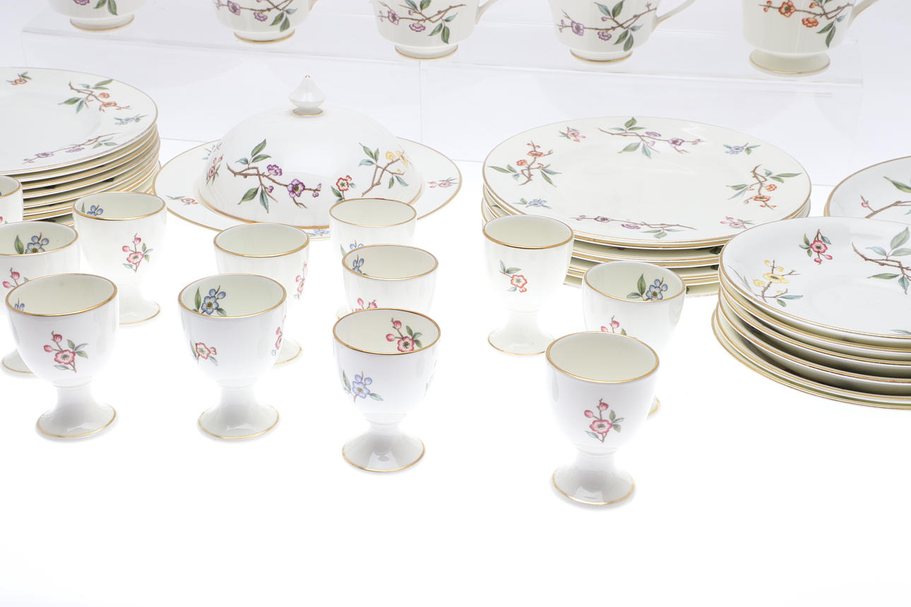 A Royal Worcester part tea/dinner service in the 'Blossom Time' pattern, comprising of 10 tea cups, 12 saucers, 16 plates, 13 egg cups, 2 platters, 2 bowls, 2 milk jugs, and 2 lidded butter/cheese dishes. Size of largest plate, 23cm (diameter). (QTY).