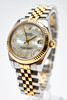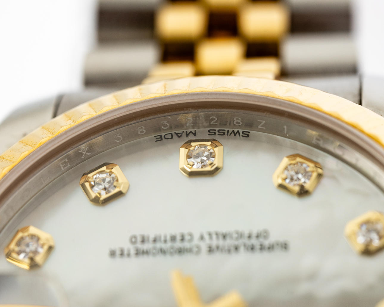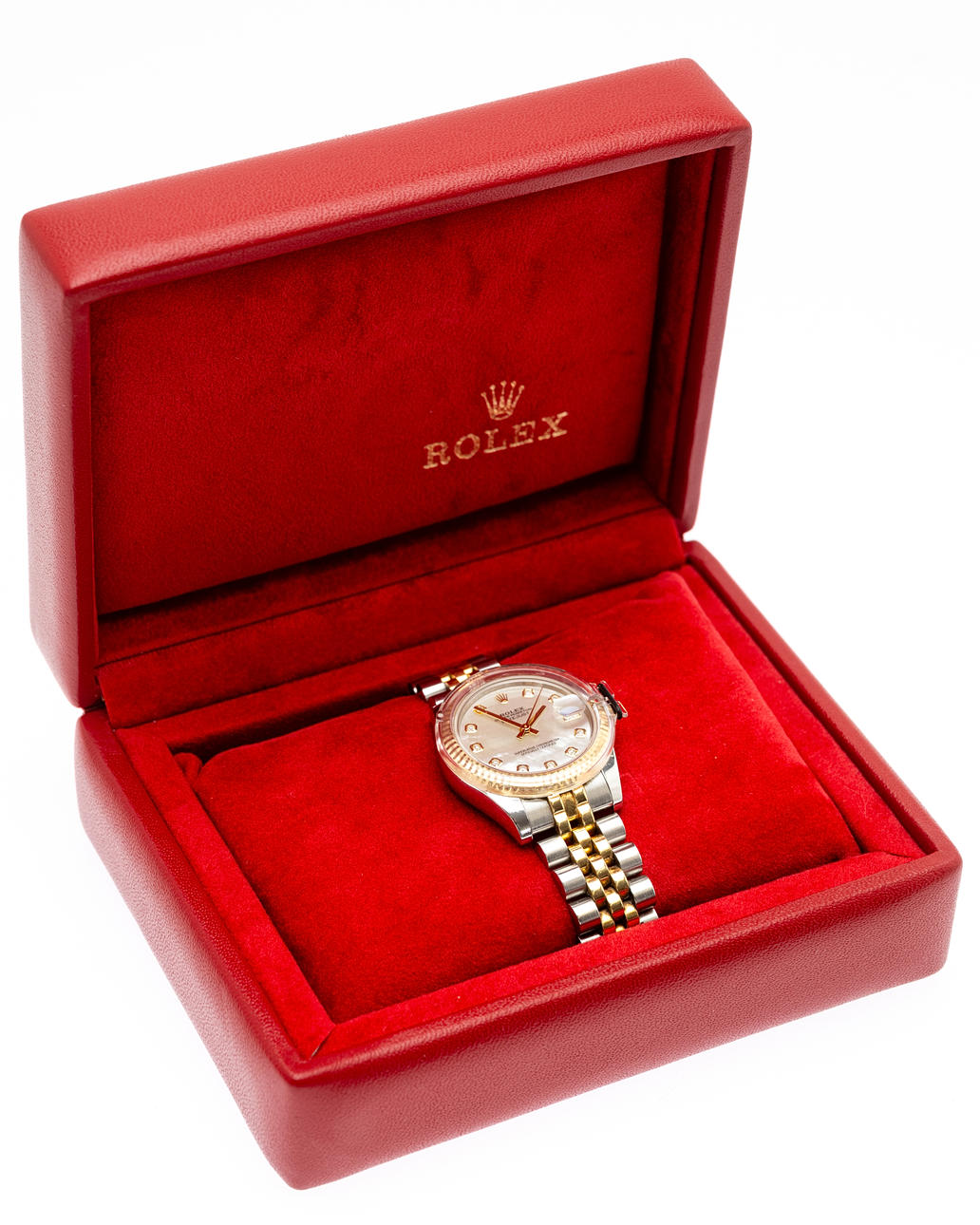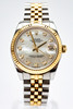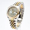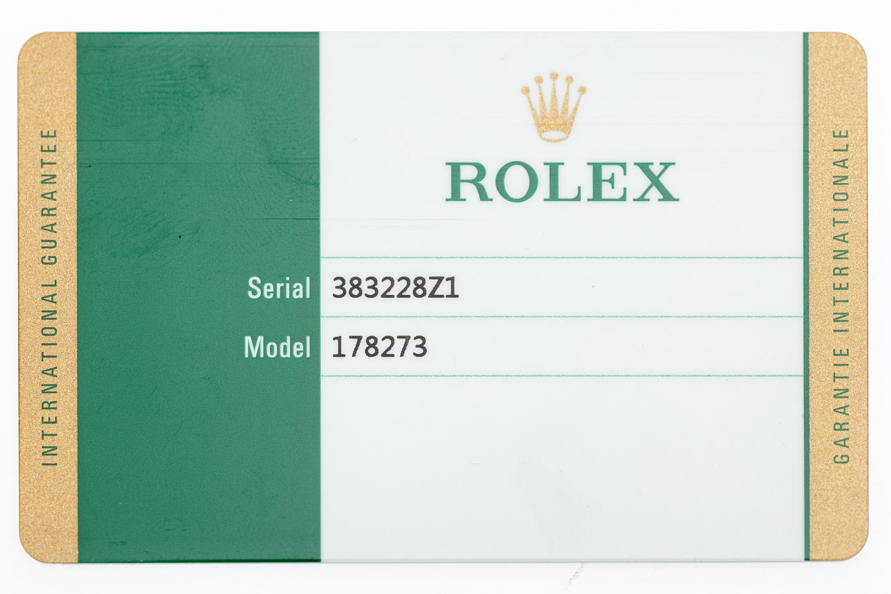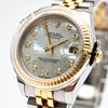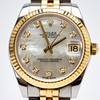 Rolex model 'Datejust', ref. 178273. Steel case, yellow gold bezel, mother-of-pearl dial with diamonds, minute, hour and second hand. Date at '3' clock with quickset function, sapphire glass. Yellow gold and steel bracelet with folding clasp. Case diameter approx. 31 mm without crown Automatic clockwork Box and papers included The clock was ticking at the time of the review, Stockholm's auction shop does not guarantee functionality.