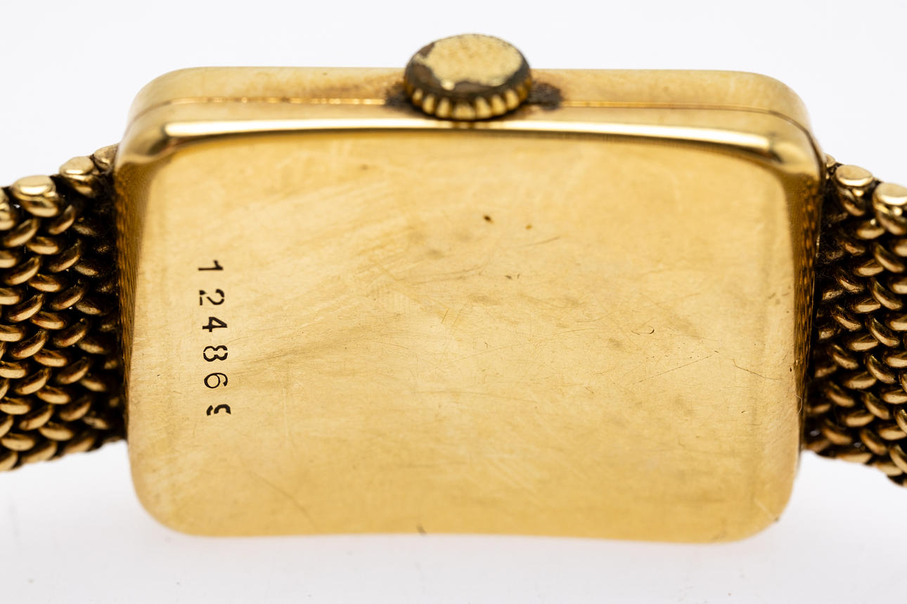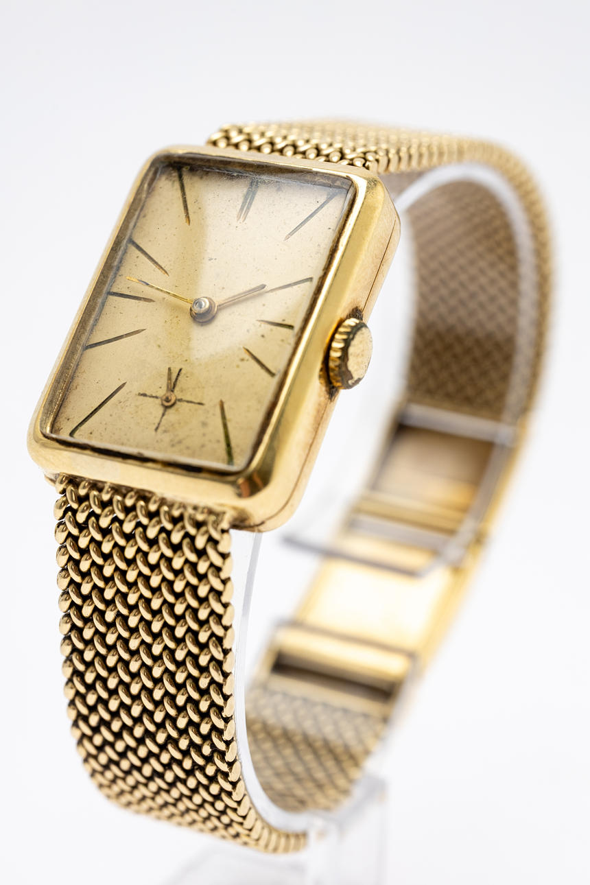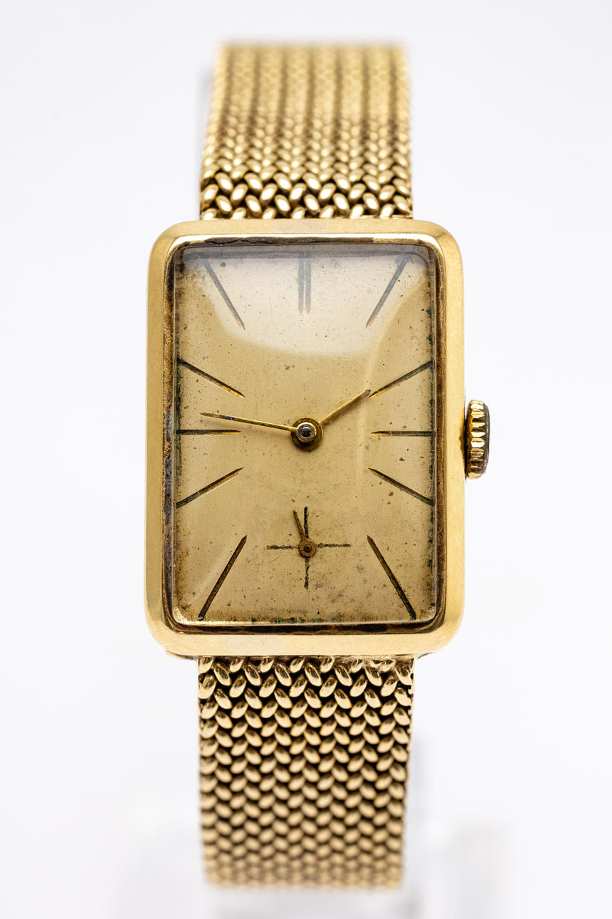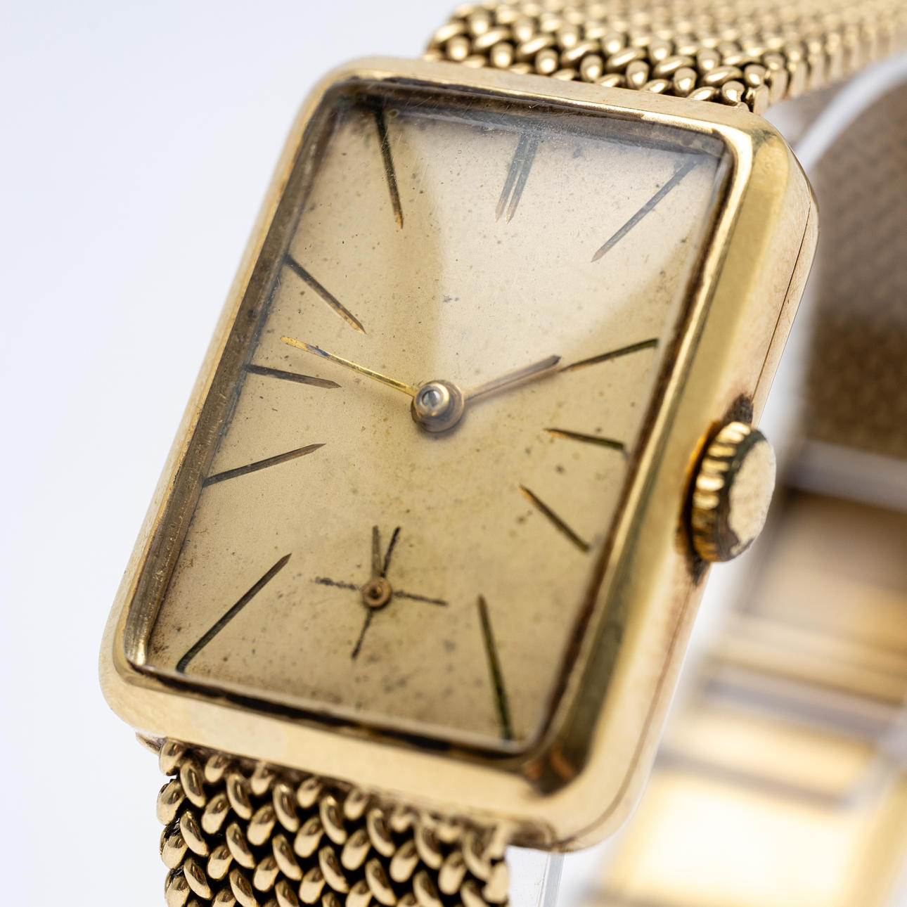 Wristwatch, made of 585 gold, bracelet with folding clasp, dial with minute and hour hand and small second. Dimensions approx. Case 22.5 mm x 30.5 mm, length 20.5 cm. Weight ca. 59 grams (clock doesn't work), Stockholms Auktionsverk does not guarantee functionality.