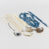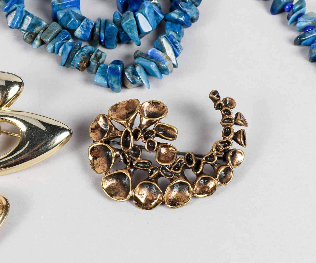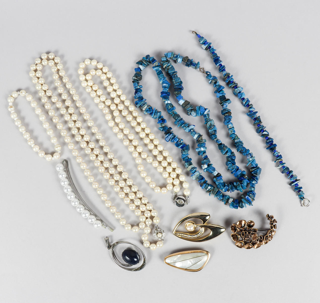 Necklace and bracelet, Lapis Lazuli. 2 pearl necklaces, synthetic pearls with silver clasps. A bronze brooch, Hannu Ikonen “Lava”, Finland. And more.