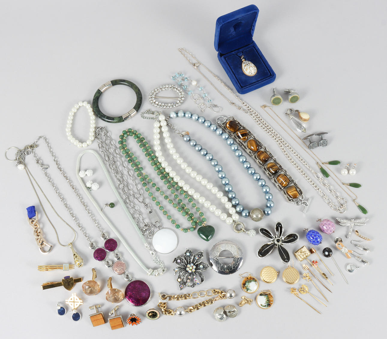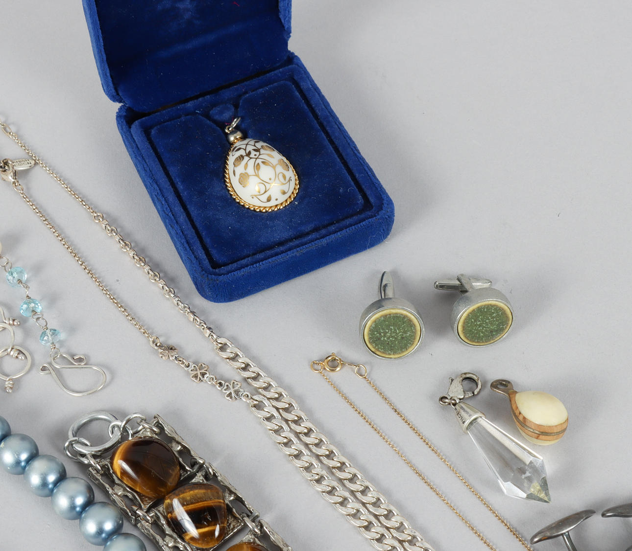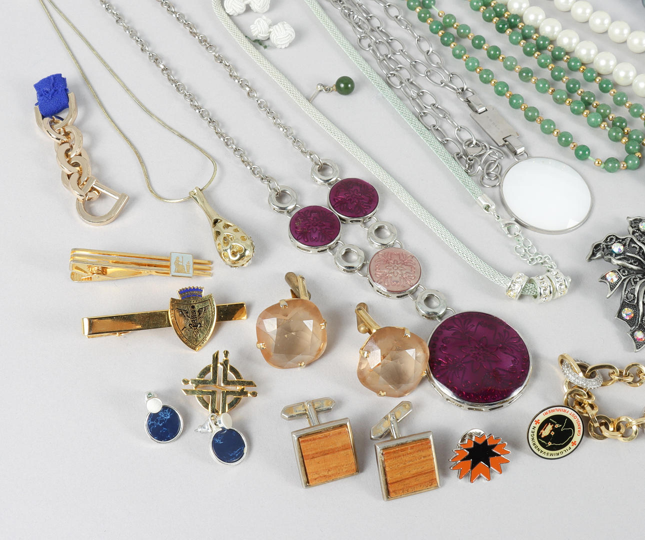 Various jewelry in mixed materials and base metals.
