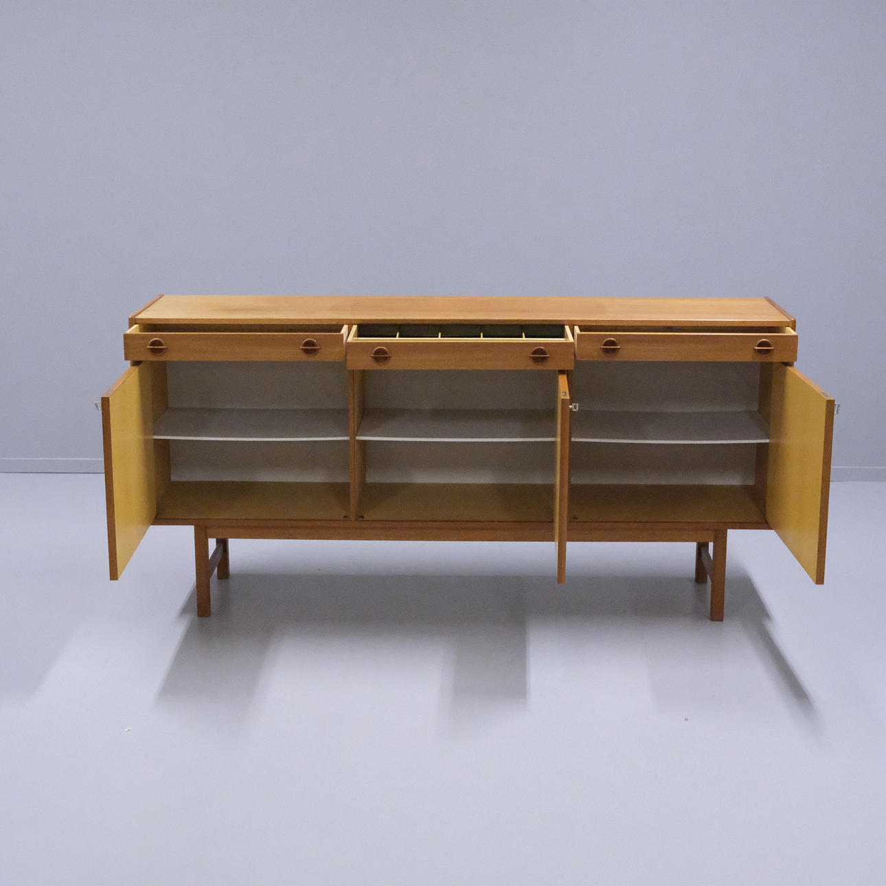 Three drawers of which one with compartments, three cabinet doors with rear shelves.