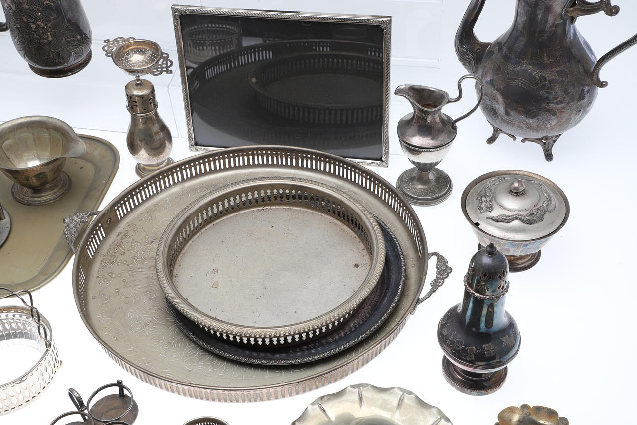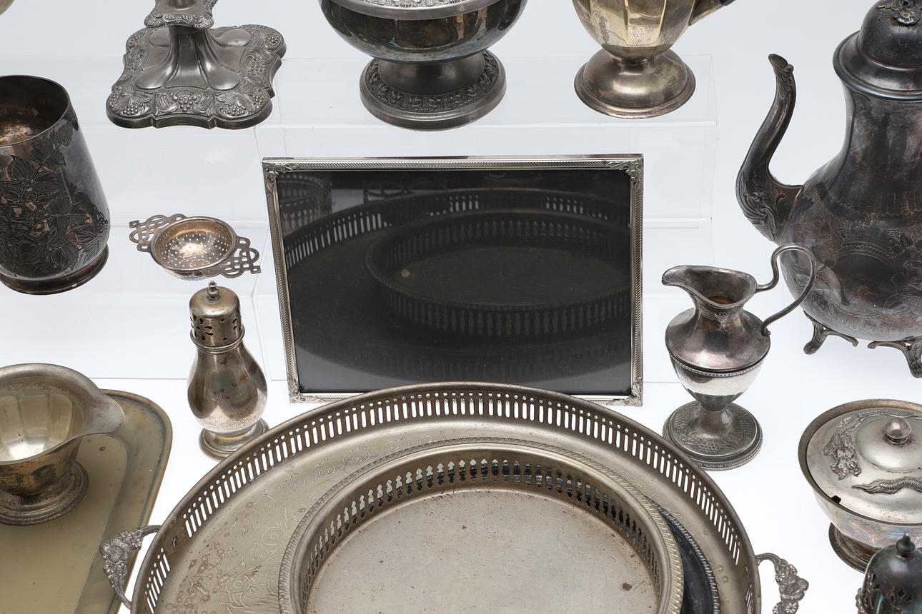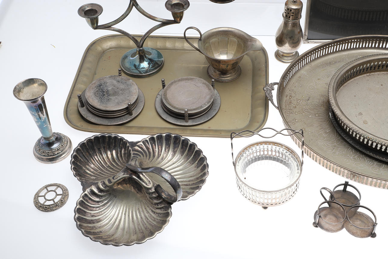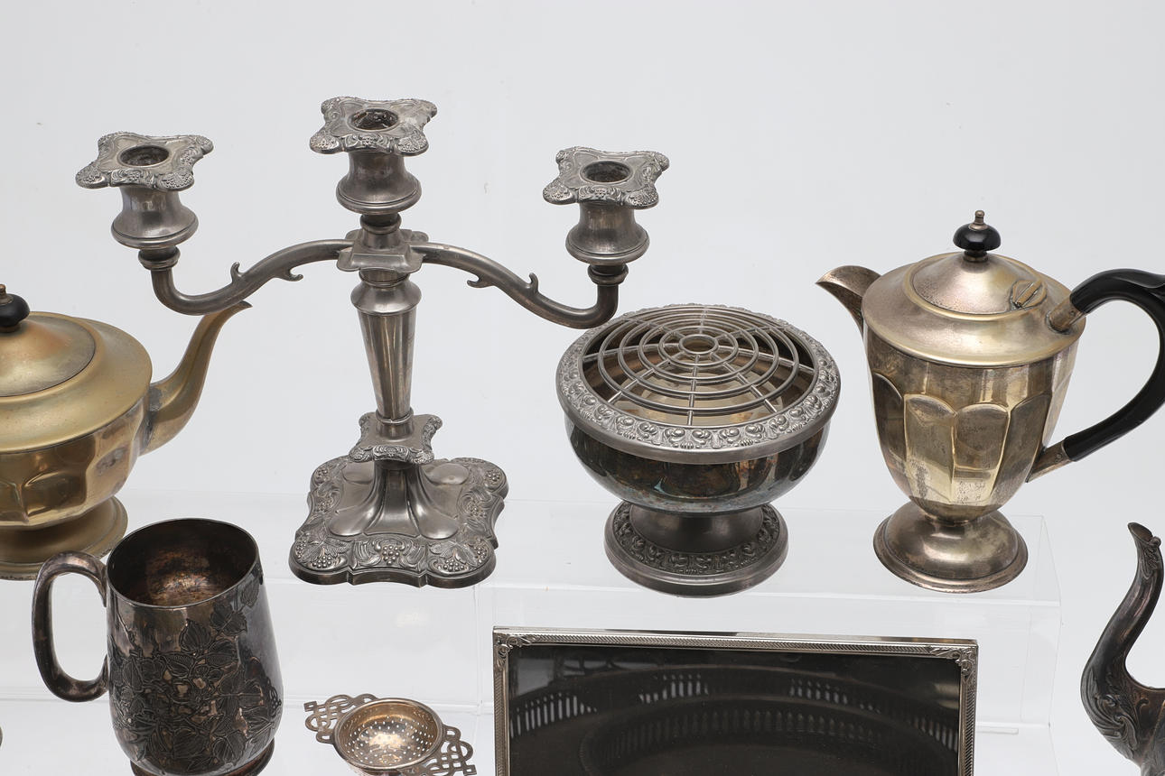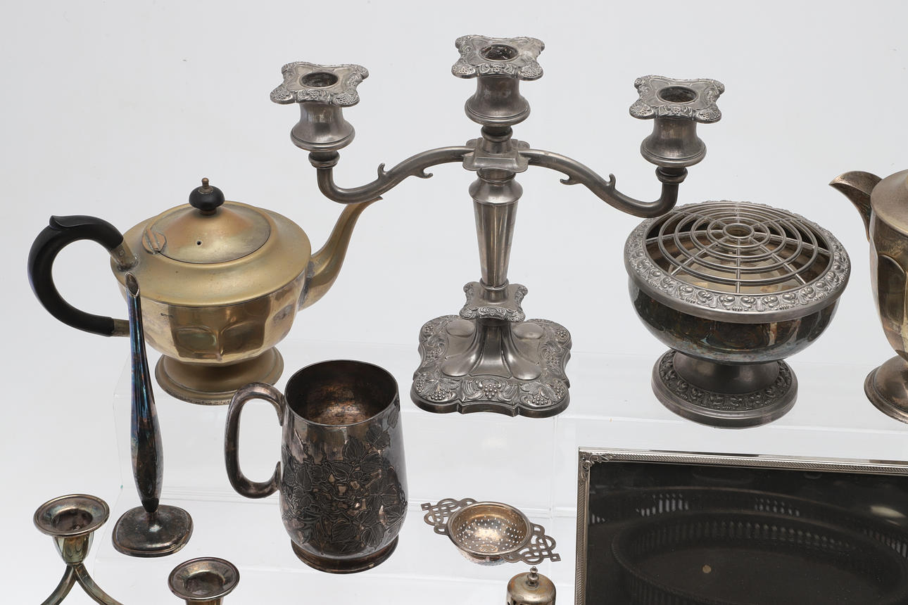 To include a large three branch candelabra (Height 25cm x Width 28.5cm), coffee pots, teapots, coasters, trays (largest measures 35cm x 27cm), casters and other silver plated items of interest. Contents box measures Height 18cm x Width 59cm x Depth 39cm.
