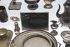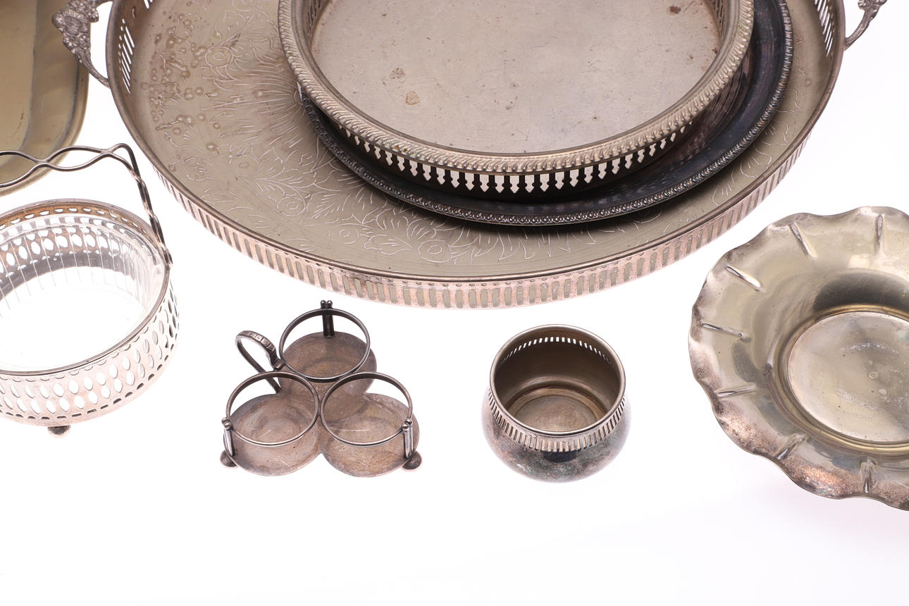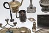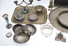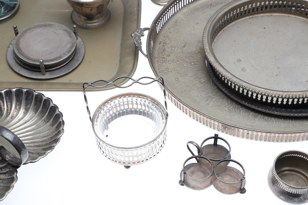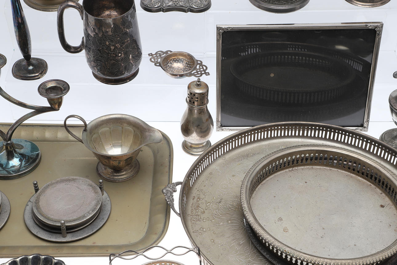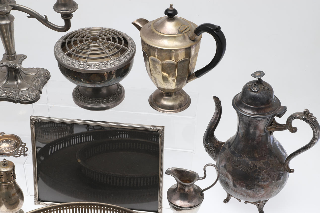 To include a large three branch candelabra (Height 25cm x Width 28.5cm), coffee pots, teapots, coasters, trays (largest measures 35cm x 27cm), casters and other silver plated items of interest. Contents box measures Height 18cm x Width 59cm x Depth 39cm.