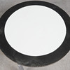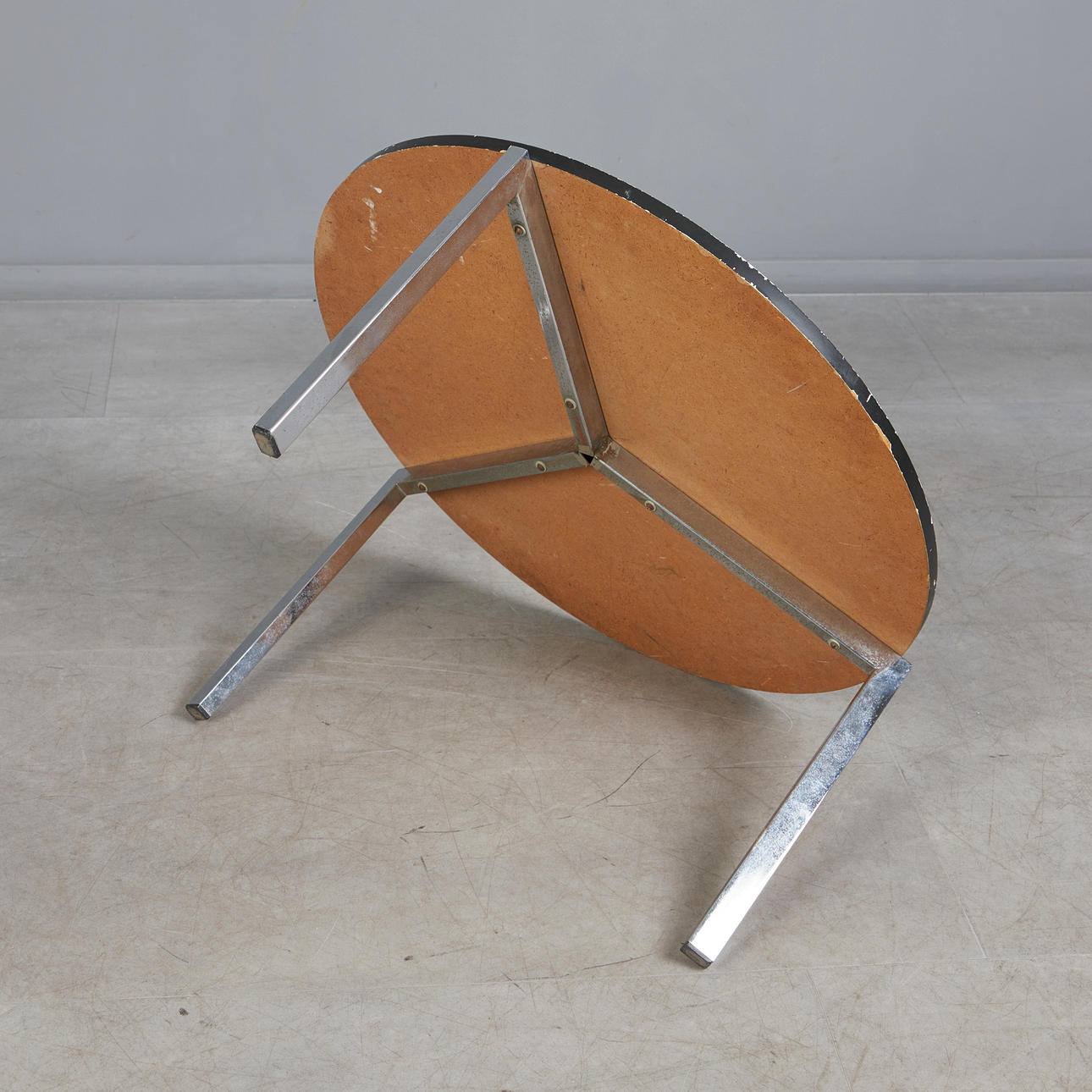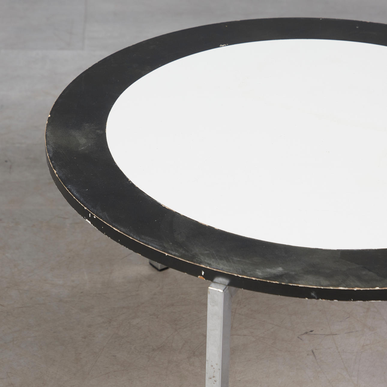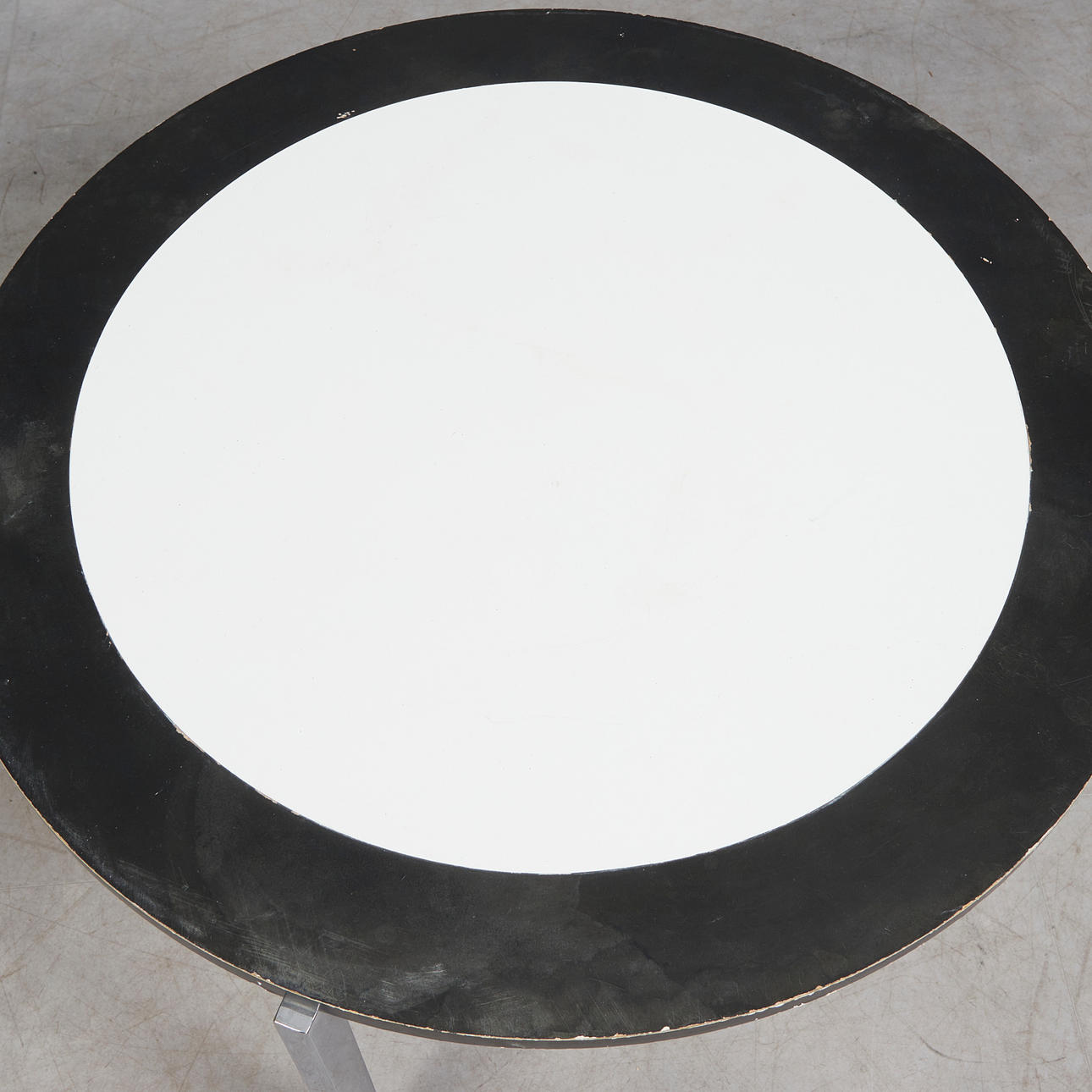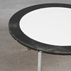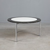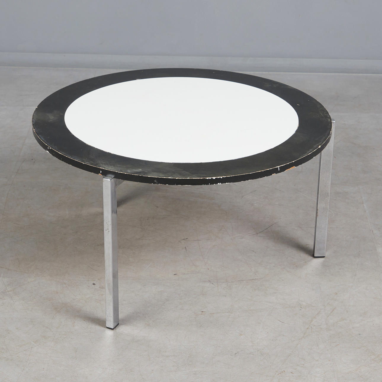Coffee table with a three-legged chrome-plated flat steel frame and a round chipboard with white melamine coating and black lacquered ring, black plastic protector, h.40.5cm, d.75cm.