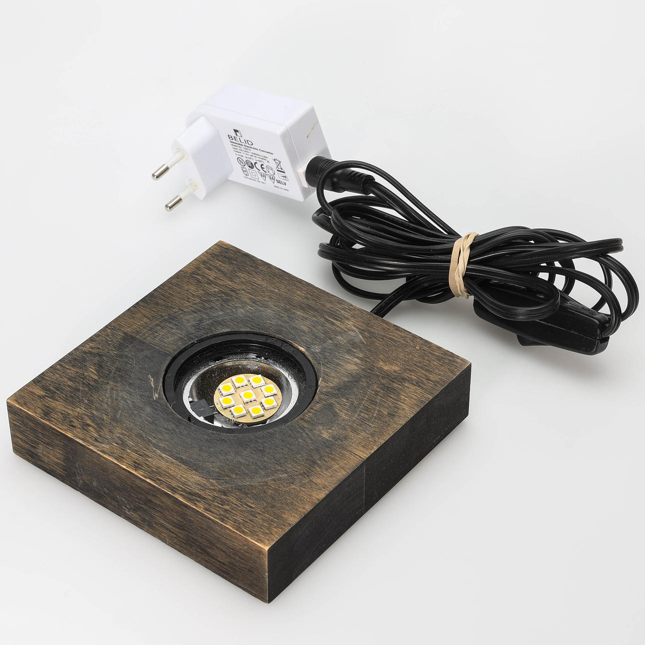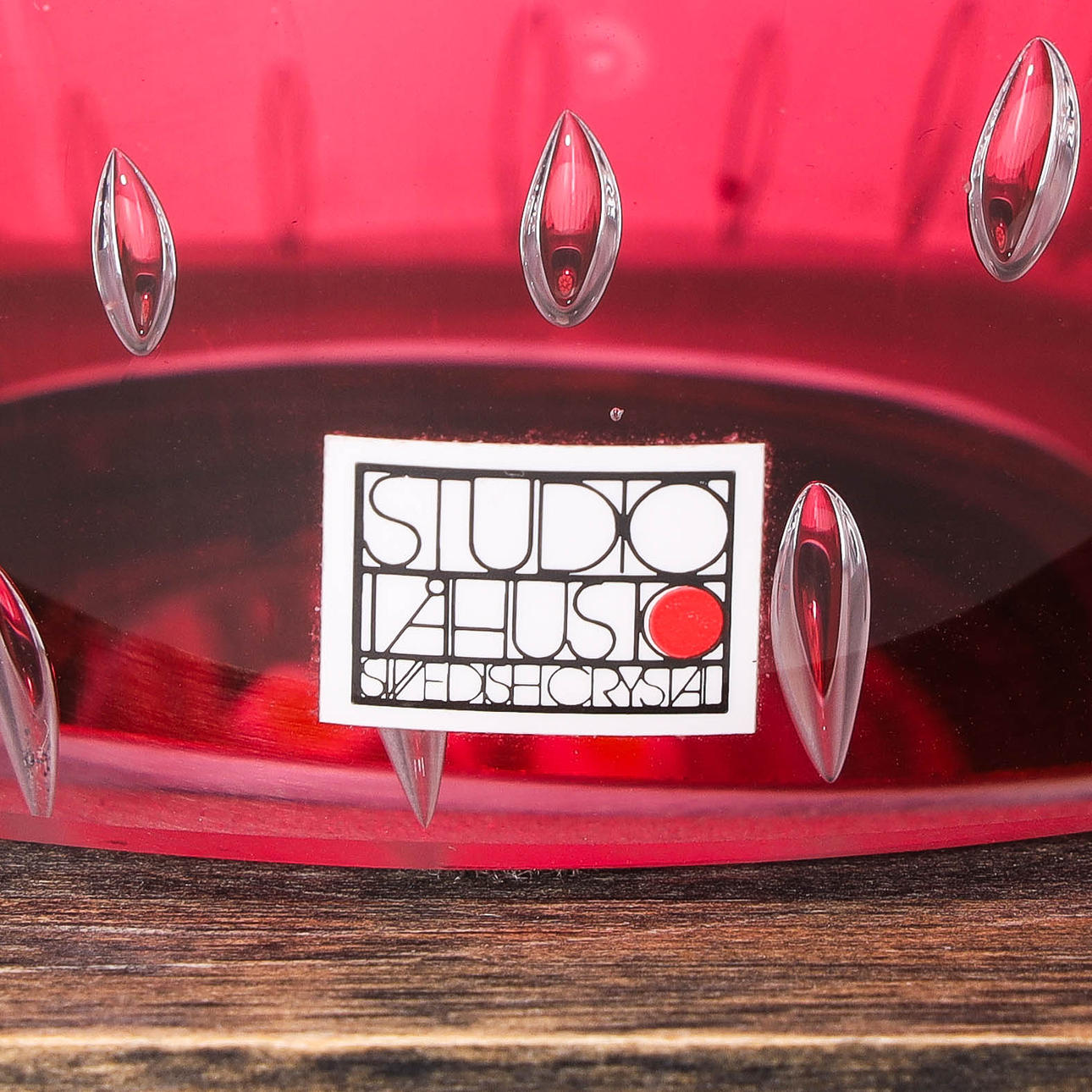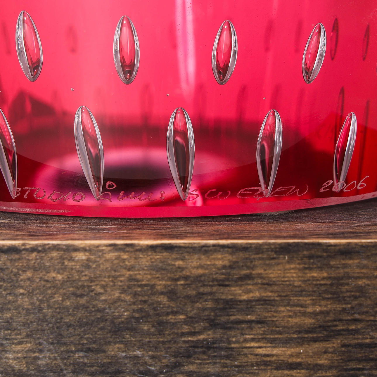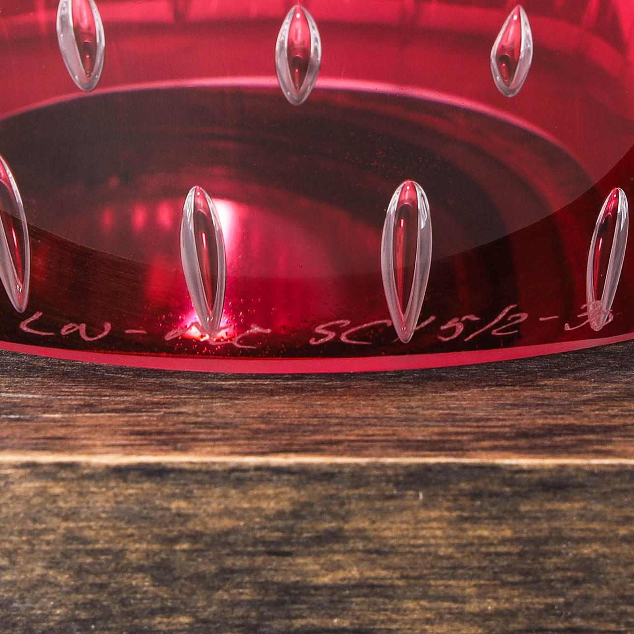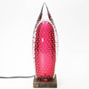 Glass sculpture on wooden plinth with lighting. Label marked and engraved. Height 46 cm including plinth.