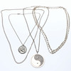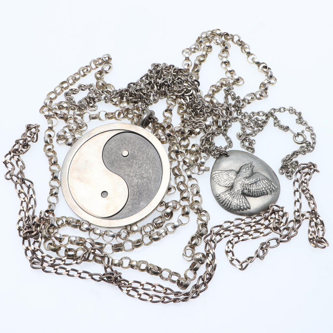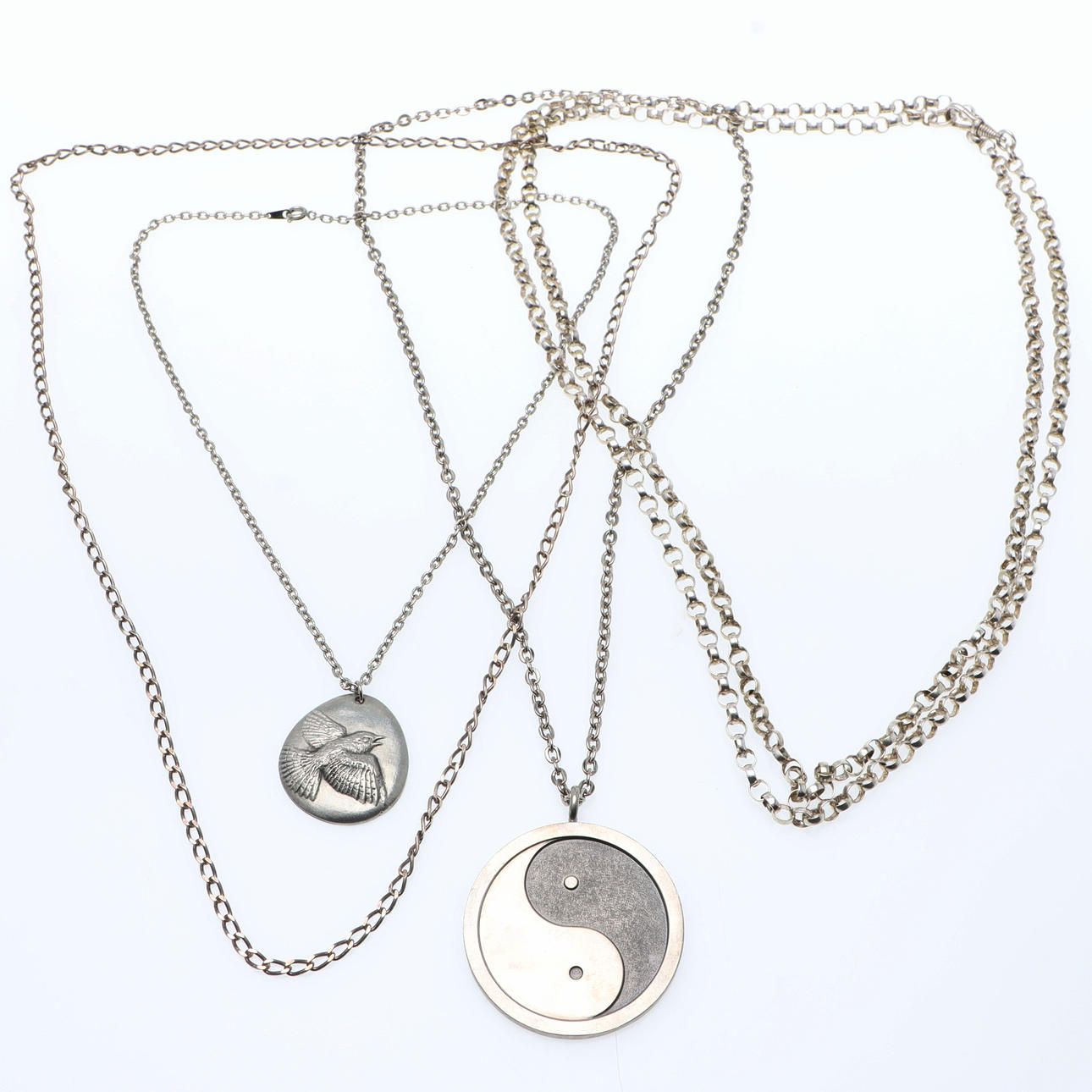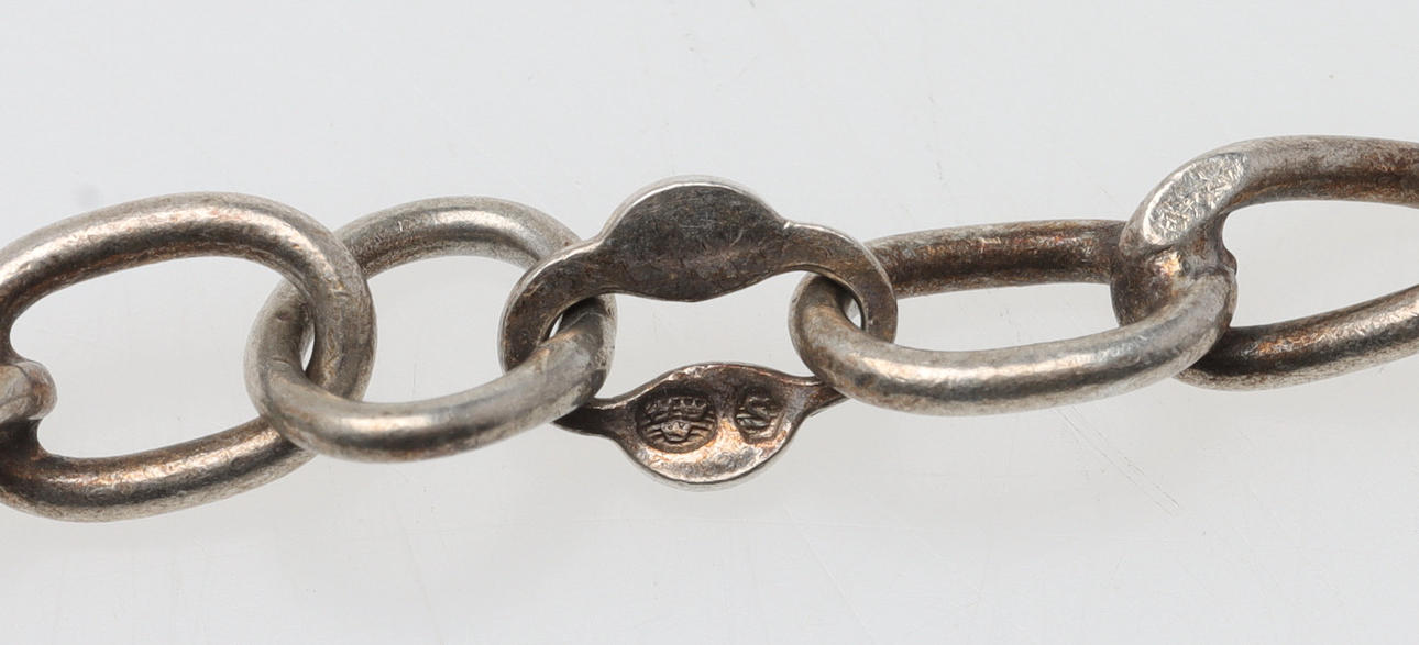 Chain, silver, length approx. 80 cm, width approx. 4 mm, weight approx. 17,8 grams. Chain, metal, length approx. 140 cm. 2 pcs pendants/necklaces, pewter, Jorgen Jensen & Mats Jonasson, width approx. 32 & 51 mm.