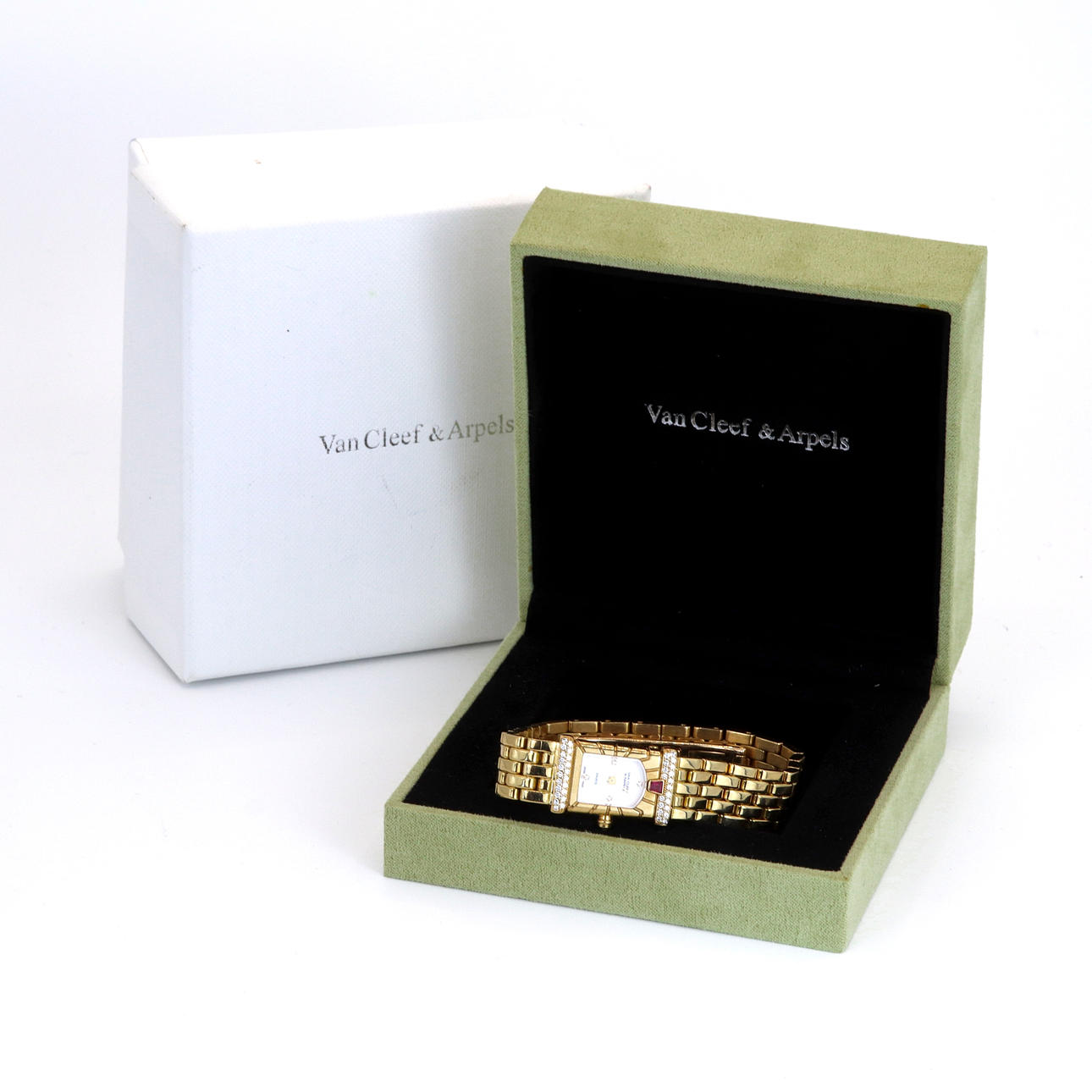 An 18ct yellow gold VAN CLEEF & ARPLES ladie's wristwatch set with diamonds and ruby to the bezel and diamonds to dial and crown.