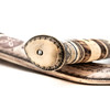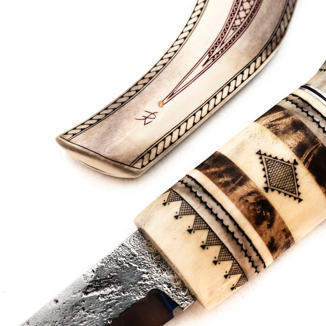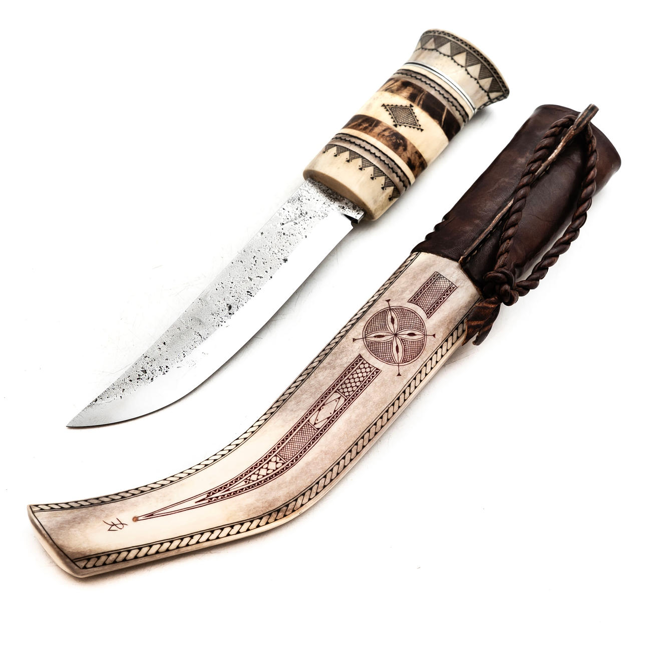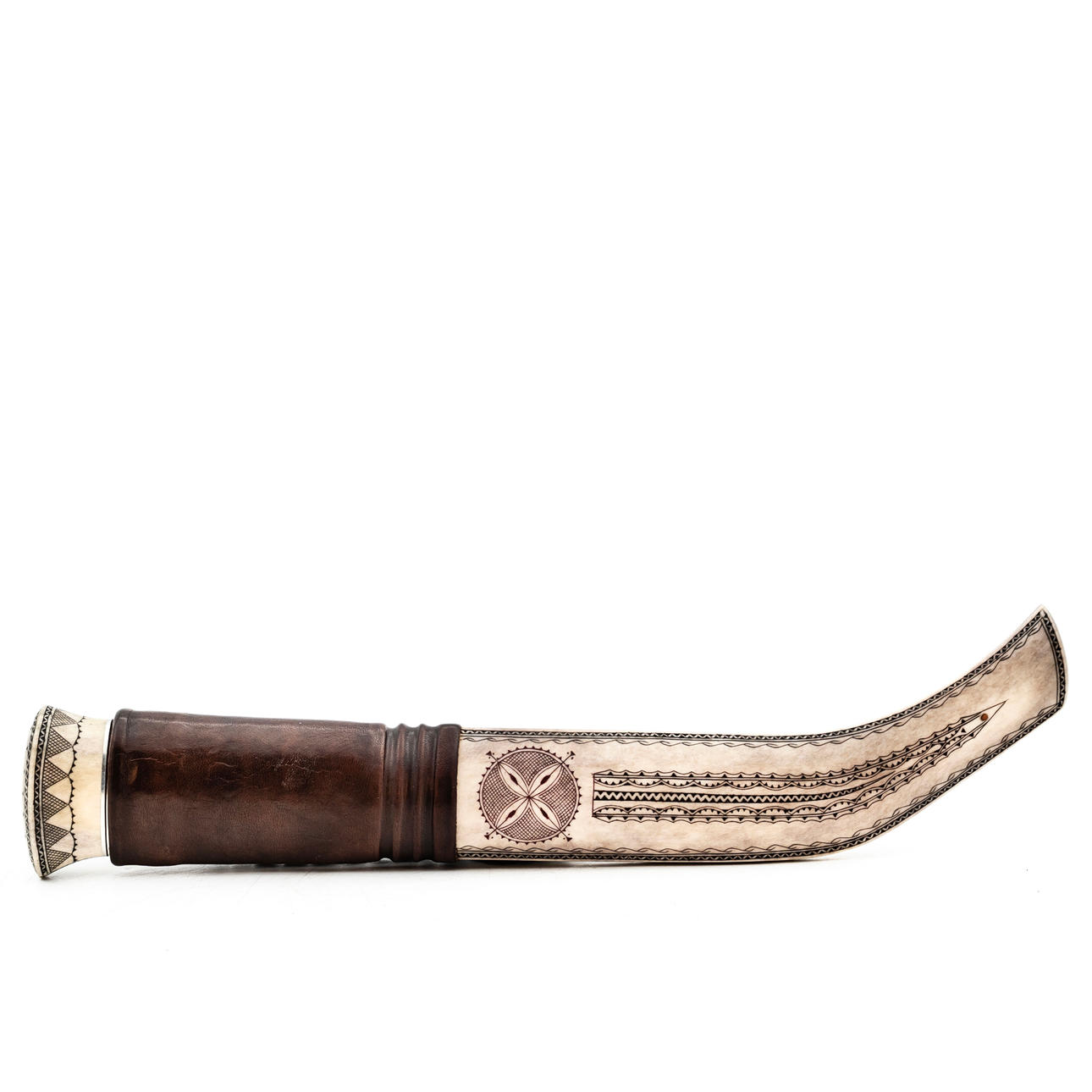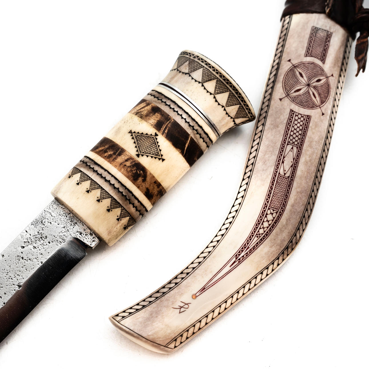 Made of leather, masur birch, silver and engraved reindeer horn in stylized decor.