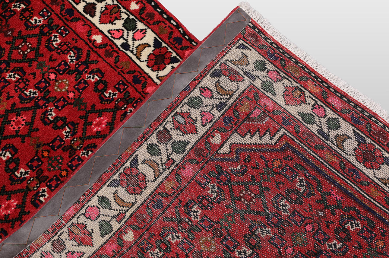 Hamadan gallery model with red bottom color and a center field covered in Herati pattern in dark blue, pink and beige. The border has light bottom with floral decor. The forelock is made of wool and the warp is of cotton.