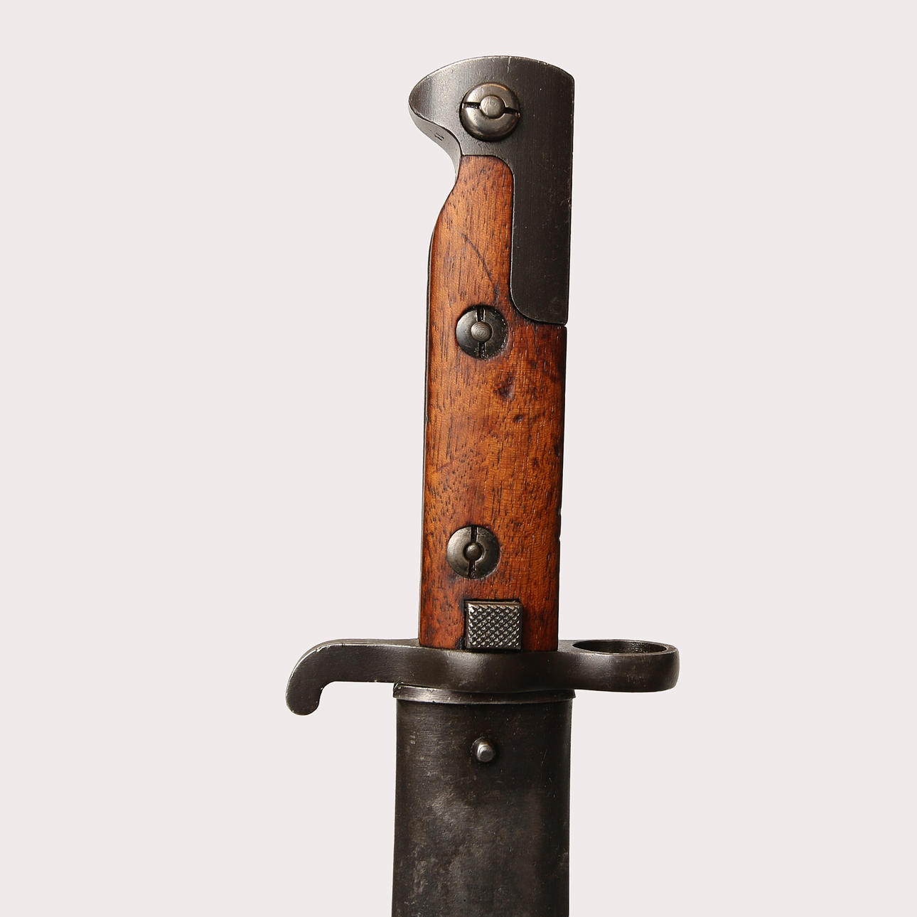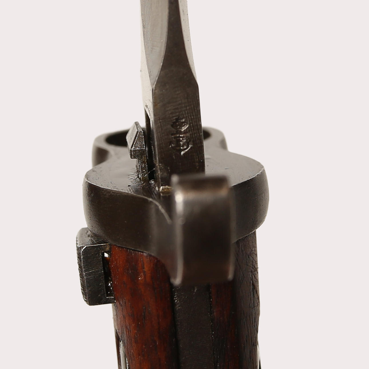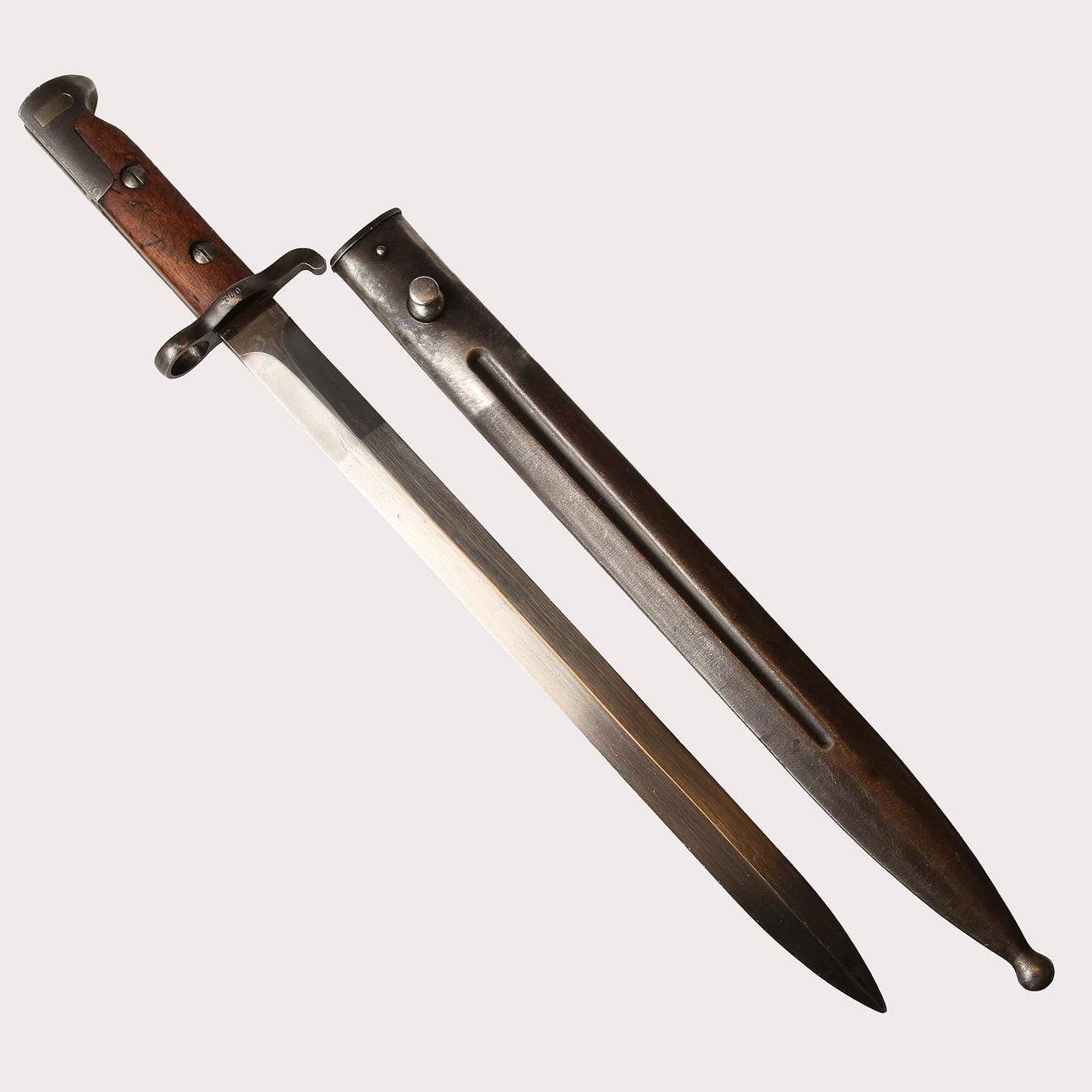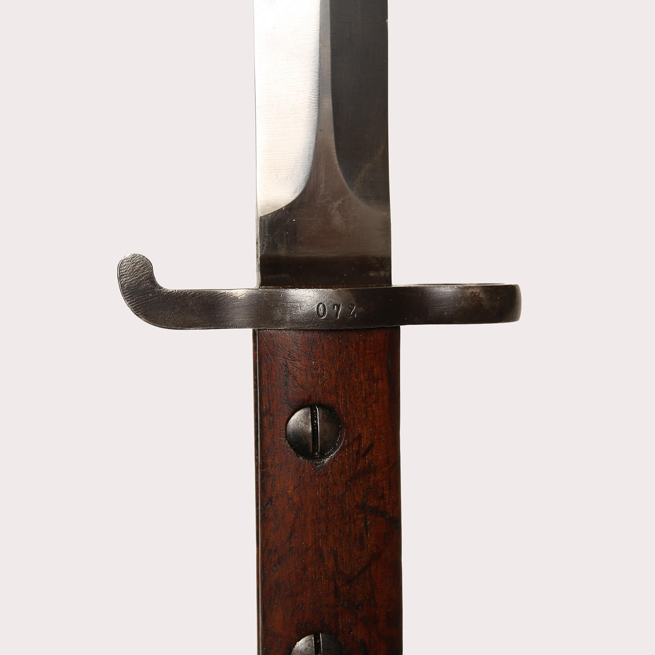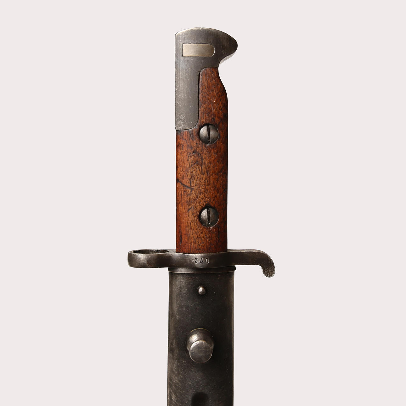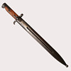Pilot bayonet with medium blade 33 cm, long cloak and heel groove of 38 mm. Oval pipring with largest diameter about 18 mm. Marked 72 on parer bar and coat. The tub has no markings.