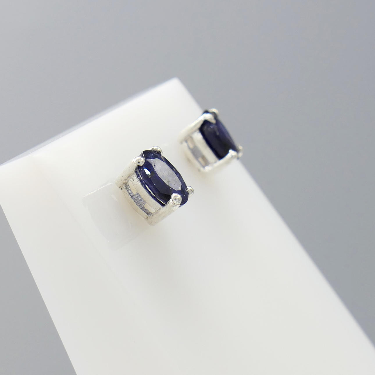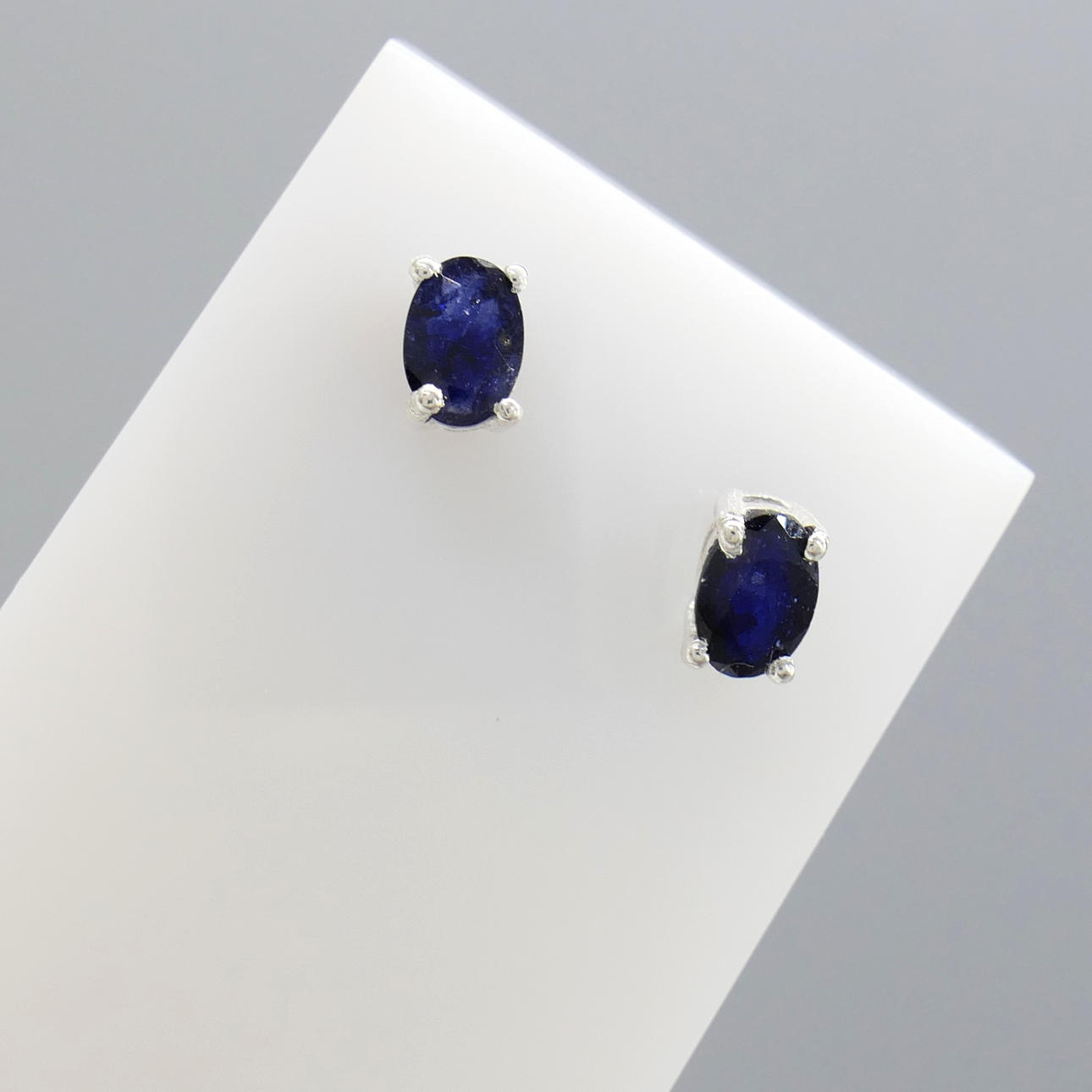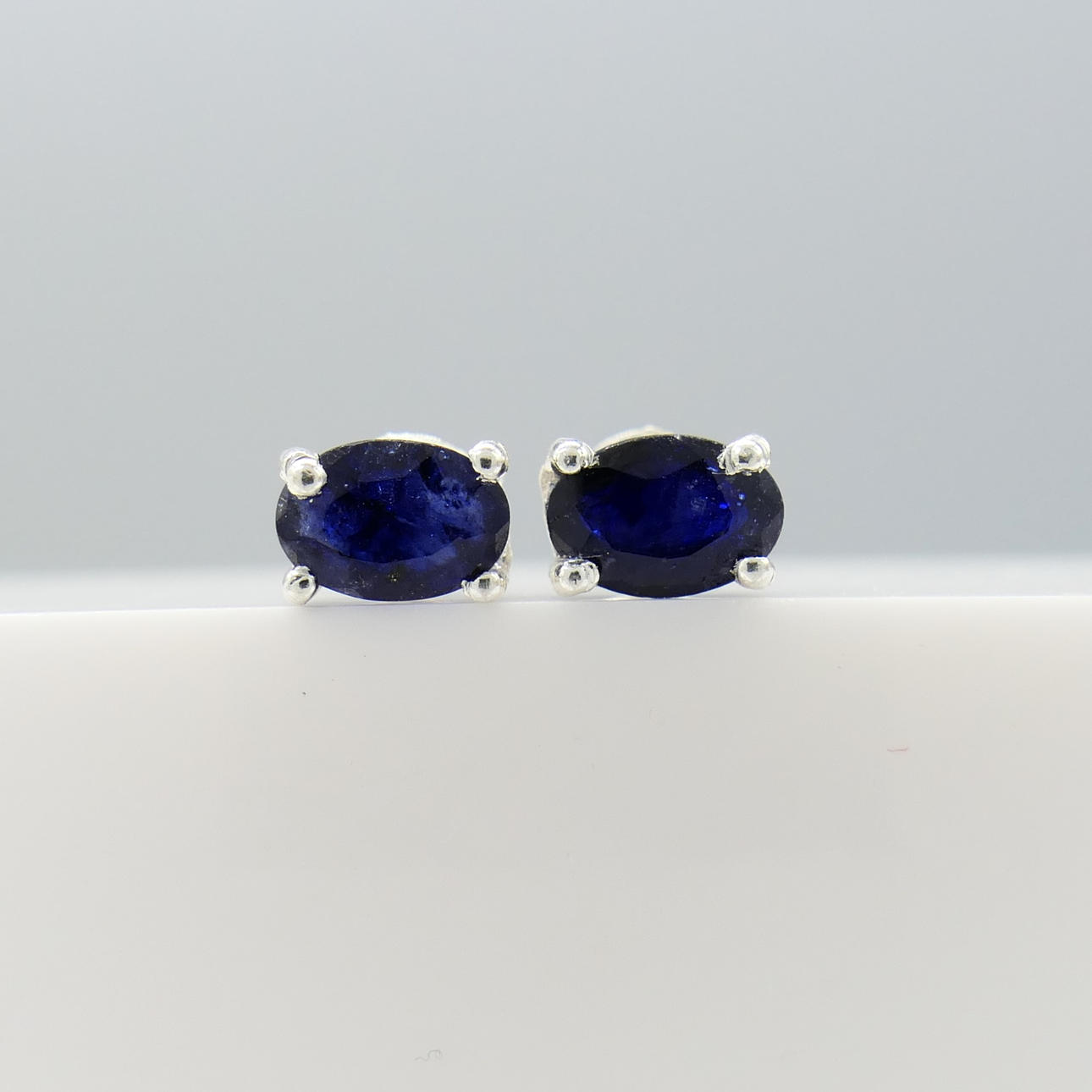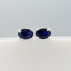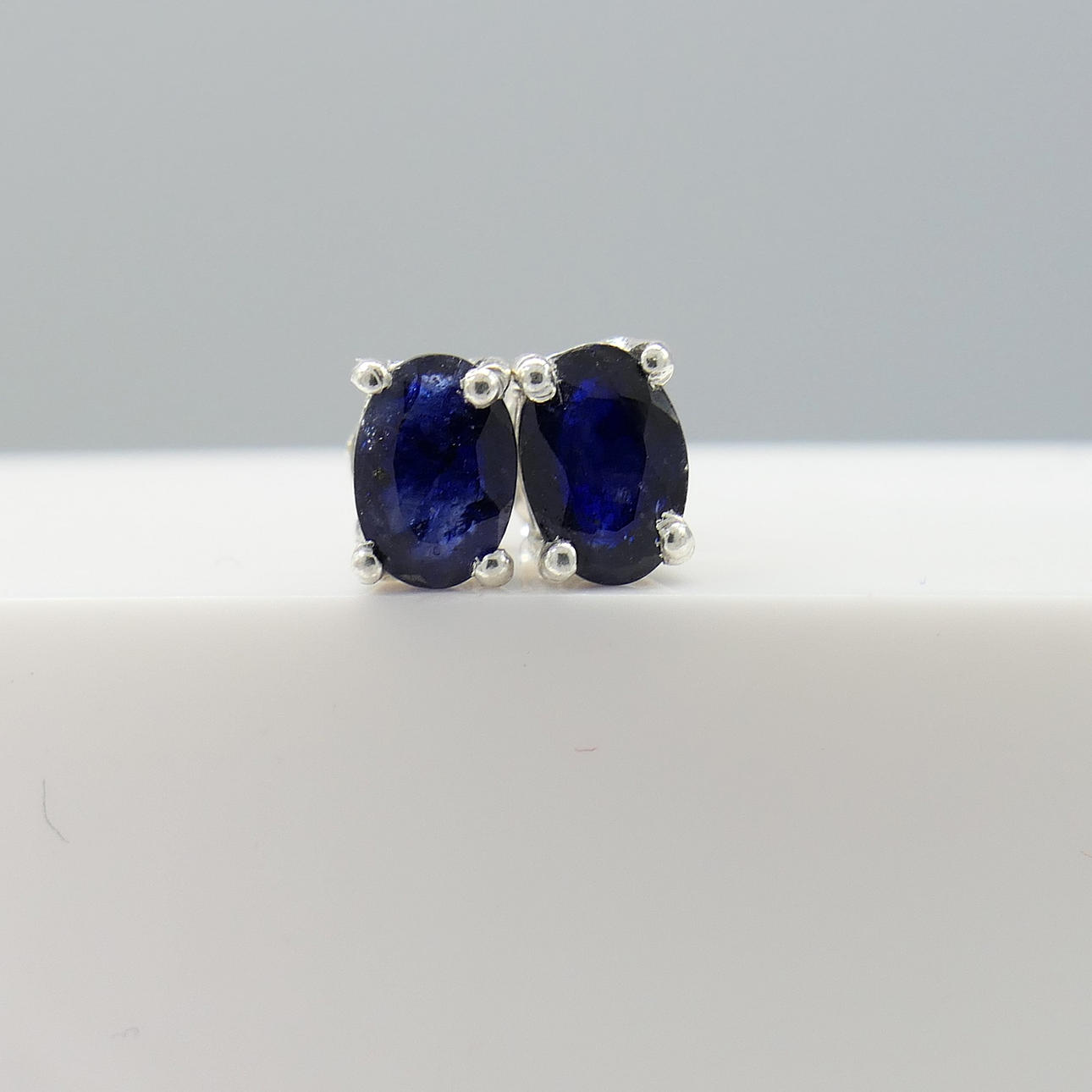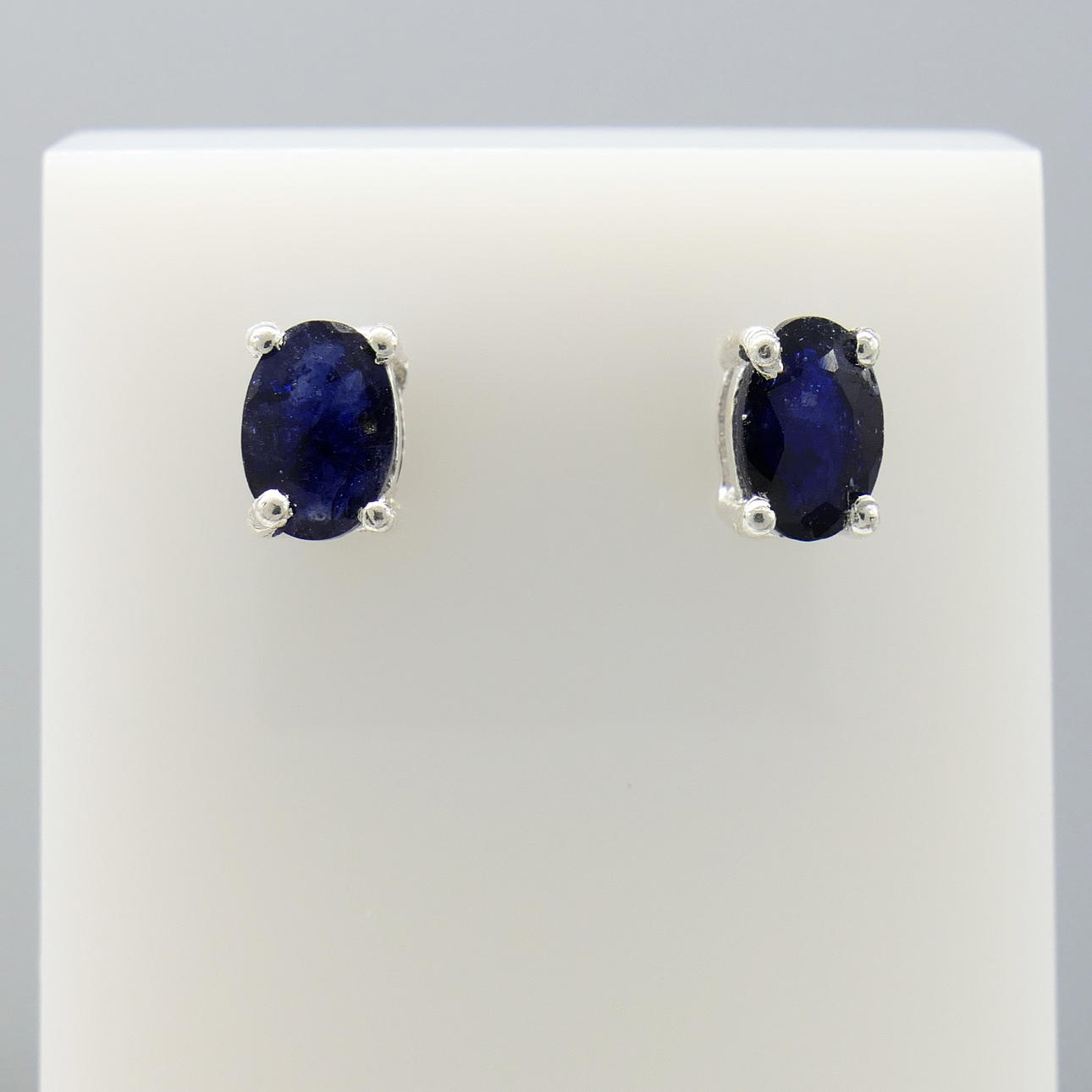 Sapphires: natural, treated; oval cut; 1.20 carats total, approx; 6x4mm each; claw set; dark blue
