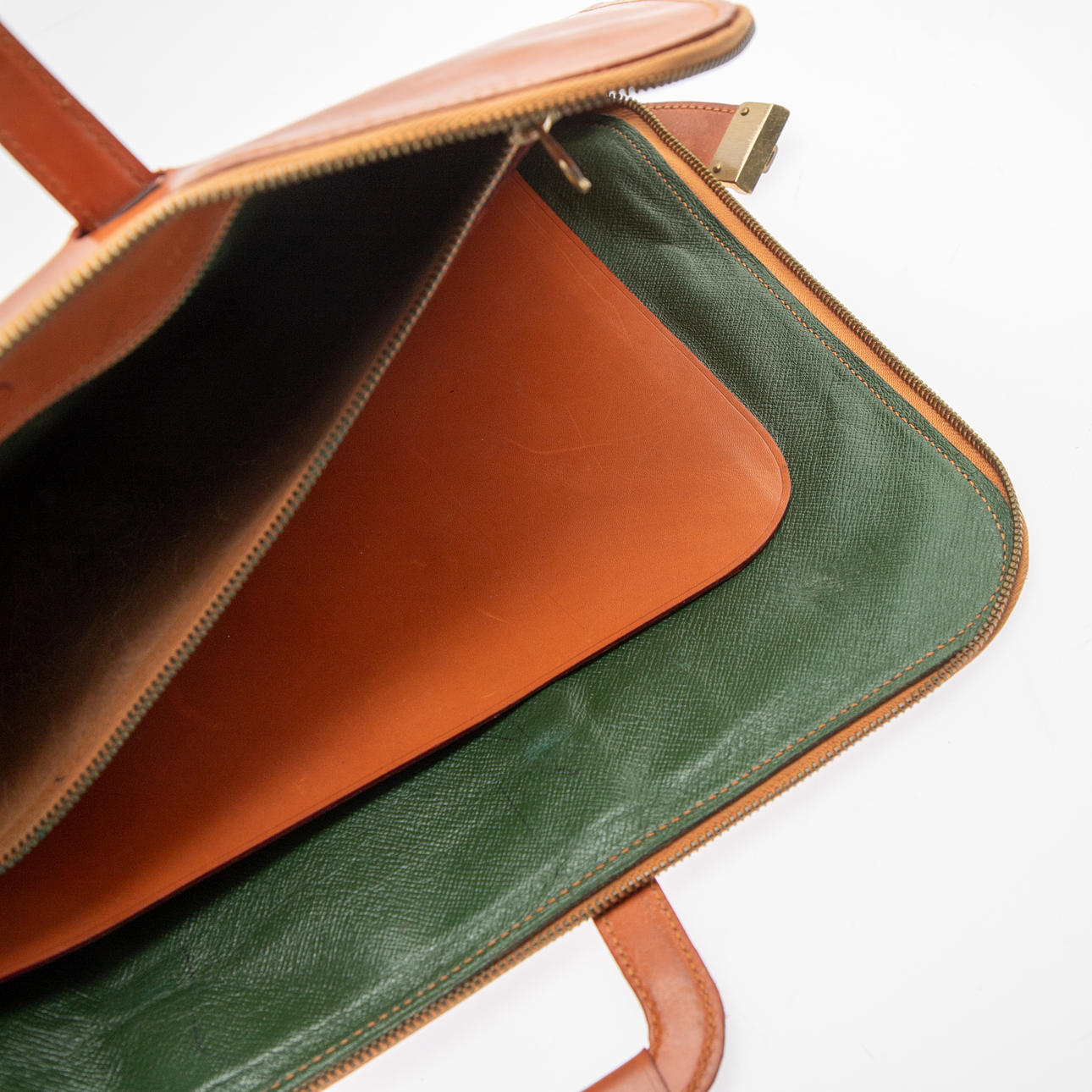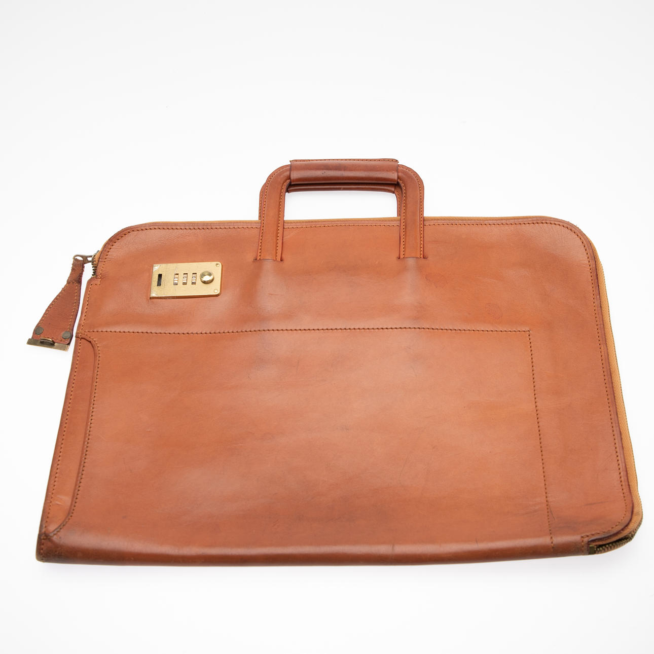 Signs of age and use. Leather with patina, slight scratches and rubbing. The combination lock doesn't work.