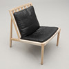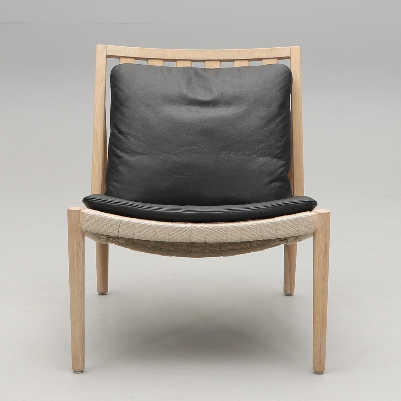 White oiled oak with saddle lining and loose plush oars upholstered with black leather. Seat height approx. 40, back height 77, width 62 cm.