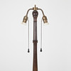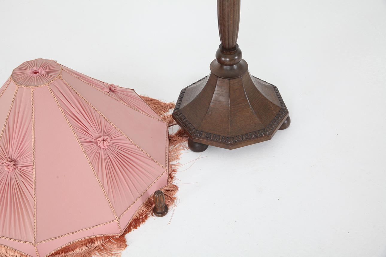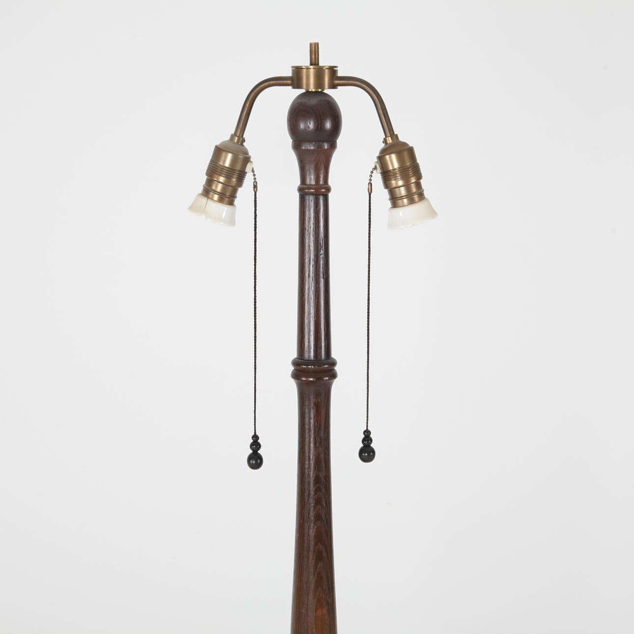 Floor lamp, turned oak, beech, ball feet, total height with shade 170 cm. Two internal light sources, porcelain sockets, pull chains as switches.