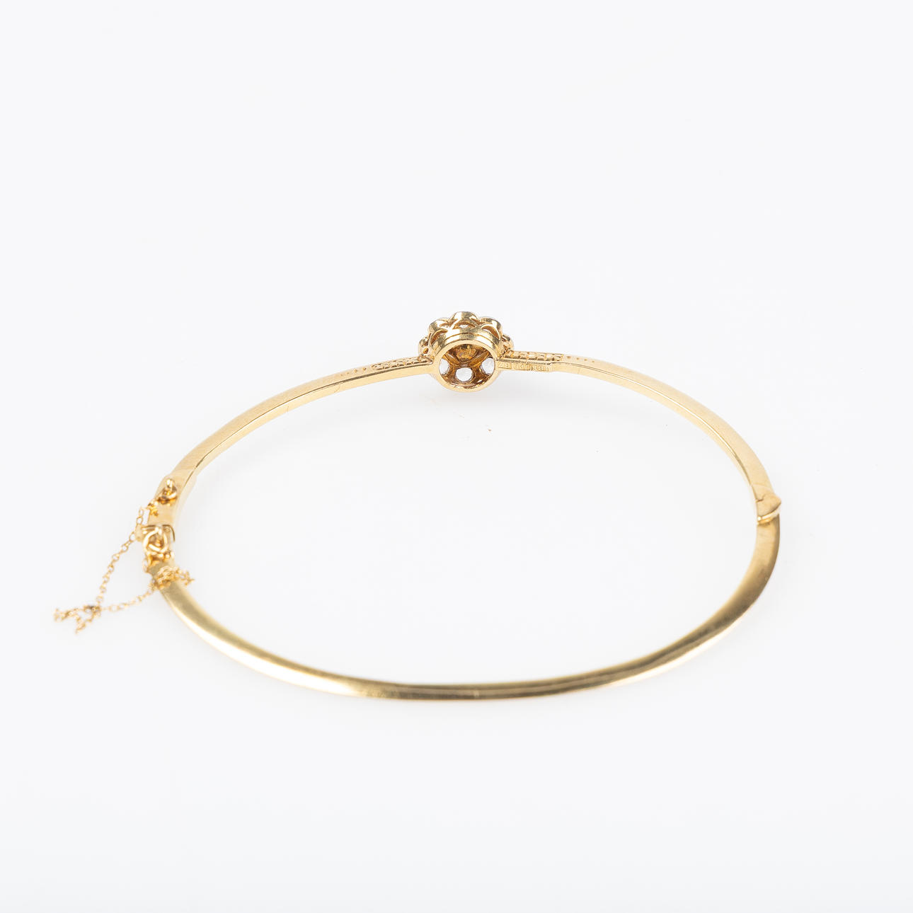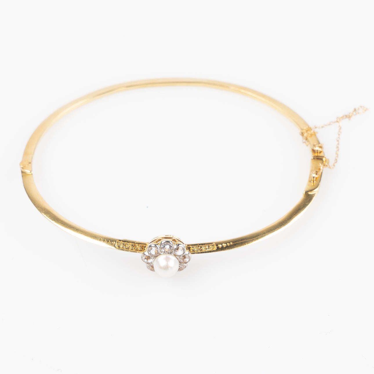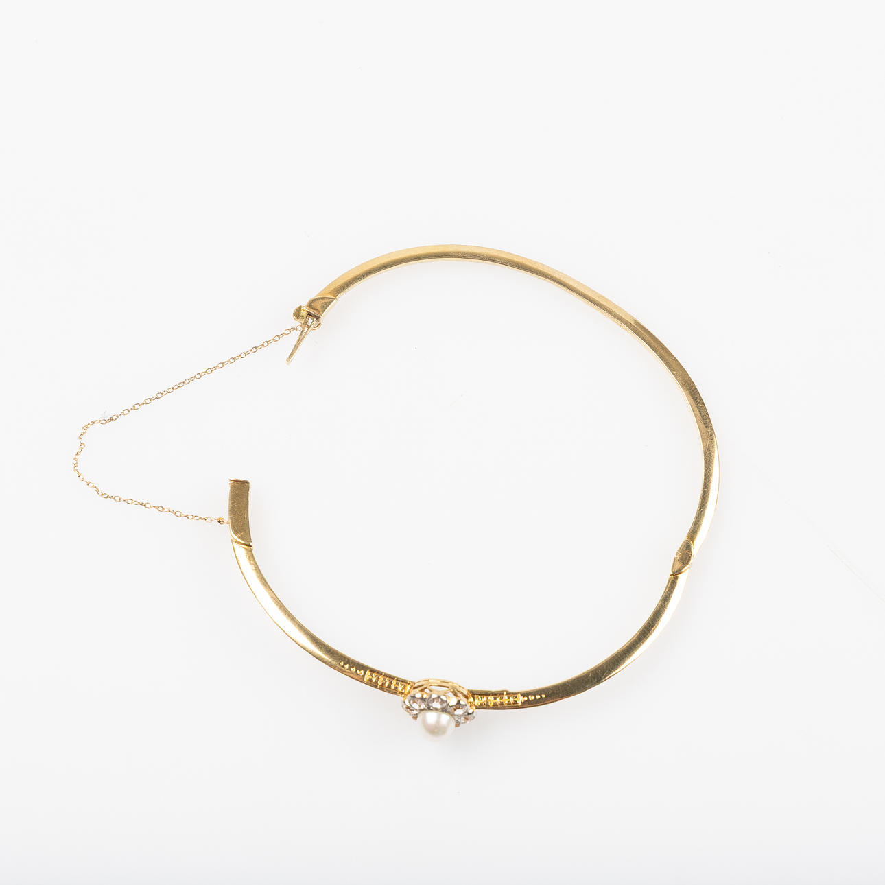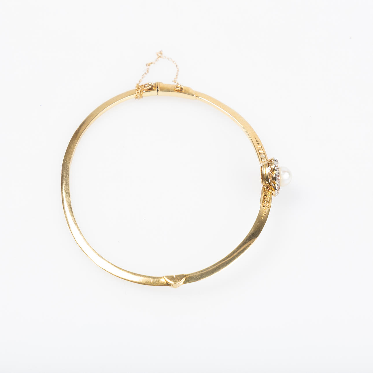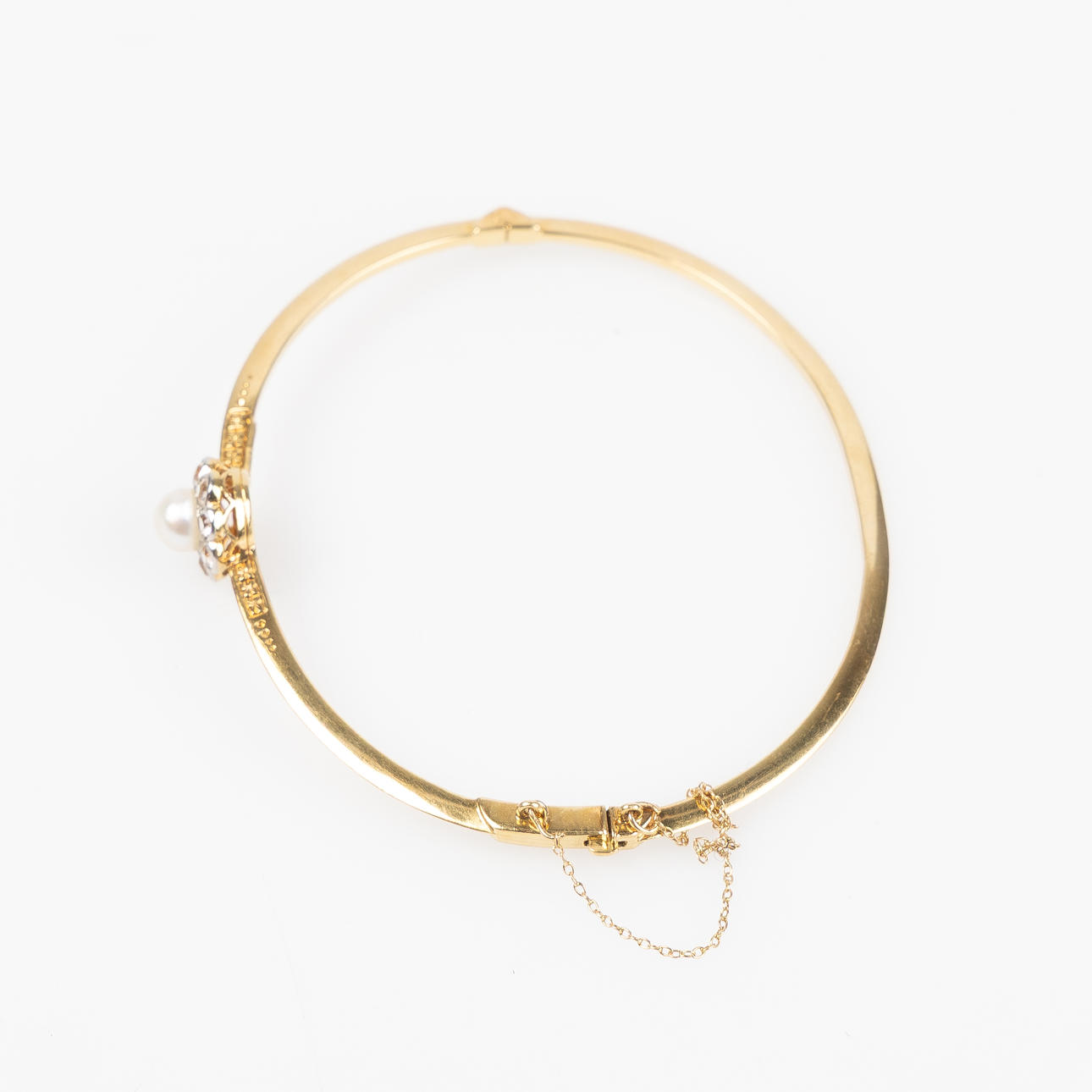 Framed with cultured pearl in a wreath of faceted spinels. Articulated model, chest lock with safety hook and chain. Stamped 'JPE'. Inner dimensions approx. 58x49 mm. Weight about 8.8 grams.