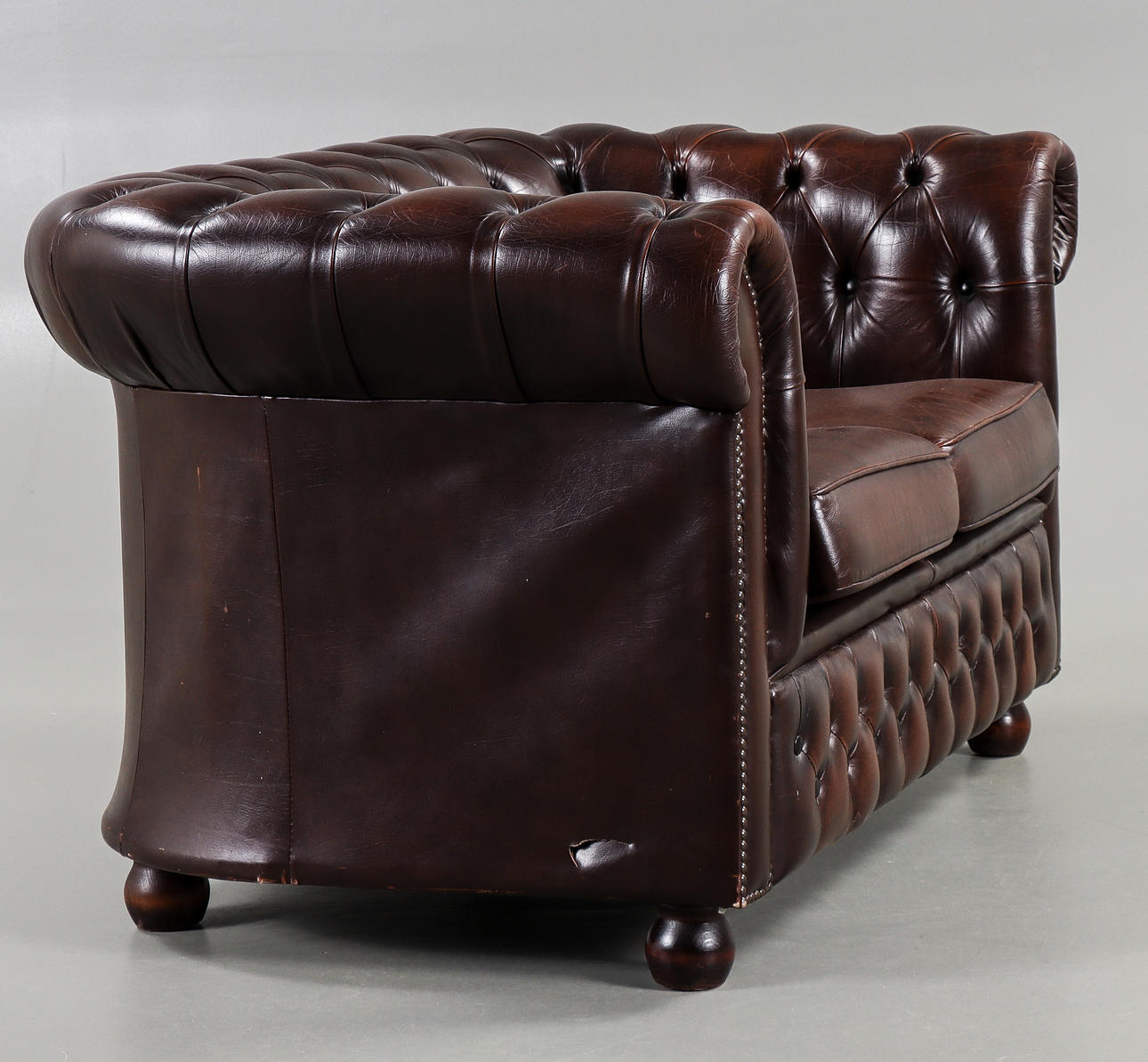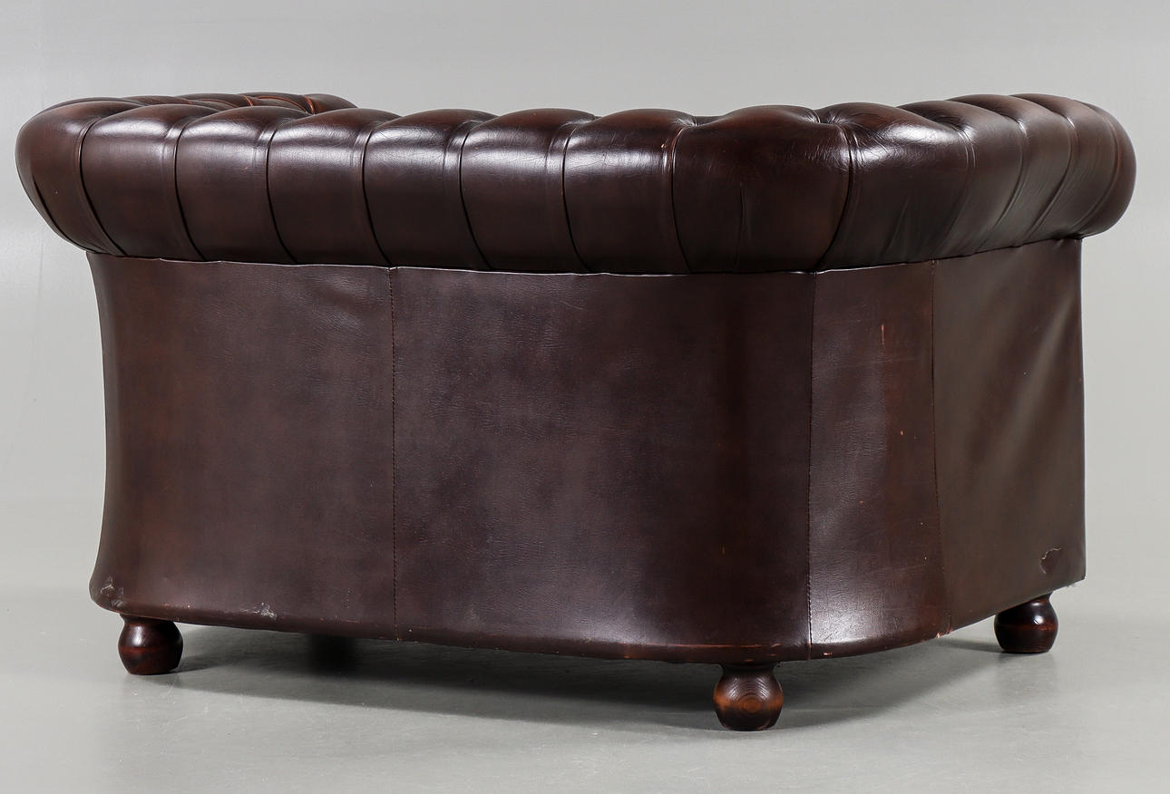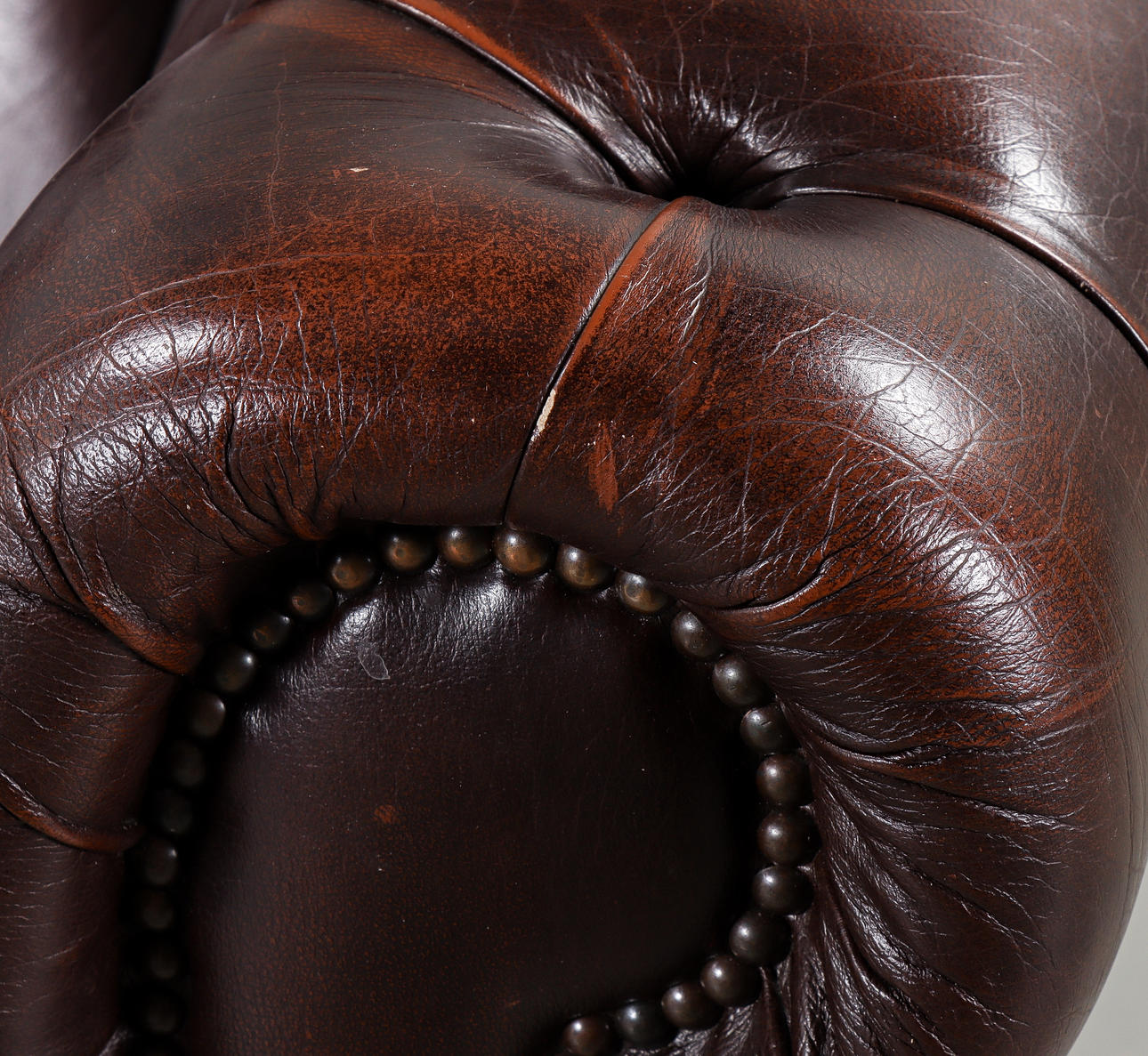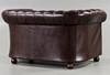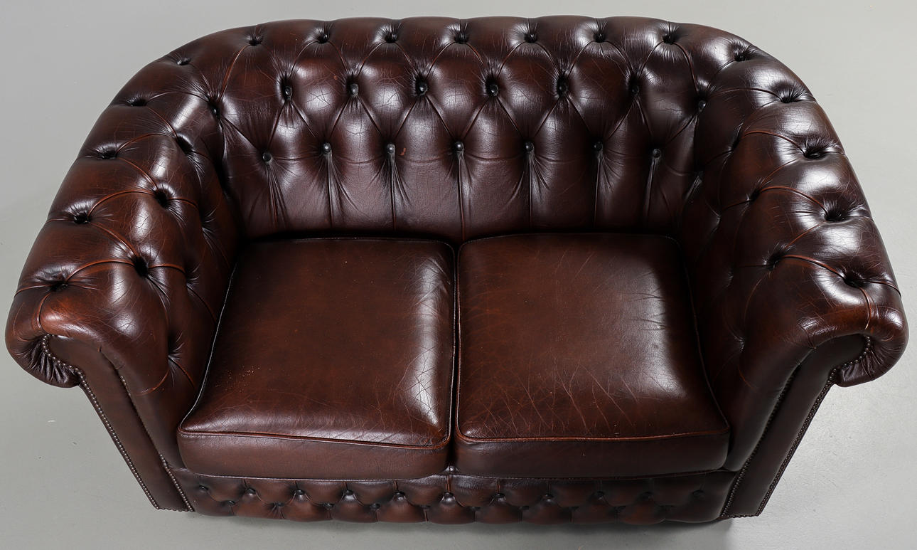 Brown leather upholstery with deep stitched buttons.