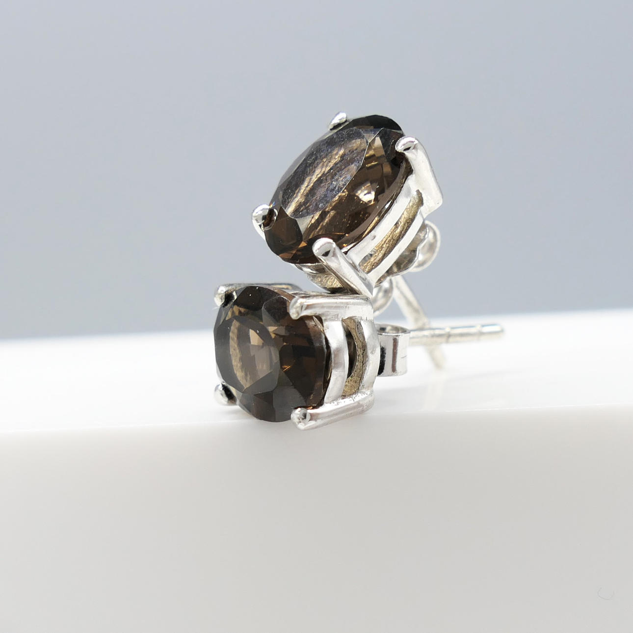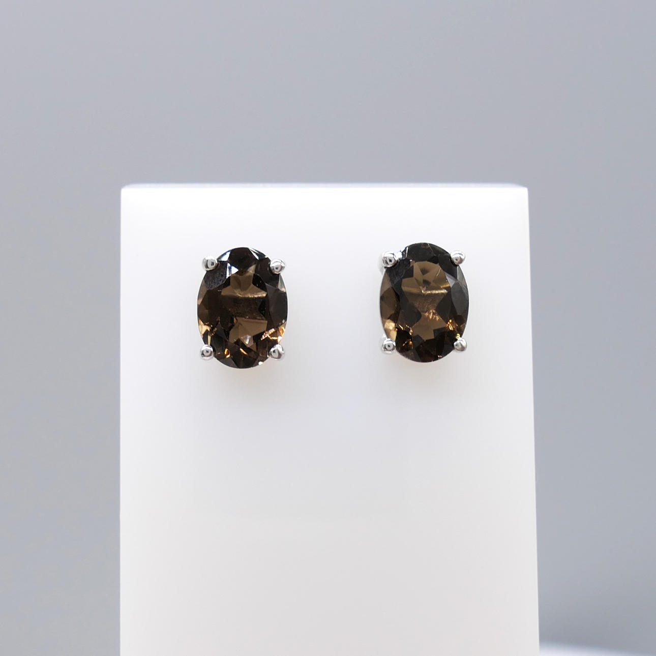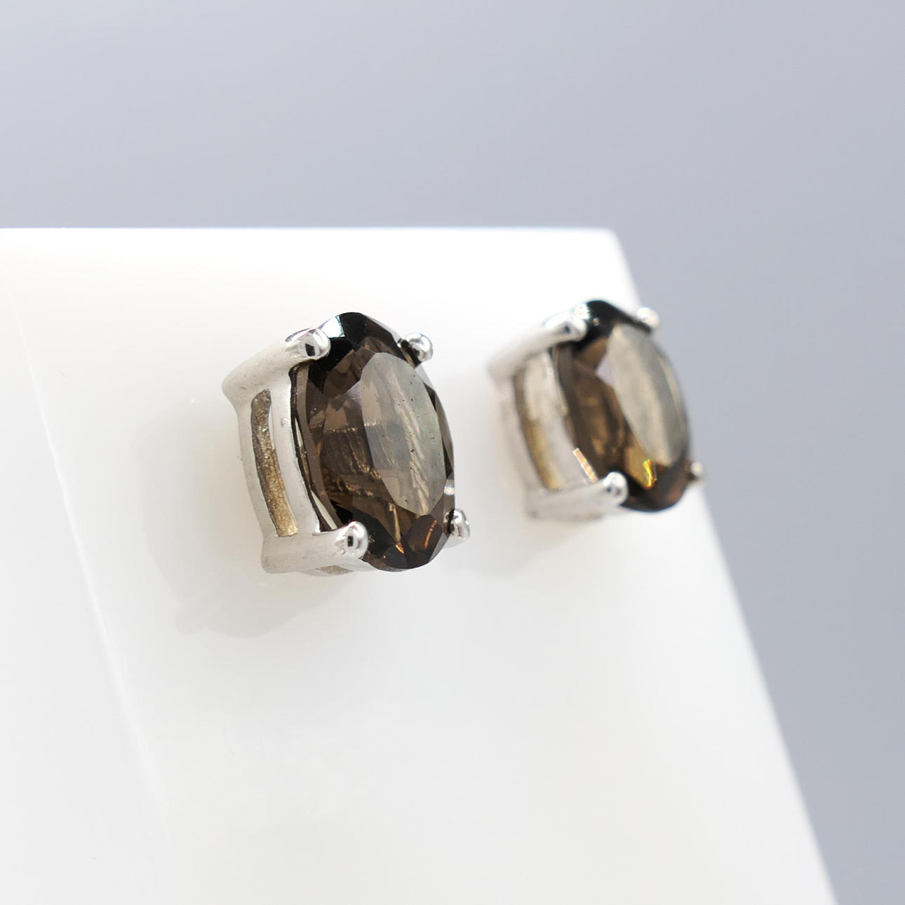 Gemstones: natural smoky quartz; 2 x oval cut; 1.50 carats total approx; greyish hazel brown tone