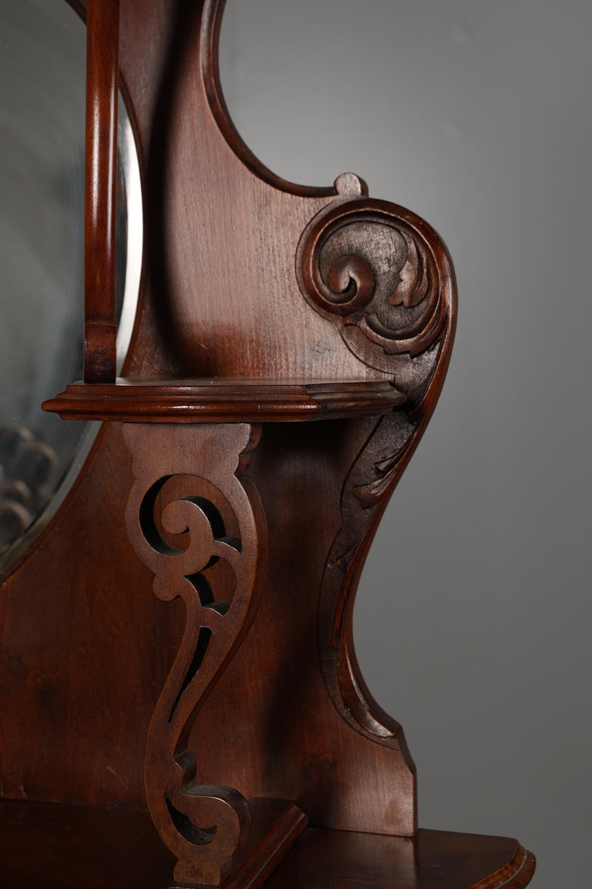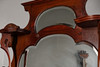 the shelf superstructure with two shaped bevelled subsidiary mirror plates and acanthus scroll rounded ends, raised on a lower section with blind fret frieze drawer and central bowed glazed door, flanked by inverted shaped shelves on slender cabriole legs, 203cm high, 122cm wide, 41cm deep.