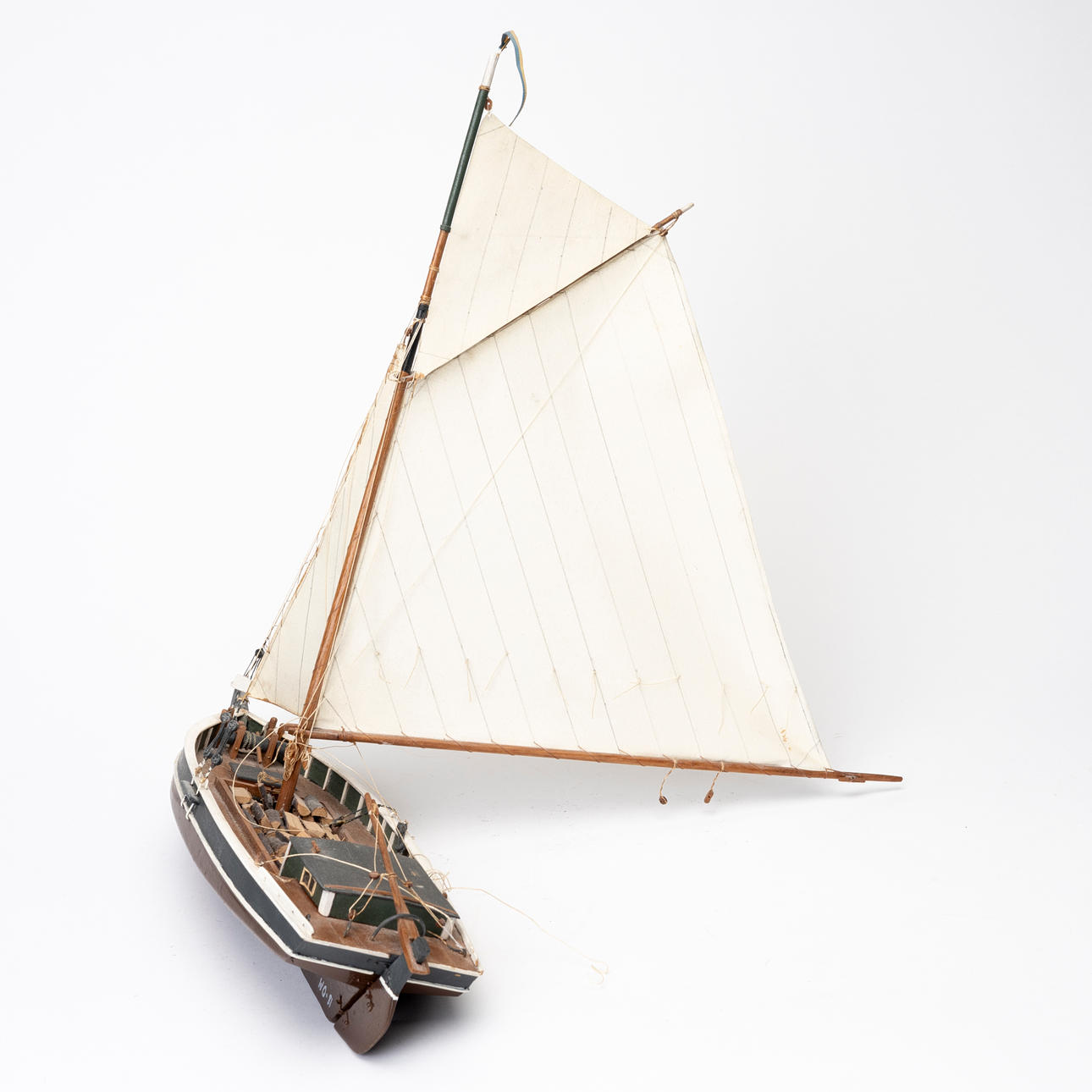 Sailing ship with transport of firewood, dated 81, length ca 35, height 43 cm.