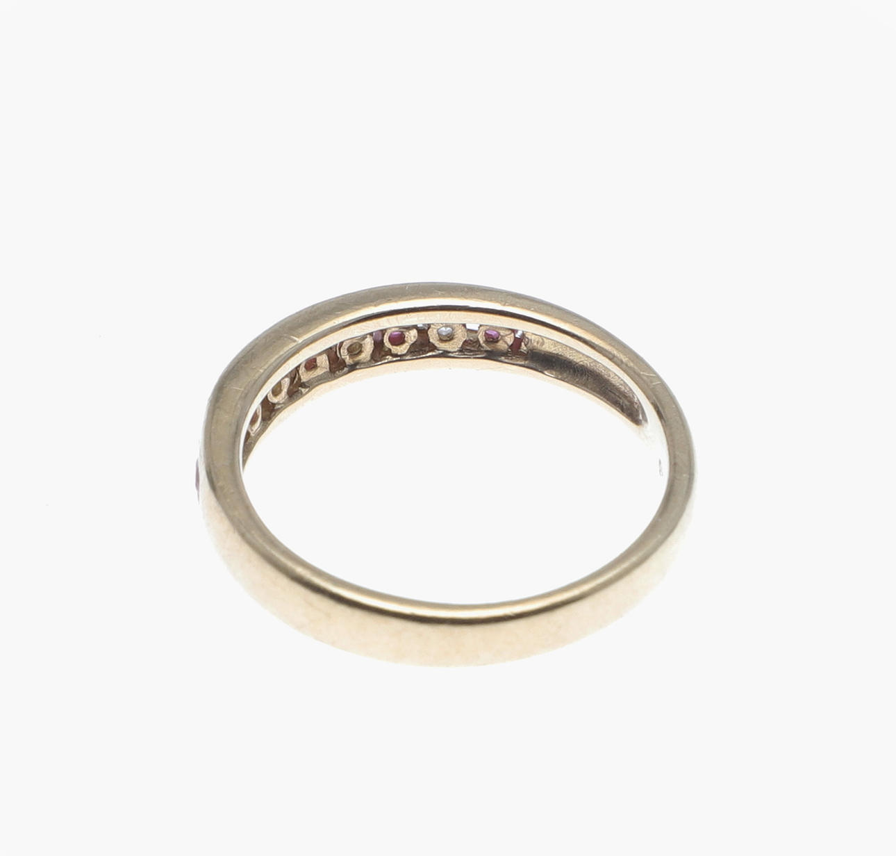 mounted with five circular-cut rubies and four circular-cut diamonds, in 9ct gold, 2.5 grams. Size L.