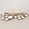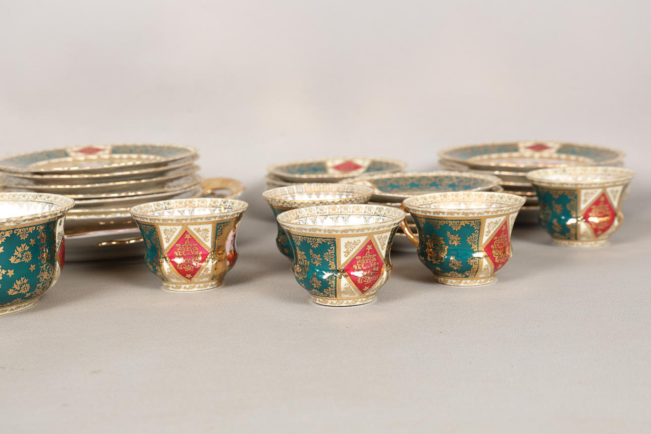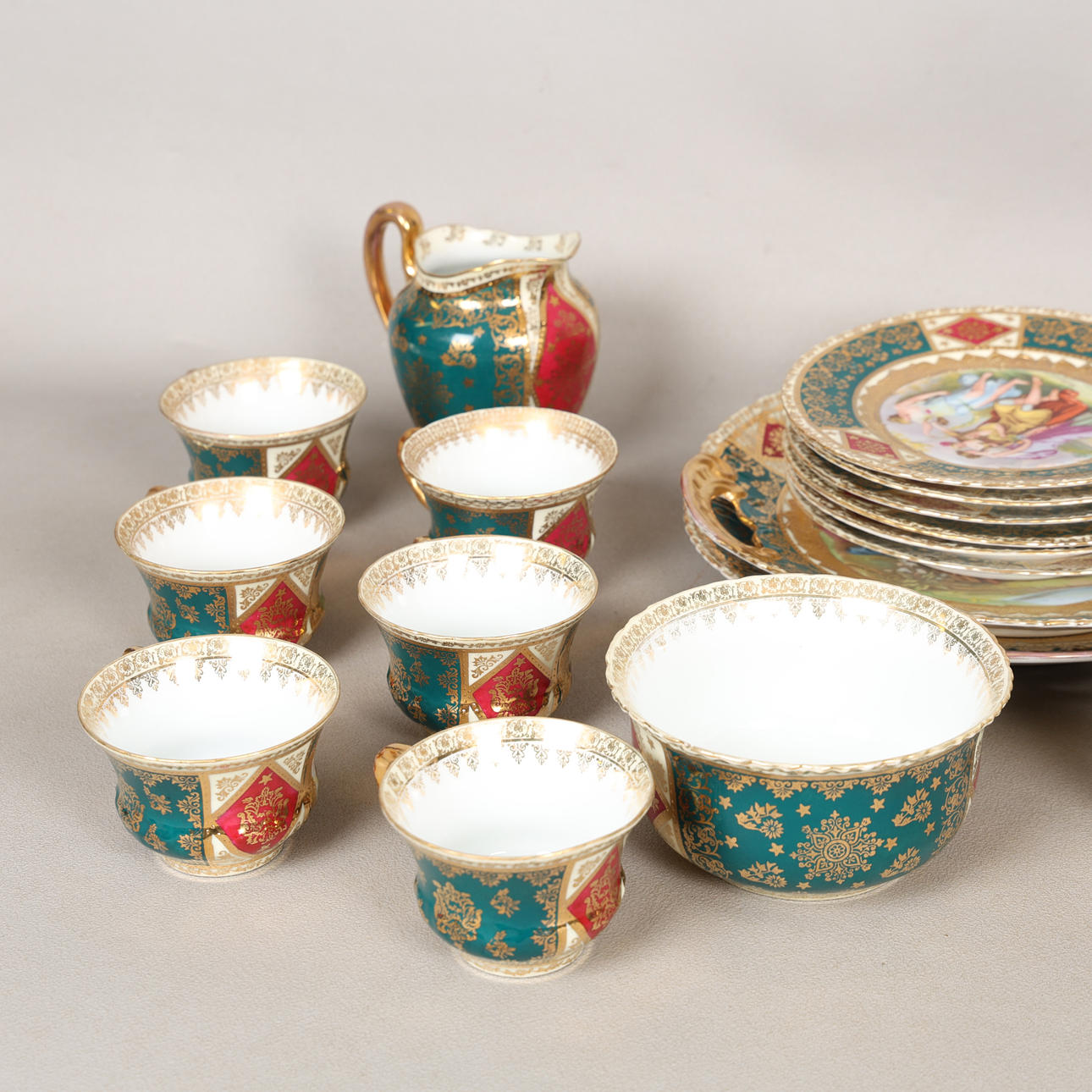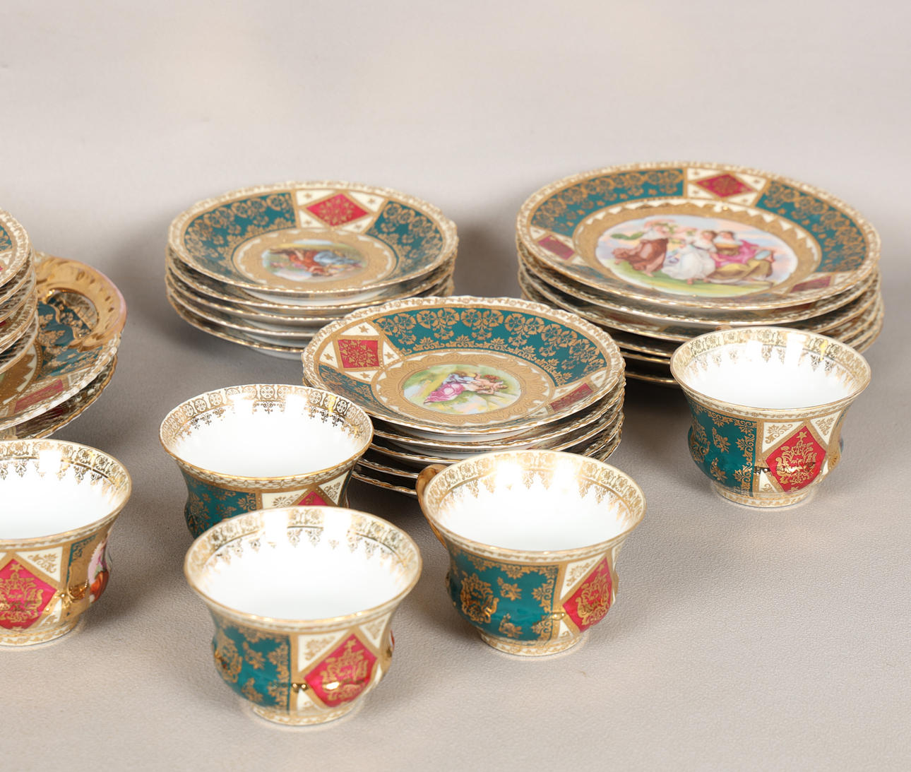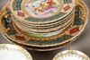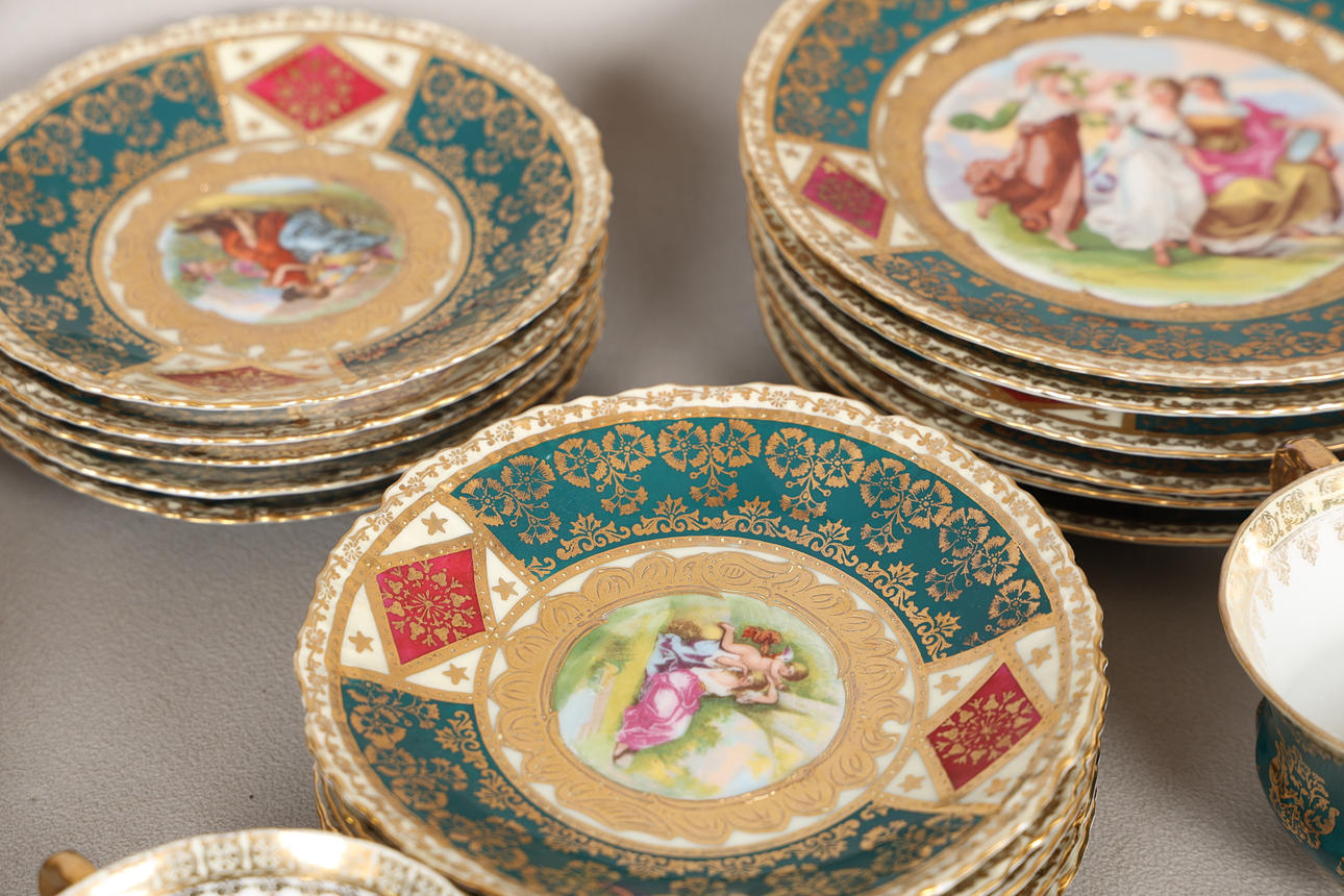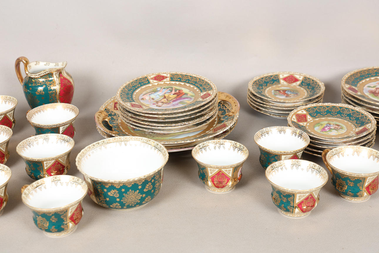 decorated with Romanticised scenes, after Watteau, within green and gilt borders, including two cake plates, a slop bowl, eleven tea cups, ten saucers, a milk jug and twelve tea plates, blue beehive mark, (37).