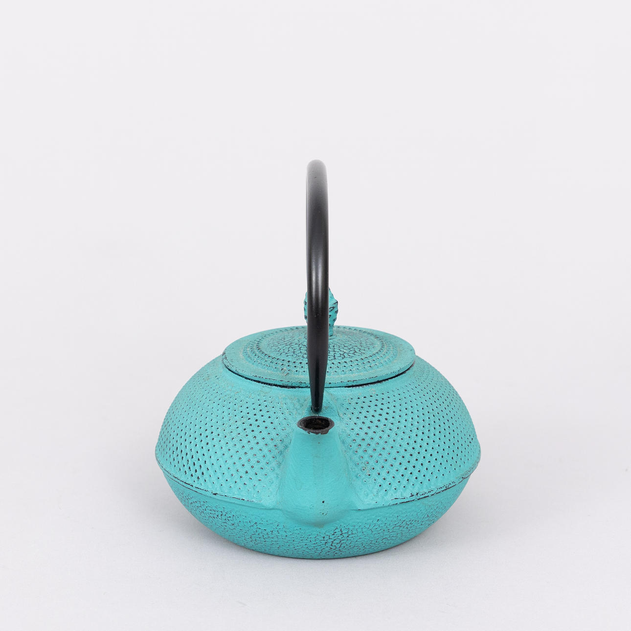 A teapot, cast iron, turquoise, probably Japan.