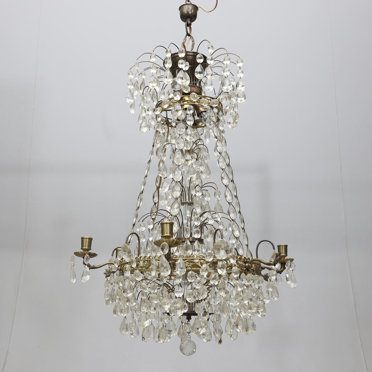 Frame in brass, lined with prisms. Six candle holders, six electric light points. Diameter ca 56, height 75 cm. excl. chain.
