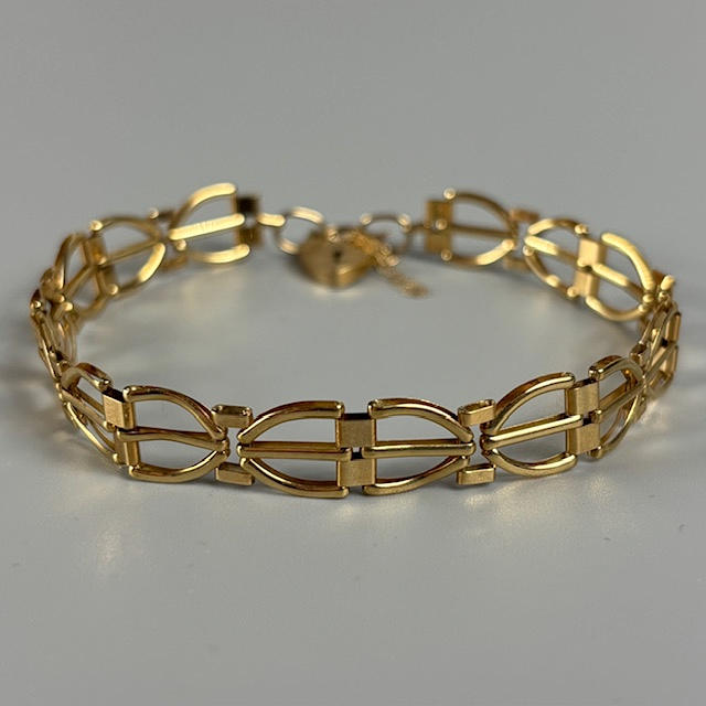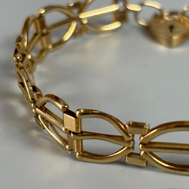 A 9ct Gold bracelet with 9ct Gold heart shaped lock and hinged links withe delicate safety chain approx 5.5g.
