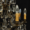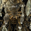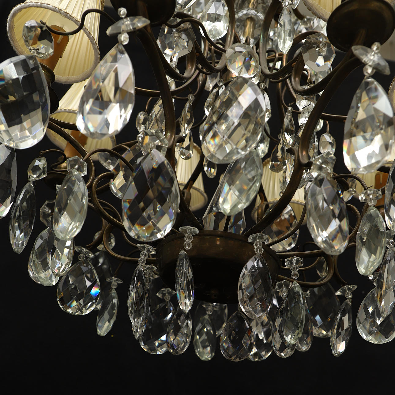 Cage-shaped frame in patinated metal, 4+8 light points, cut drop-shaped prisms. Total height 95 cm, diam 60 cm.