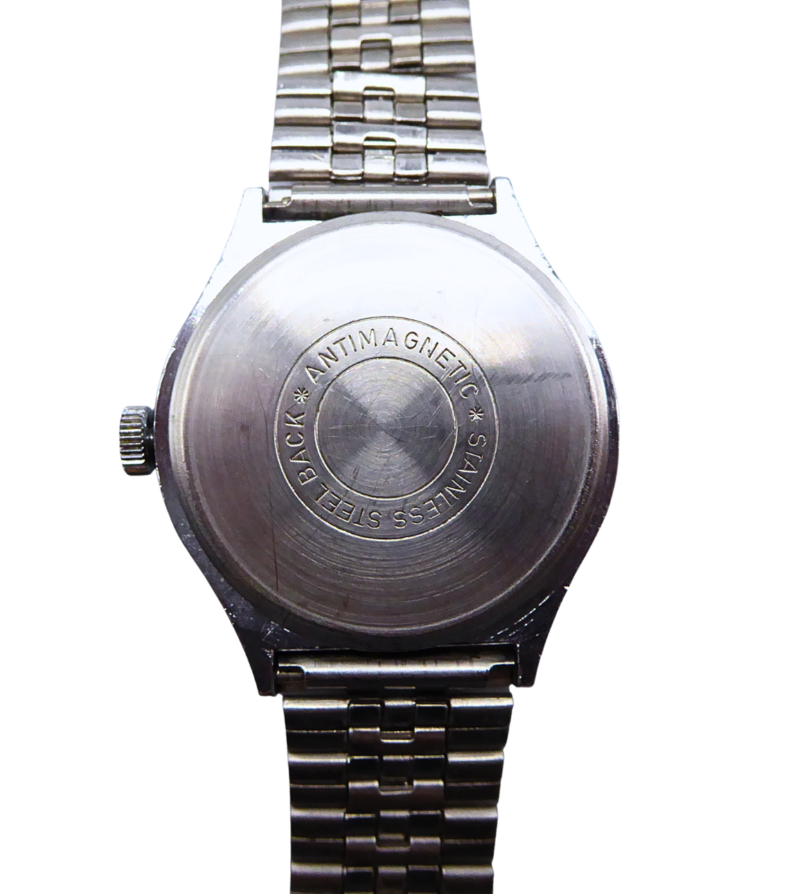 An Anker 100 Shockproof men's wristwatch made of metal. The caseback is made of stainless steel.